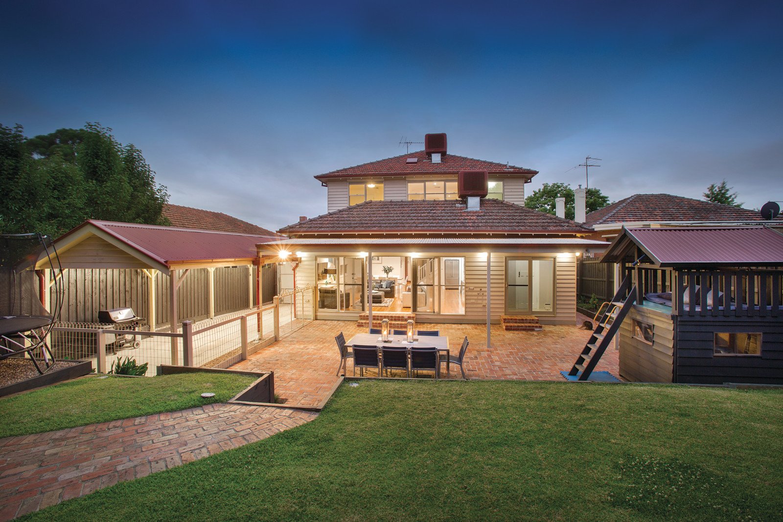 The interior has an expansive open living precinct incorporating a cutting-edge gourmet kitchen with ample Caesar Stone bench space, Miele dishwasher, cooktop and ovens plus an in-built pizza oven and Butlers pantry, adjacent laundry and mud room all flowing to a private outdoor entertaining area which can include the carport when the weather dictates. Additionally, it has very modern stylish contemporary living to traditional front rooms which feature dark timber joinery, leadlight glass, decorative ceilings and glossy timber and parquetry floors; with the accommodation comprising formal sitting room with adjacent dining, study and renovated period-style bathroom. Complemented by four upstairs bedrooms, main with WIR and ensuite plus an upstairs retreat and bathroom. Other features include alarm, OFPs, hydronic heating, evaporative cooling, ducted vacuum, high quality fixtures & fittings, remote tandem carport plus off-street parking.