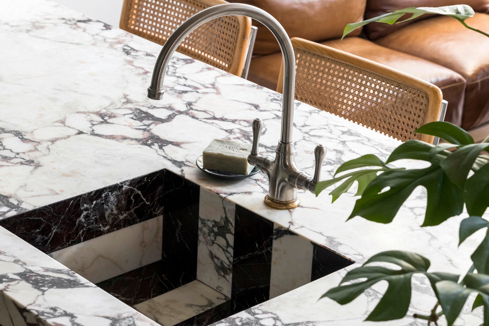 Cathedral ceilings with clerestory windows feature in the open plan living and dining room, served by a premium gourmet kitchen appointed with Calacatta Viola marble, bespoke marble striped sink, Bosch appliances and Asher Waller tapware. Two sets of double doors take the living out to an idyllic landscaped private garden with large, decked area for al fresco dining.