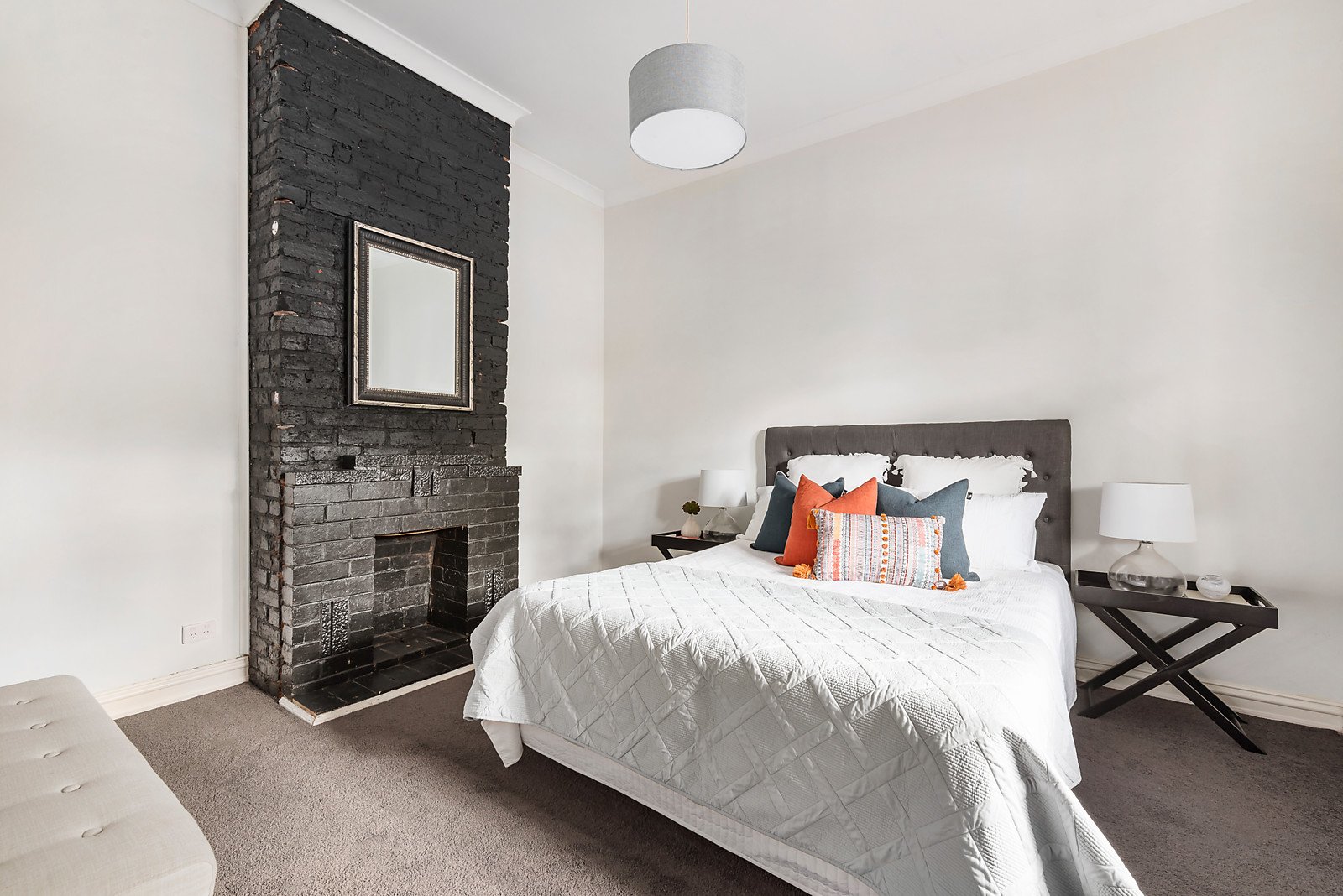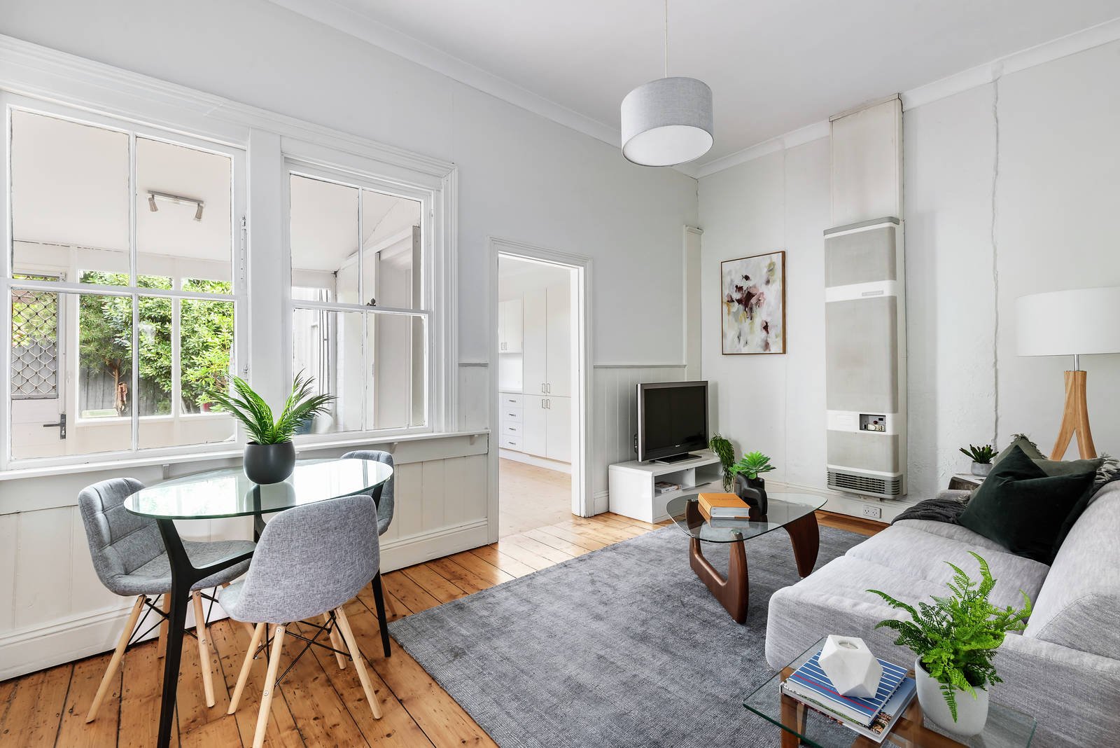 Baltic pine floors flow through the central hall, generous living and dining room, a well-appointed separate kitchen and sun-room opening to the private paved leafy garden with a studio and laundry. The main bedroom with open fire is accompanied by two additional bedrooms and a bright modern bathroom.