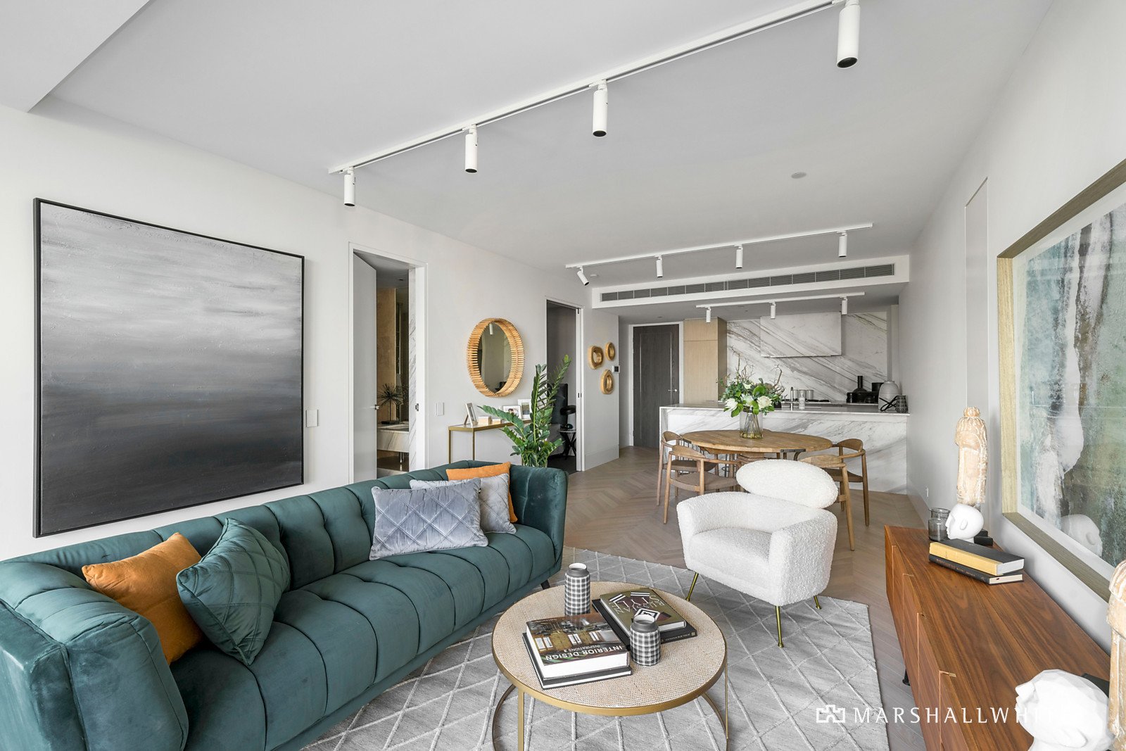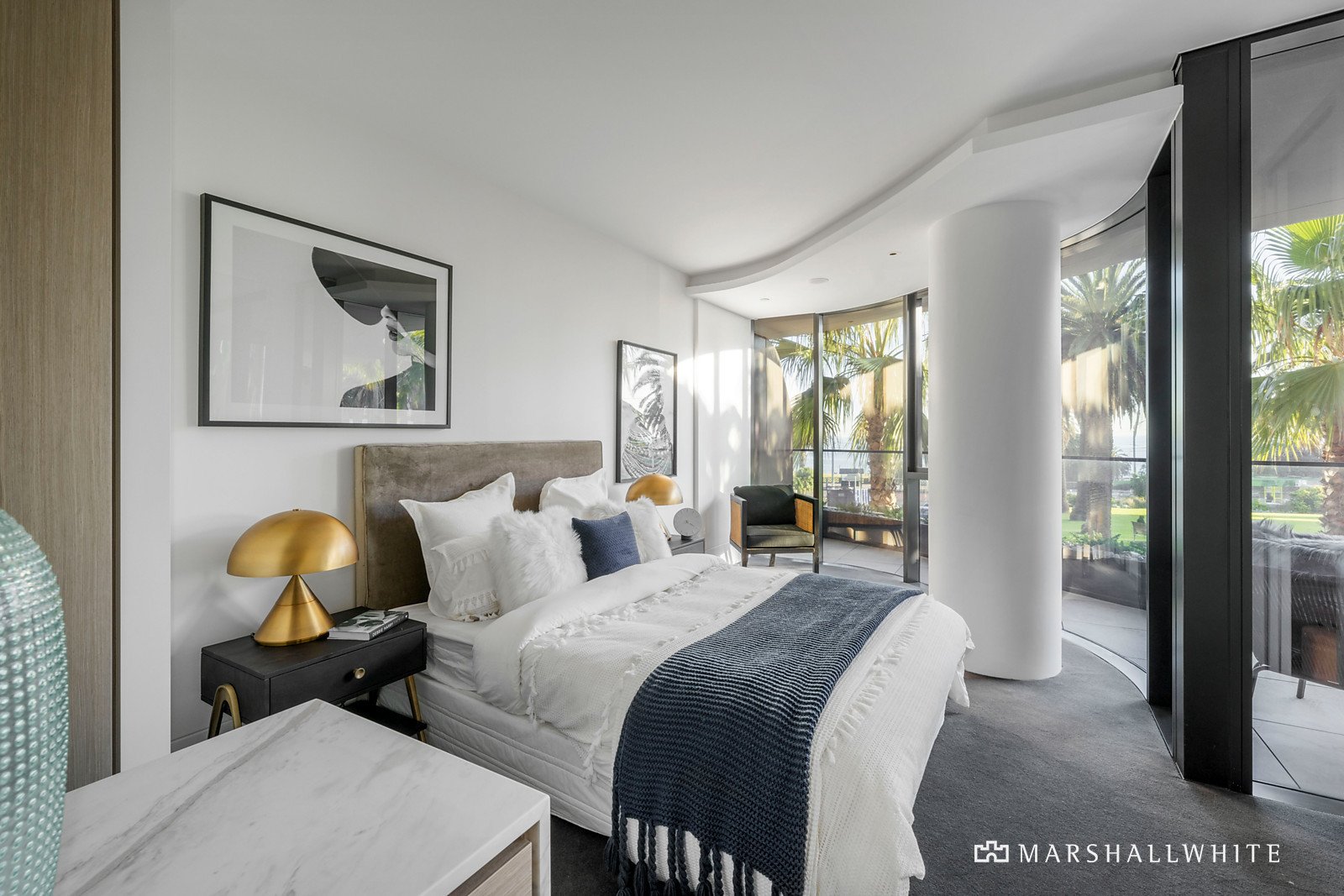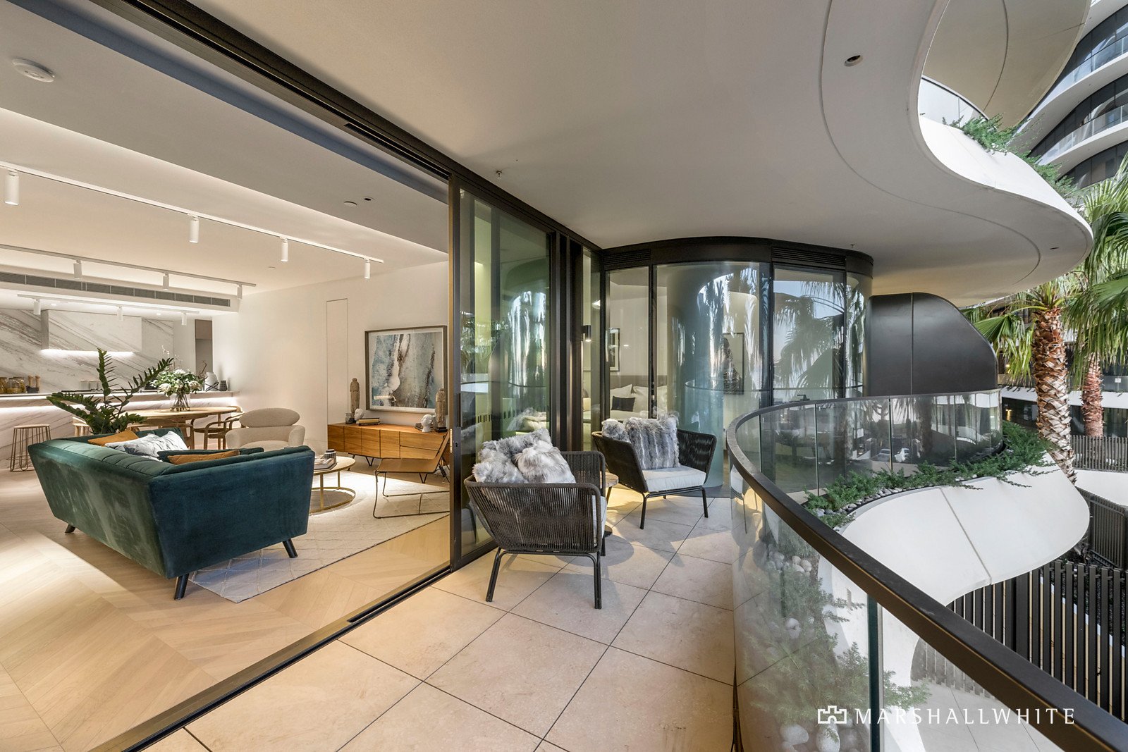 From the exclusive views to the designer finishes, the apartment's elite waterfront position is met with chevron timber floors, walls of curvaceous glass, lavish marble surfaces and the crisp cool breeze from the alfresco terrace. The open-plan living and dining zone is an idyllic setting for both relaxation and entertaining, enriched by a premium Gaggenau-appointed kitchen adorned with marble waterfall benchtops and matching splashbacks.