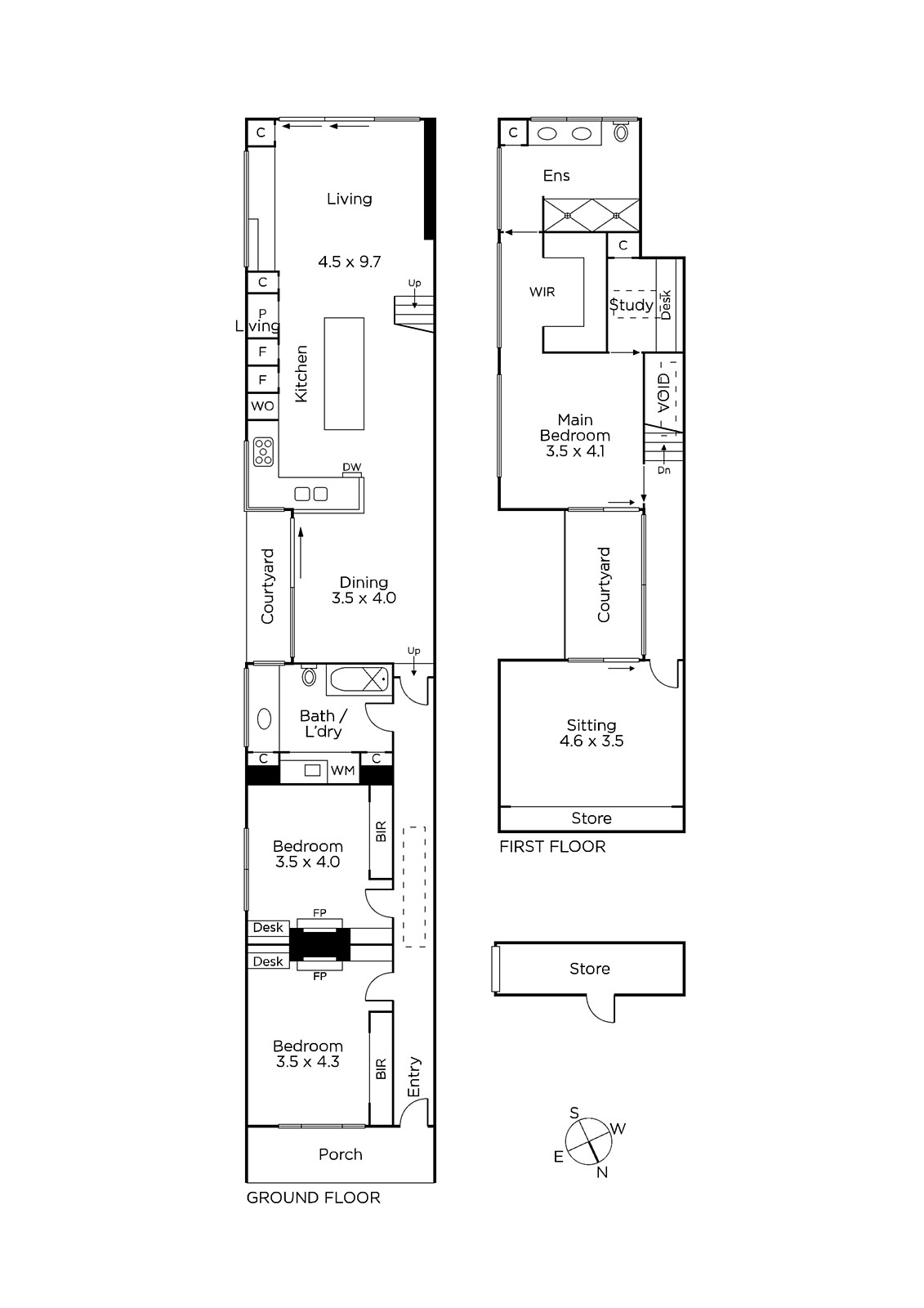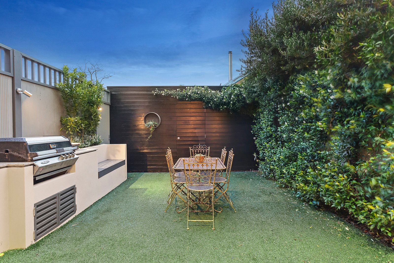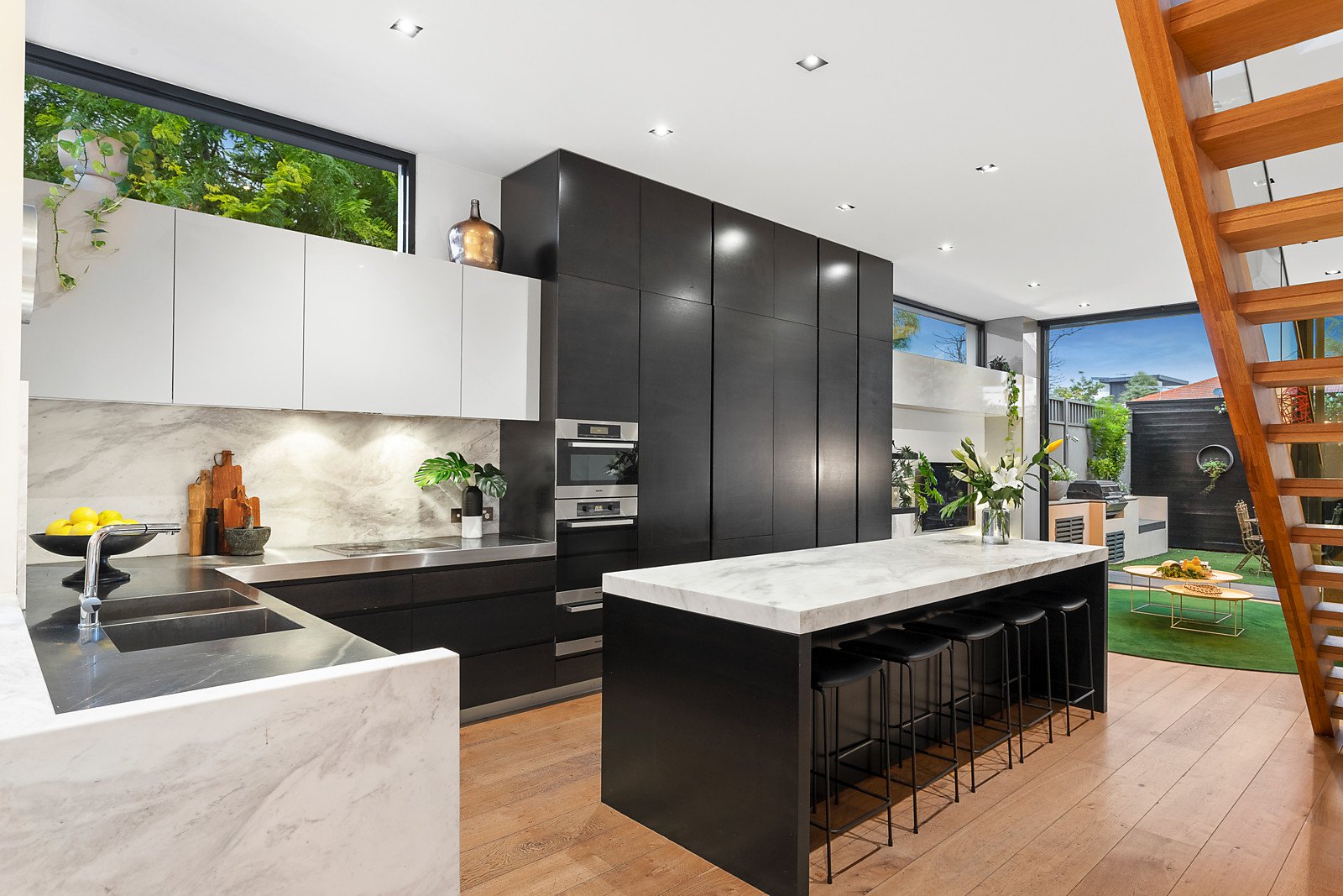 Wide oak floors flow through the arched sky lit hallway to a light-filled dining area opening to a tranquil courtyard and a sublime Miele kitchen with marble and stainless steel benches and integrated fridge/freezer. A generous living space opens through full width glass sliders to a private leafy courtyard with BBQ and outdoor shower. Two gorgeous bedrooms with fireplaces and built in robes and a stylish bathroom are downstairs. Timber stairs lead up to the stunning main bedroom with walk in robe and designer en suite, a fitted study, versatile retreat or 4th bedroom with storage and a private rooftop terrace.