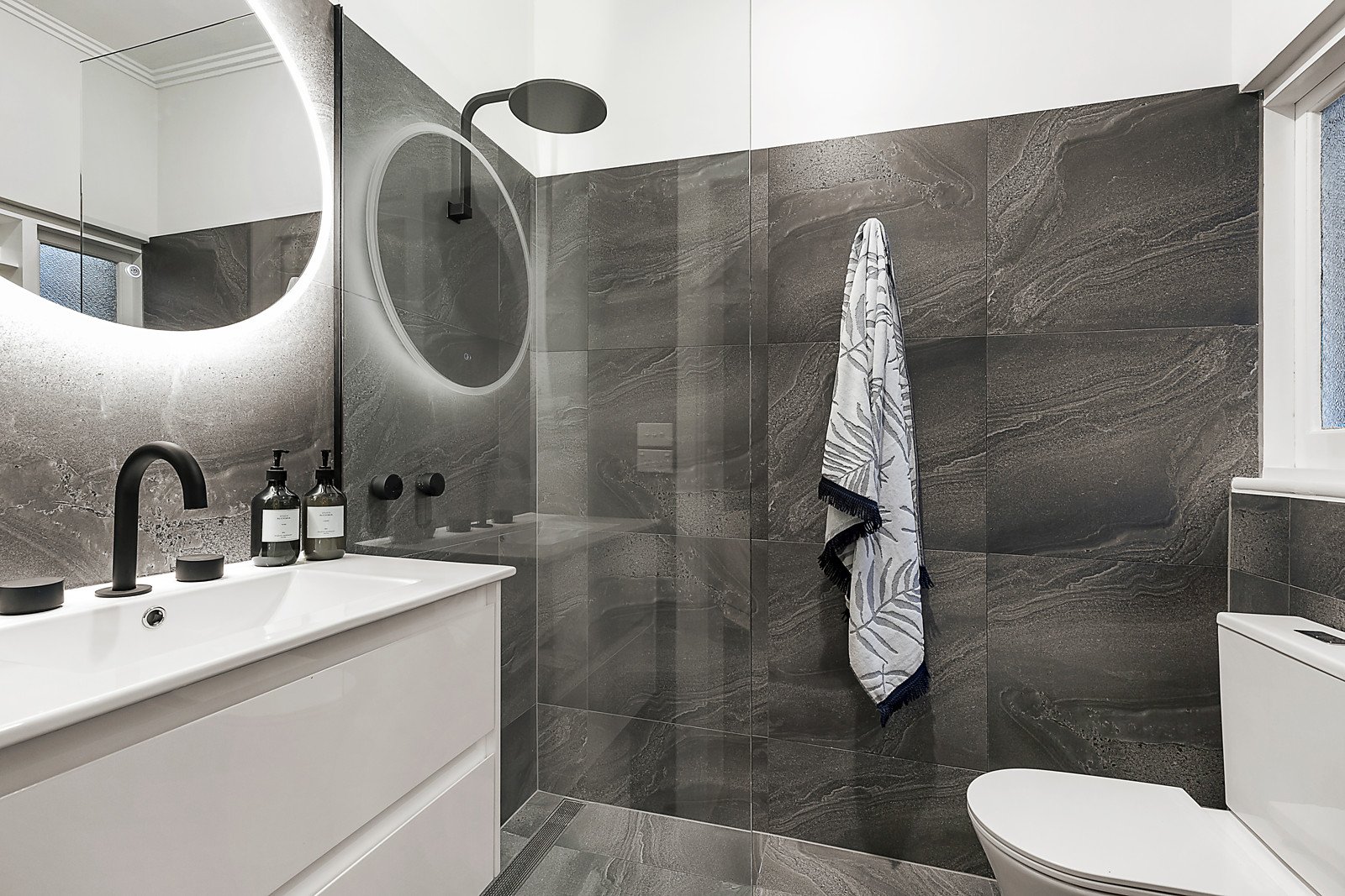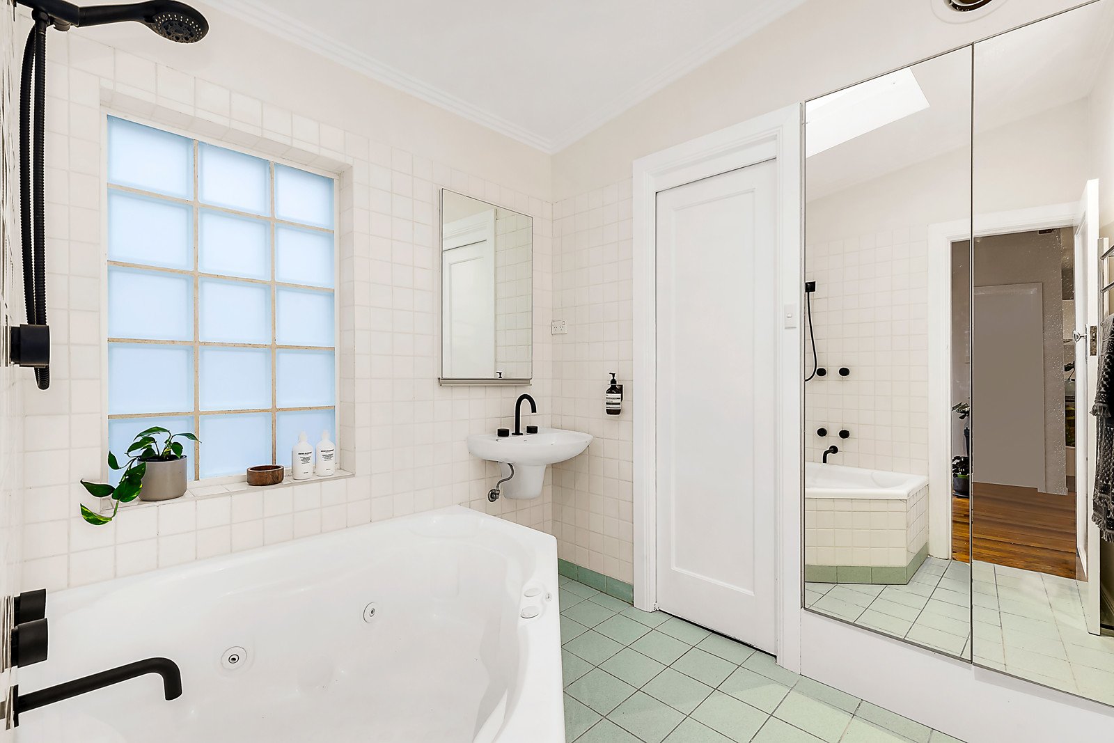 The main bedroom with double glazed windows showcases mirrored built in robes and a brand new ensuite fitted with matte black fixtures and is complemented by two additional bedrooms, including one with robes plus a skylit family bathroom with spa bath and European laundry.