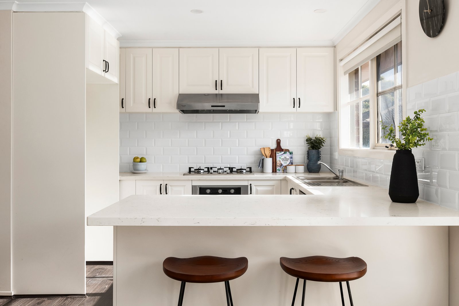 Open, airy and filled with natural light, the home’s heart is an open-plan dining / living room and a semi-attached lounge, all of which is underpinned by an updated and subway-tiled kitchen with stone benches and stainless steel appliances. Large glass doors slide back to extend the open-plan outdoors to an undercover deck and paved courtyard that wrap around to greet the northern sun, while a second sun-drenched deck is certain to exceed the expectations of the proudest of entertainers.