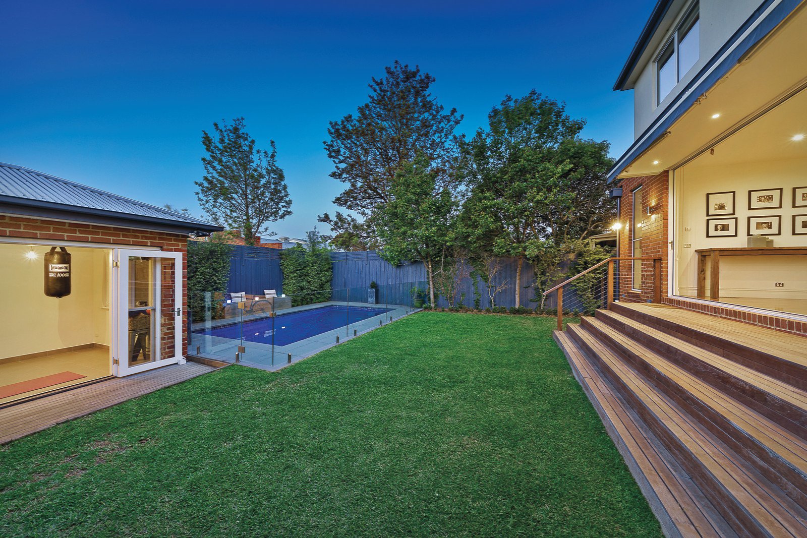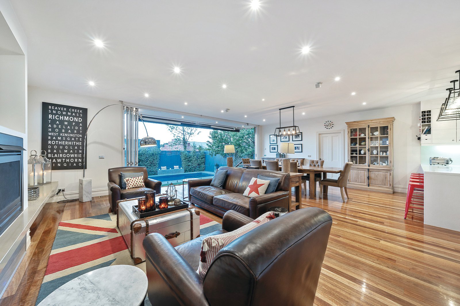A glorious arched hallway featuring high ceilings and Baltic pine floors creates a memorable first impression matched by a beautiful sitting room with slate open fire. Solid spotted gum timber floors flow through the exceptionally spacious living and dining room with a sleek gourmet kitchen boasting Caesarstone benches, Smeg stove and microwave/grill and walk in pantry with office/study nook. Bi-fold doors open the living spaces (with a Jet Master HeatnGlo with Caesarstone surrounds) to a completely picturesque private north-facing garden with solar heated pool with bluestone paving, retractable rear sprinklers, built-in BBQ and cabana or gym with kitchenette. The gorgeous main bedroom with Carrara marble fireplace, walk in robe and chic en-suite, a second double bedroom with open fire and built in robe, 2 additional fitted study nooks and a stylish bathroom are downstairs while a sensational sound proofed children's zone upstairs comprises of three additional bedrooms with built in robes off their own hallway, as well as a large retreat and designer bathroom.