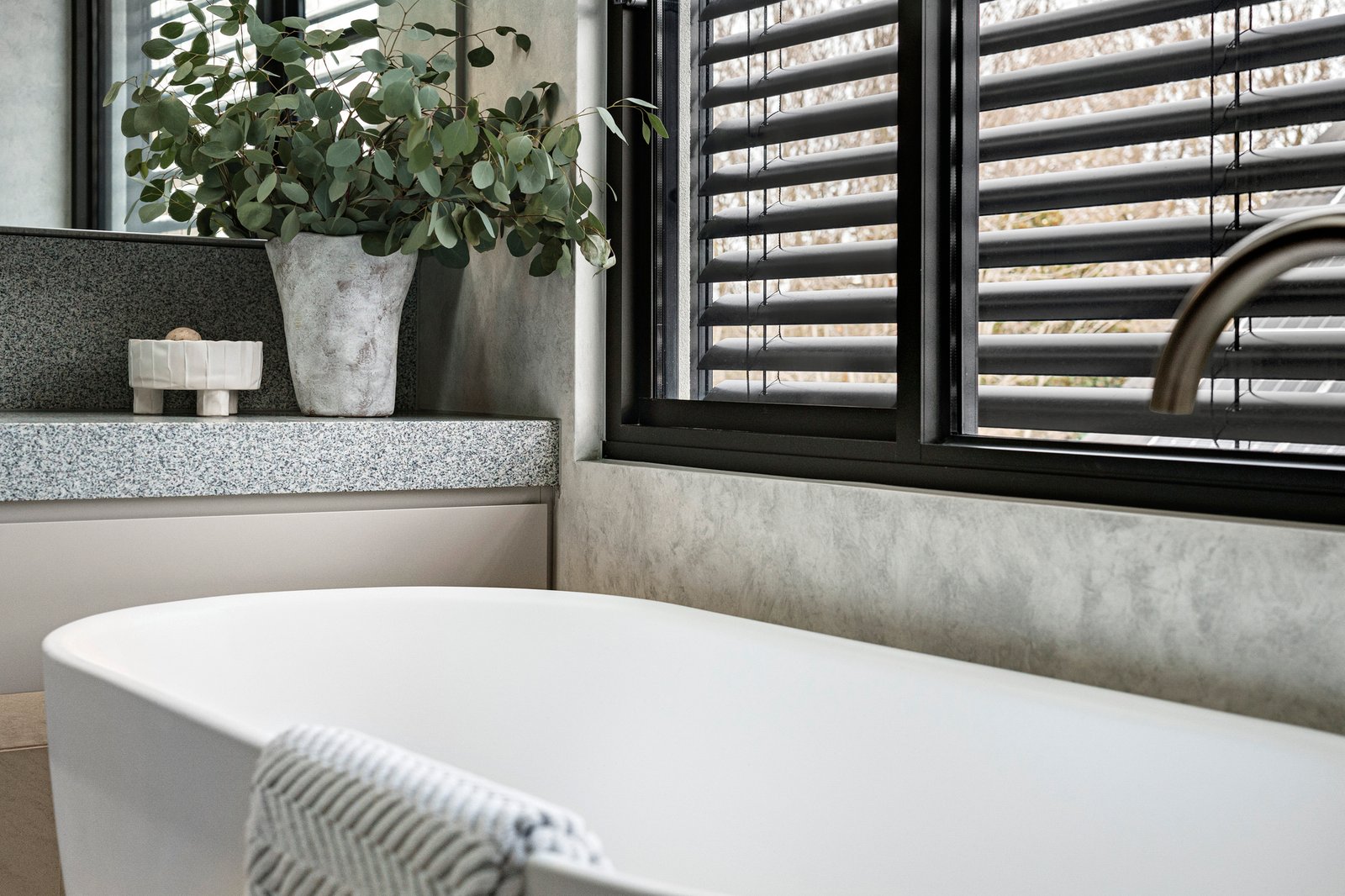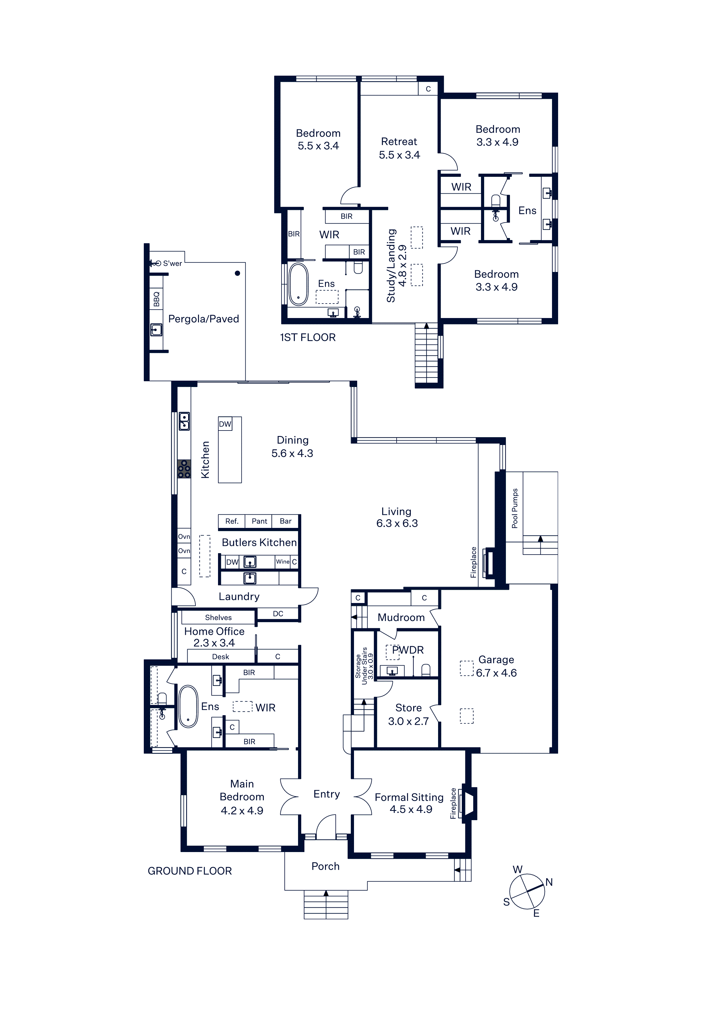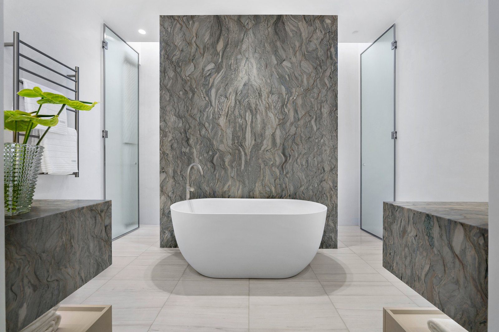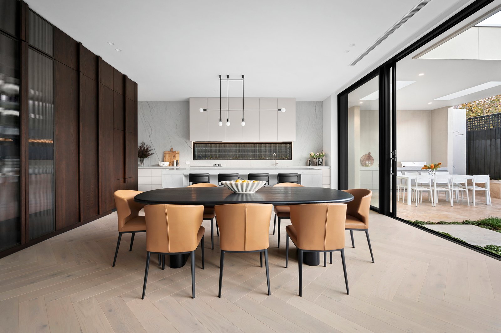 A sumptuous downstairs main bedroom with bespoke WIR and opulent Brazilian quartzite and Italian Dolomite en suite establish a level of luxury matched upstairs by a second main bedroom with walk in robe and designer en suite, two additional bedrooms with WIR which share a stylish ensuite, a children’s study and separate retreat.