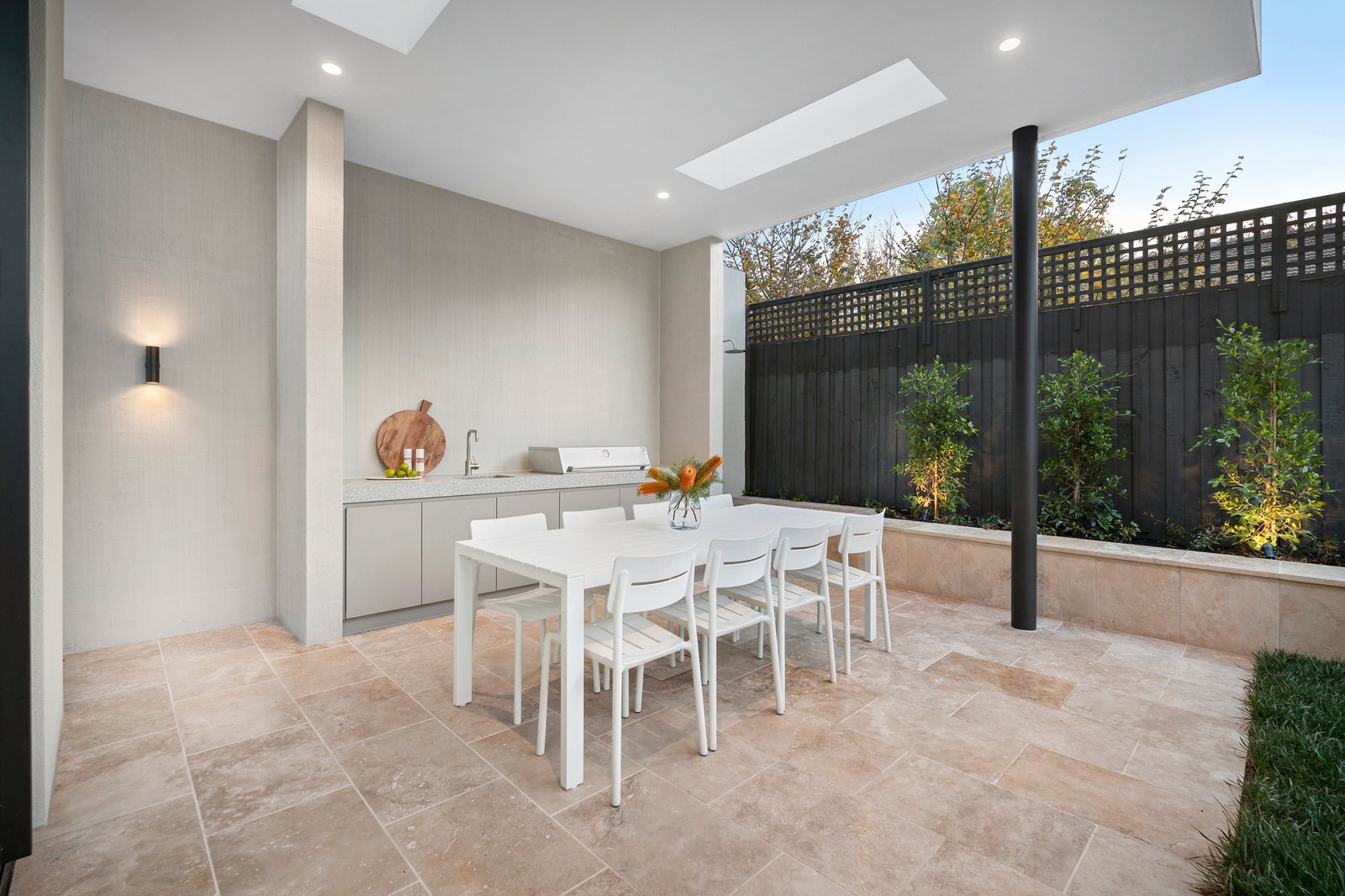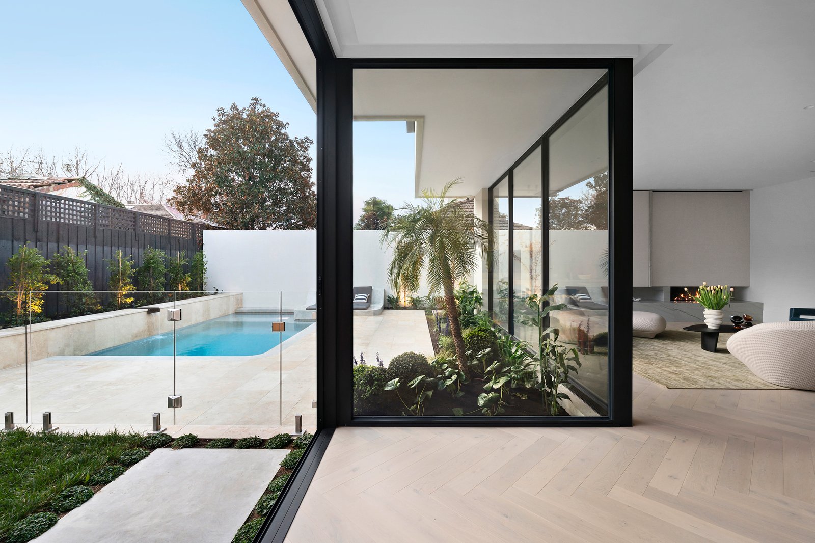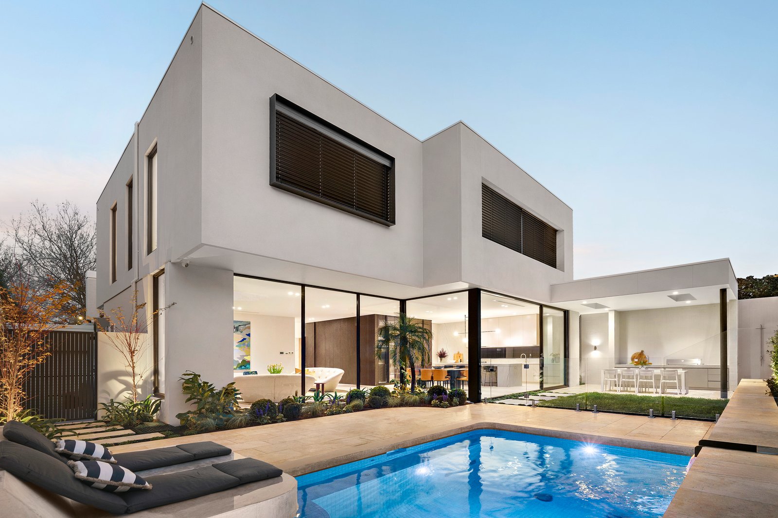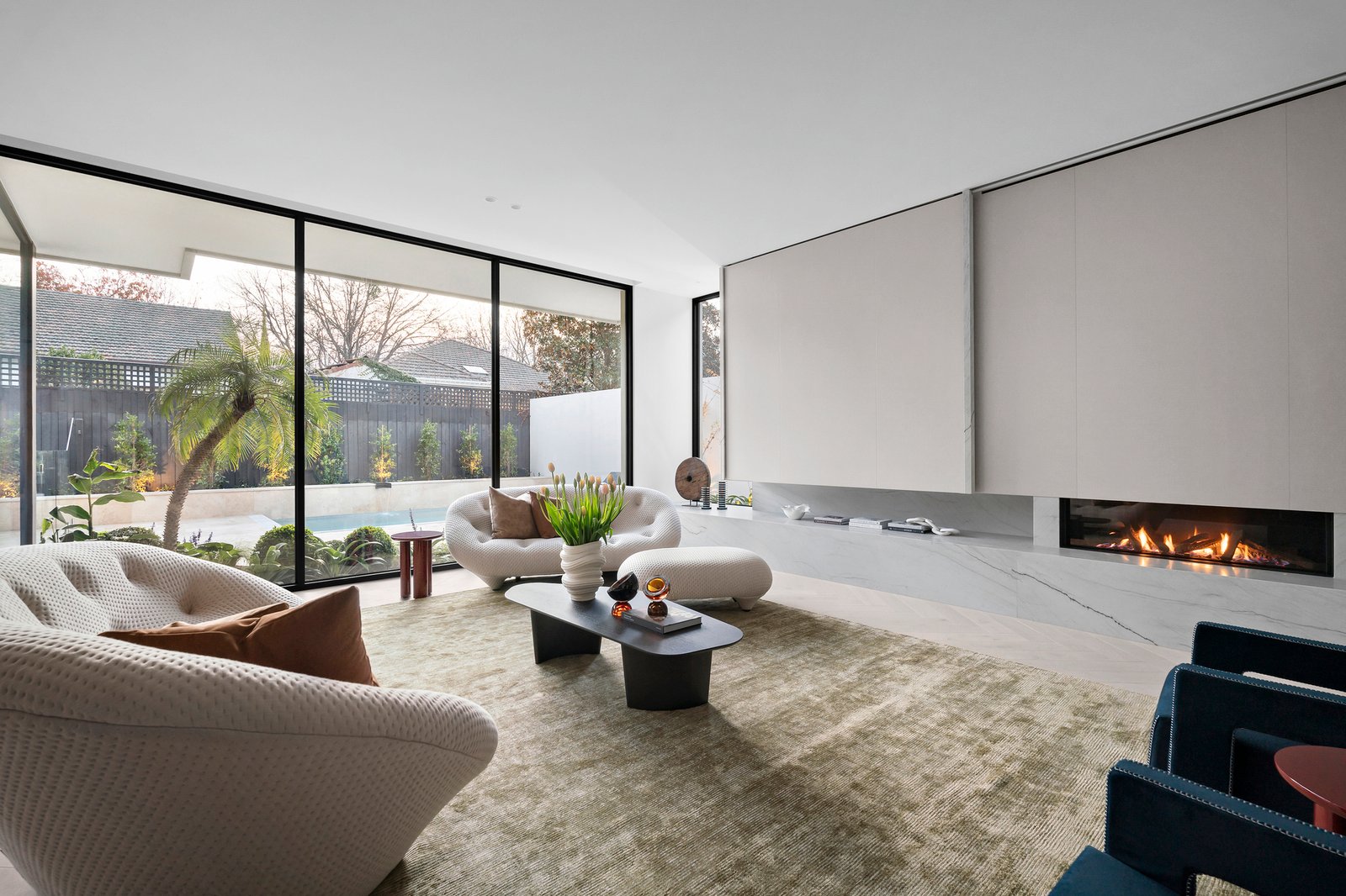 Framed by glorious Daniel Fulton landscaped gardens, the imposing double width reception hall with 7m skylit ceilings introduces a gracious sitting room with marble open fire and a timber lined home office overlooking a secluded light well. Spectacular in scale beneath a 3.1m ceiling, the sun-drenched open plan living and dining room features an Oblica gas log fire and a “whisky” bar. Equally stunning and functional, the sublime gourmet kitchen is appointed with striking Mont Blanc quartzite, Volker Haug custom pendant, Miele appliances including 4 ovens, integrated fridge/freezer, induction and gas cooktop and a butler’s pantry with Liebherr wine fridge and zip tap. Full width glass sliders open the living space to a picturesque northwest facing private garden with rare pygmy palm tree, custom built, self-cleaning, solar heated pool with concrete daybed and a sensational undercover Travertine paved alfresco dining terrace with BBQ kitchen.