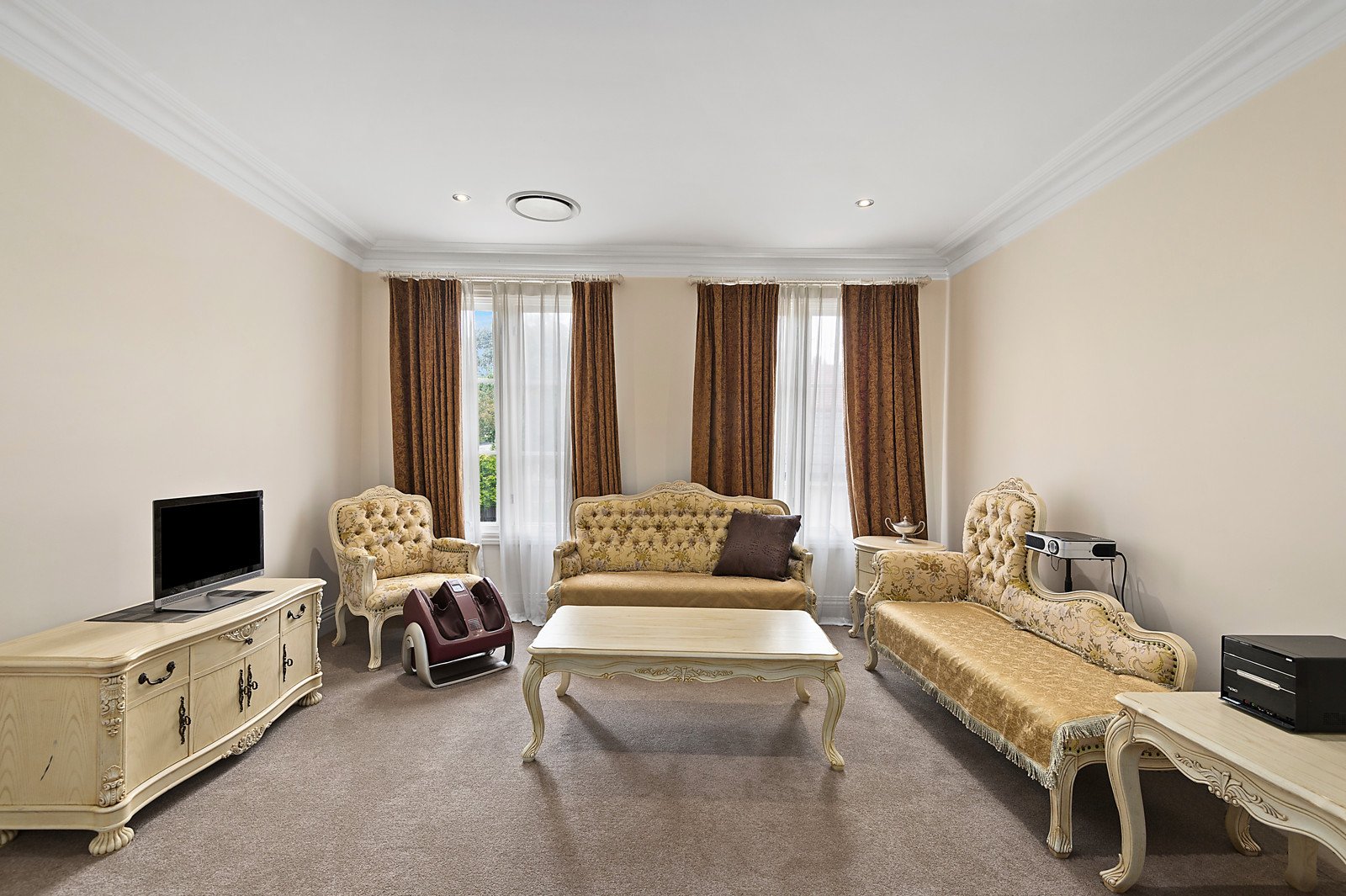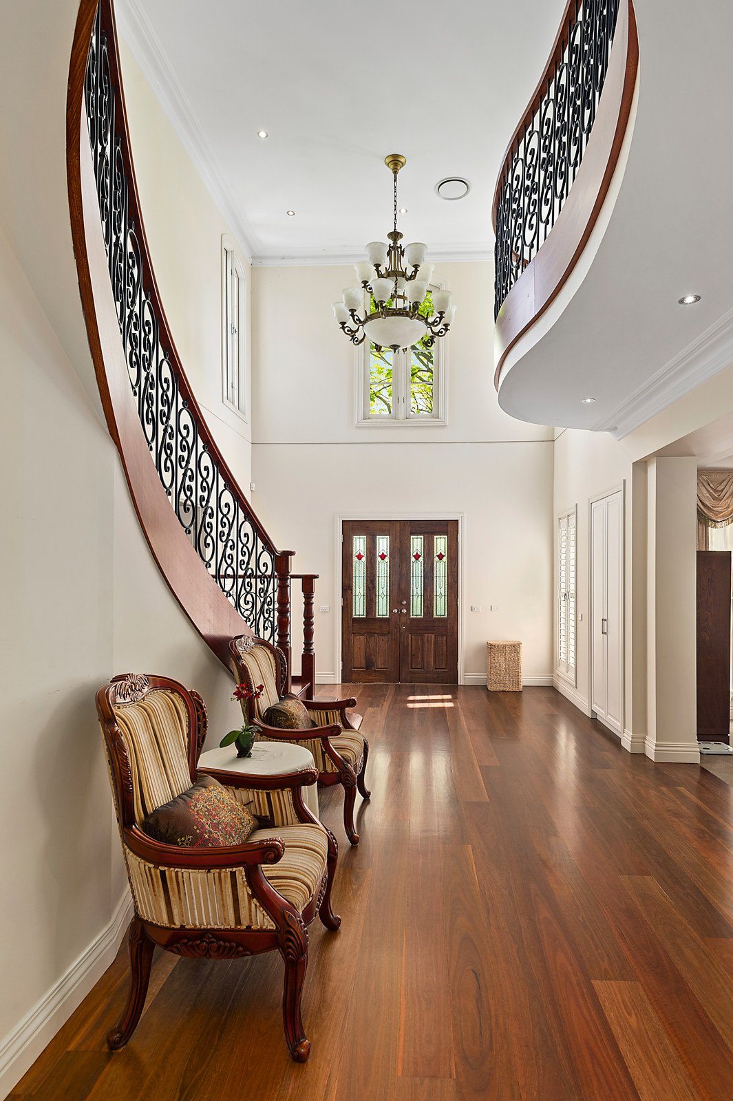 Set well back from the street, customized double doors reveal an imposing reception hall boasting double-height ceilings, a beautiful formal sitting and dining room with gas log fire, and a generous home office. The expansive open plan living and dining room with a gourmet kitchen appointed with stone benches, and a full second kitchen open through French doors to the private north-east garden.