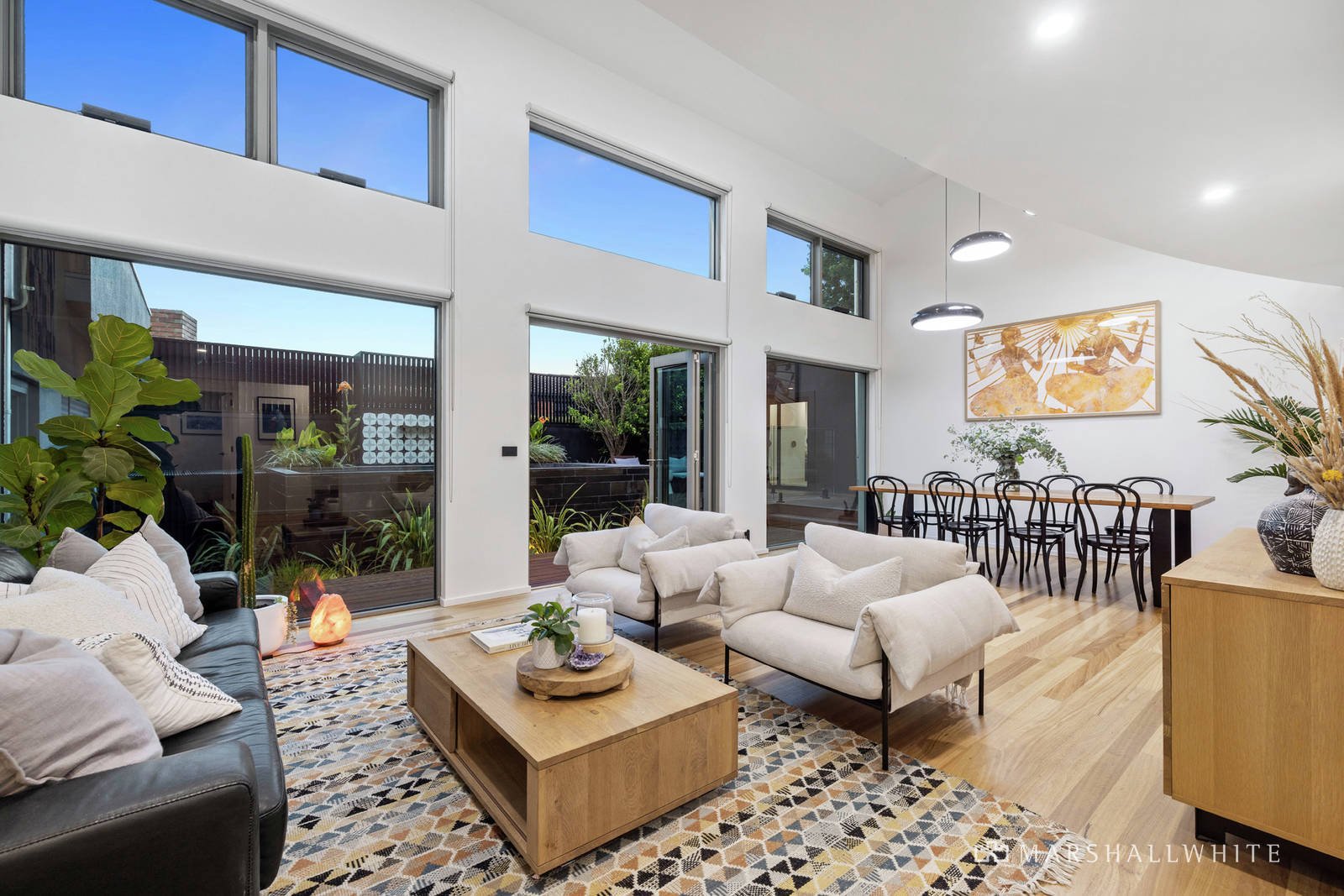 Step inside to realise a sizeable foyer space and light filled interiors anchored by rich solid hardwood floors and generous ceilings throughout to great effect.