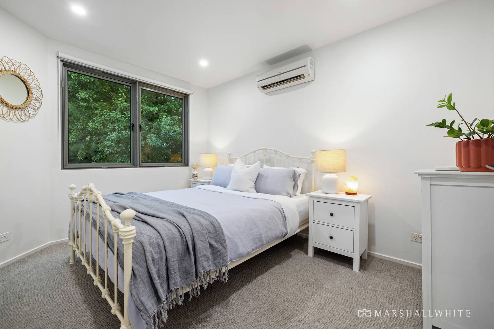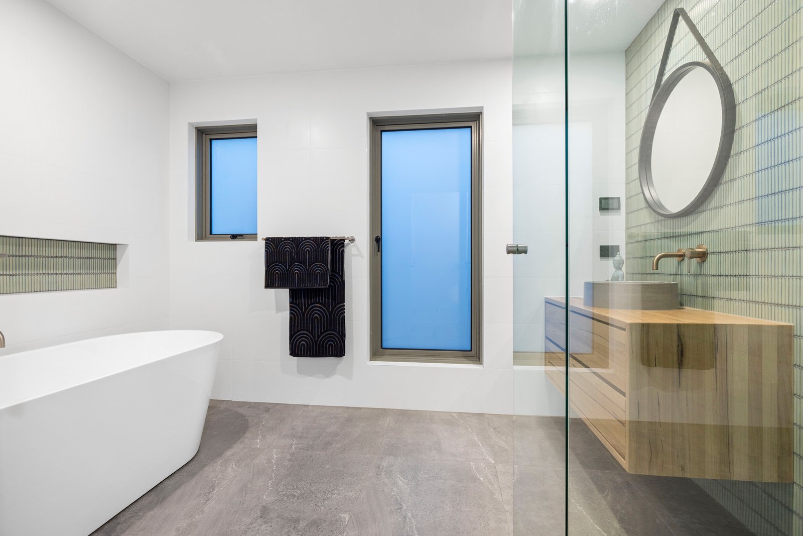 The accommodation zone on the entry level features two bedrooms with glorious garden aspects, plush carpet, walk-in robes serviced by a sumptuous fully tiled family bathroom with floating custom exotic timber vanity, champagne tinted quality tapware, large shower, freestanding bath and separate WC powder room.