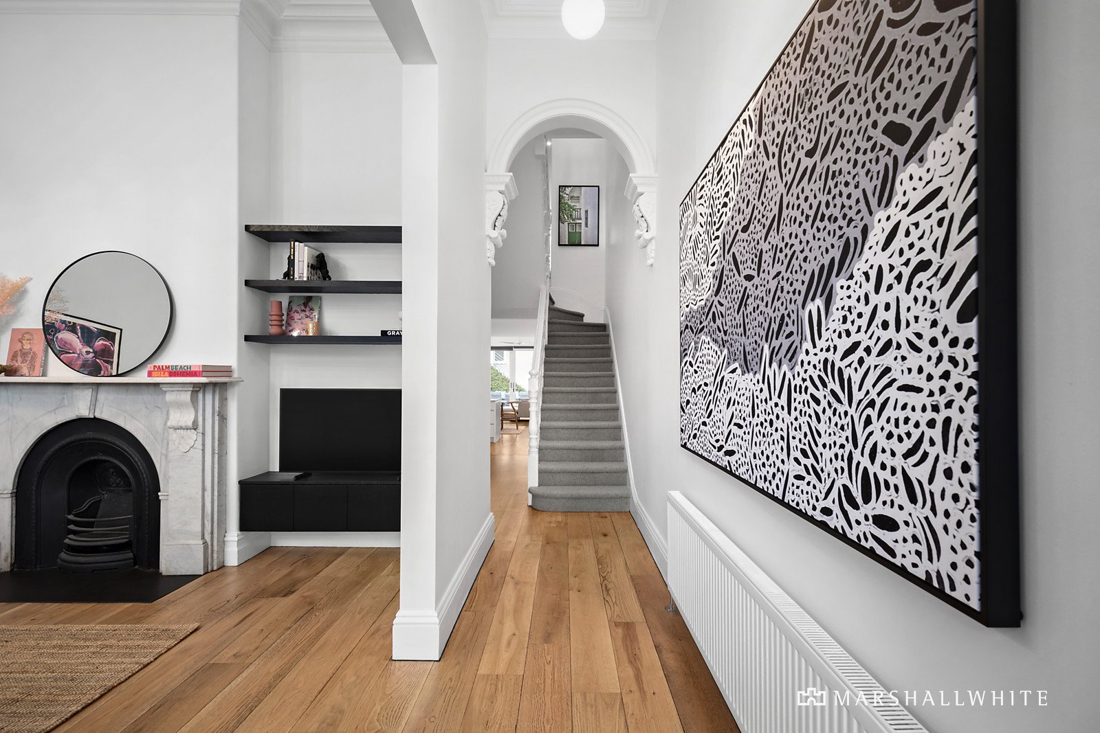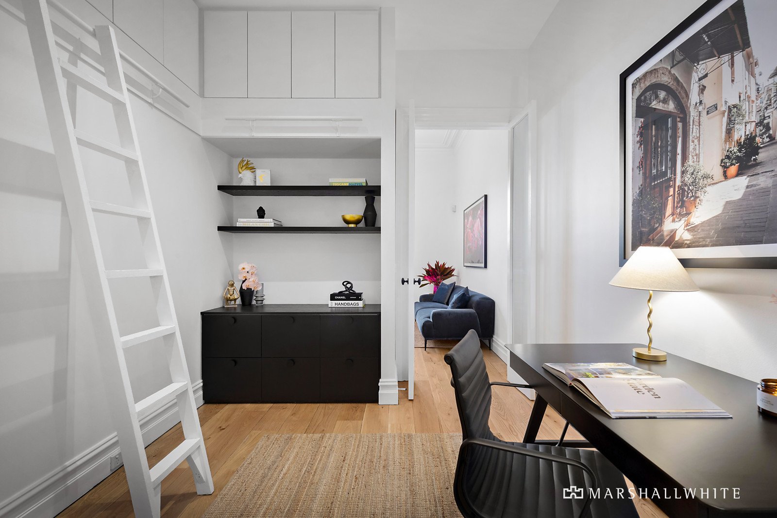 Sun-filled interiors are welcomed by an imposing corbel-arch hallway, where wide oak floors and high ceilings flow to formal living with a marble fireplace and a refined separate study with intelligent storage solutions and a light-well courtyard. Beyond the period beauty, sleek marble benchtops and European appliances create a lasting impact within the gourmet kitchen, opening to the living/dining domain where northern high-set windows and walls of glass make a seamless transition to the alfresco spaces.