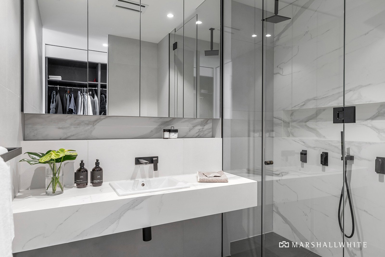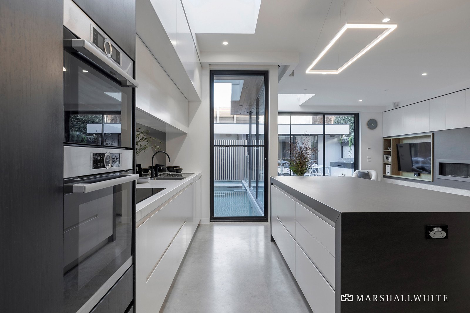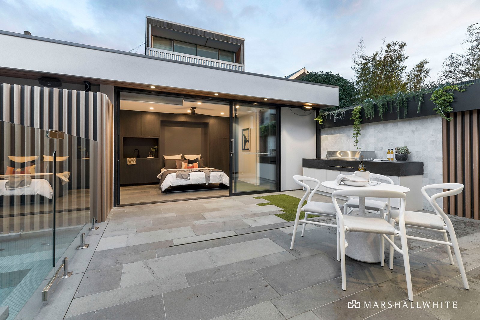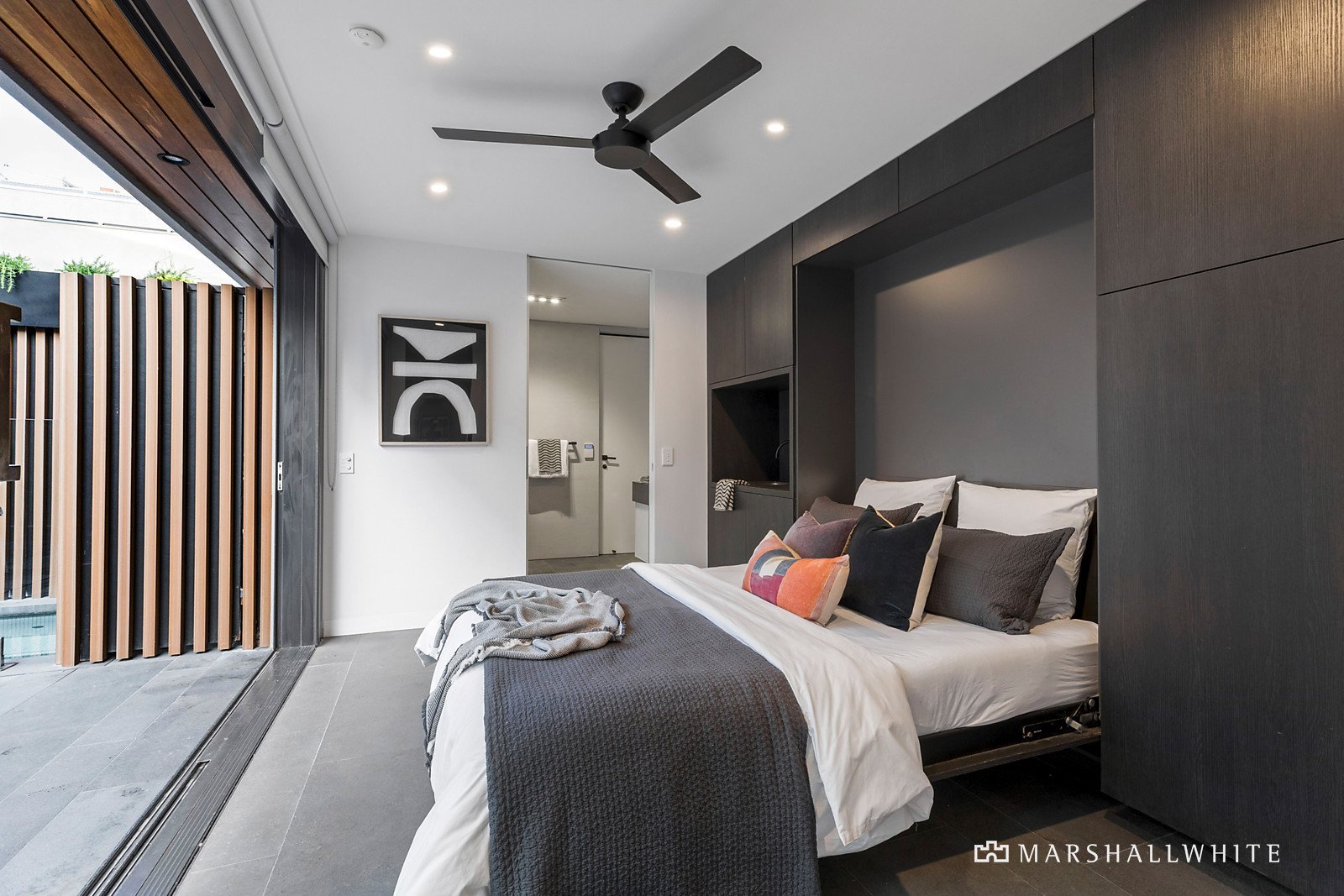 In addition to the north-facing home office, the studio underpins this comprehensive design and caters to contemporary family ideals. Exemplifying versatility as private guest accommodation with a convenient Murphy bed and immaculate bathroom, it's also the perfect summer cabana when relaxing and entertaining poolside.