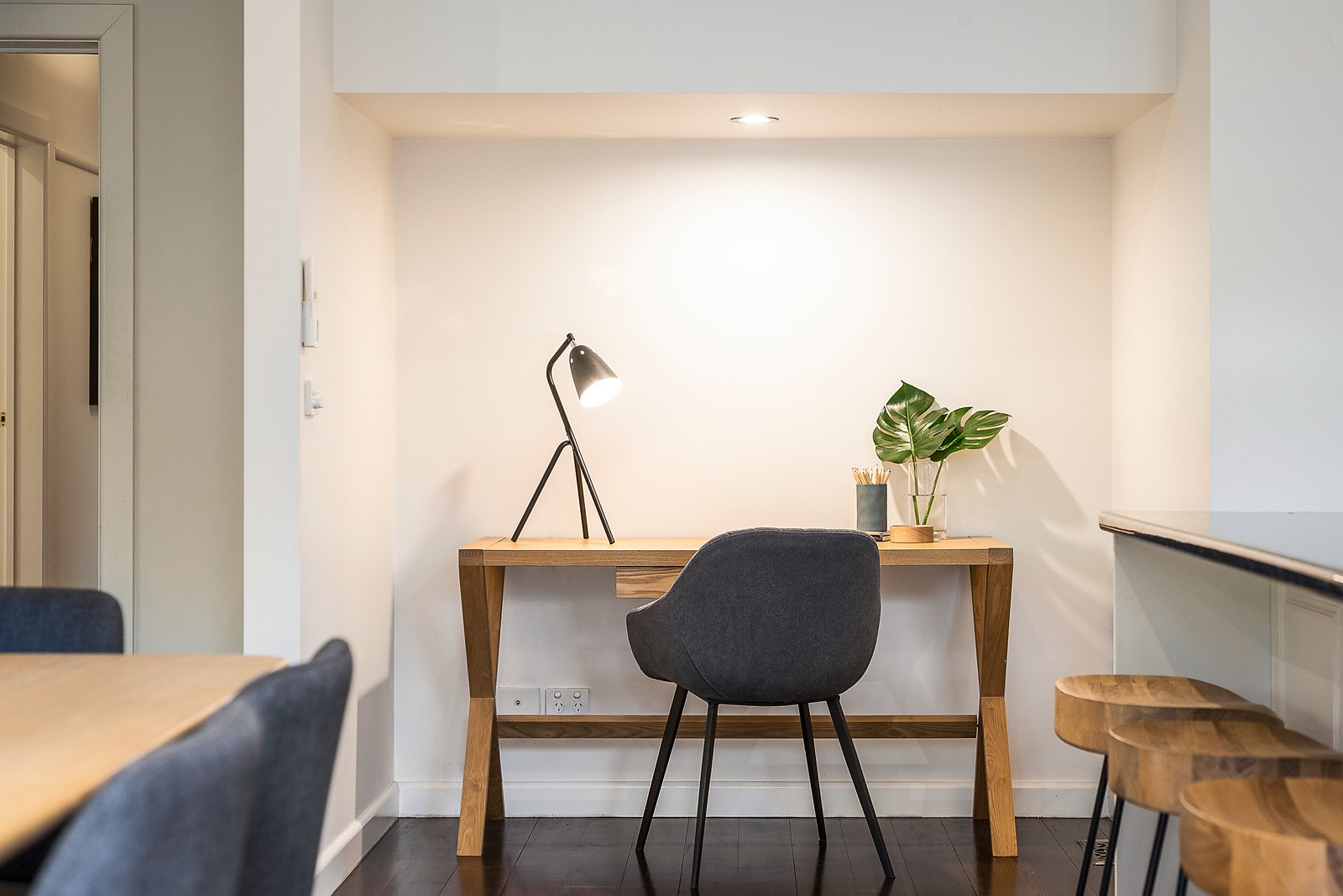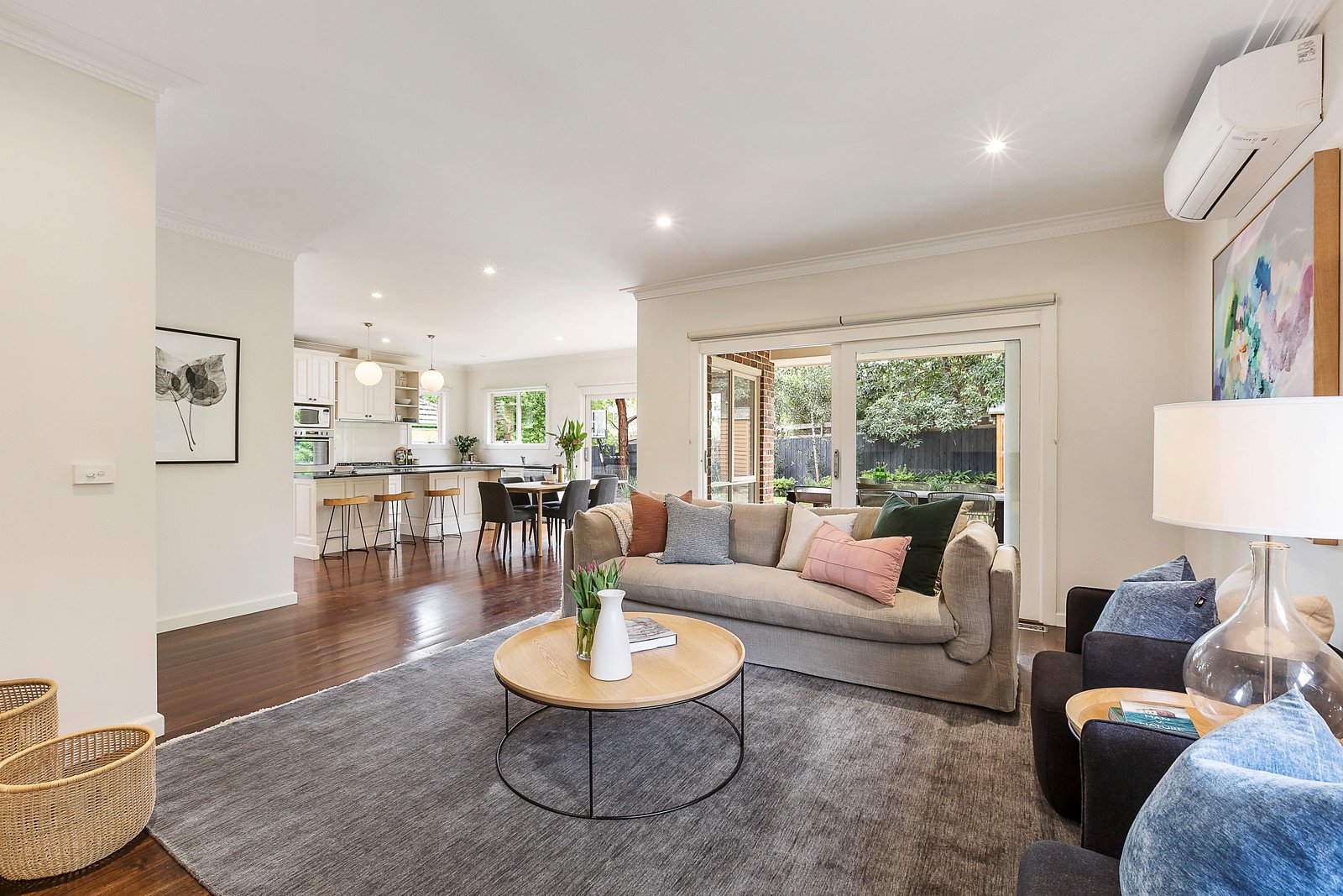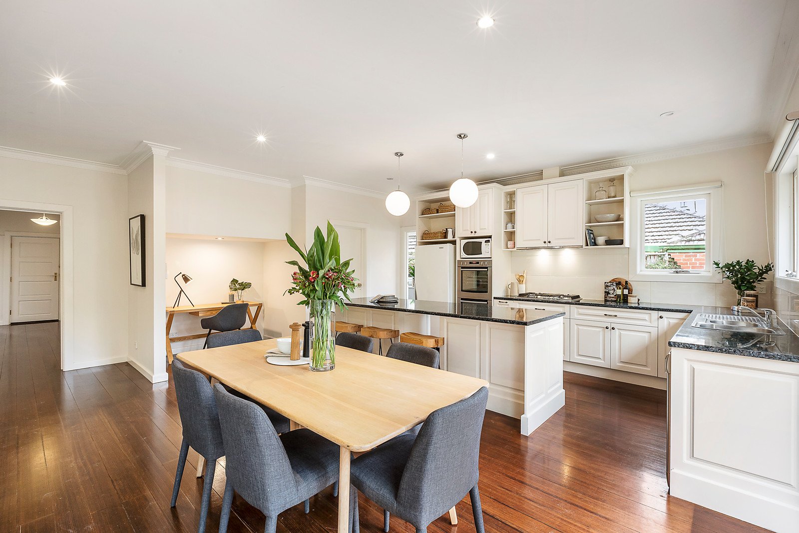 Period details and timber floors are featured in the wide entrance hall and inviting sitting room with a fireplace. The expansive open plan living and dining room with a study nook and gourmet kitchen with walk-in pantry opens through sliding doors to a large covered deck and the entirely private and leafy north-facing garden. The beautiful main bedroom with ornate etched glass windows, walk-in robe and chic ensuite/bathroom enjoys downstairs serenity while a fabulous children's zone upstairs comprises three additional bedrooms with built-in robes and a stylish bathroom.