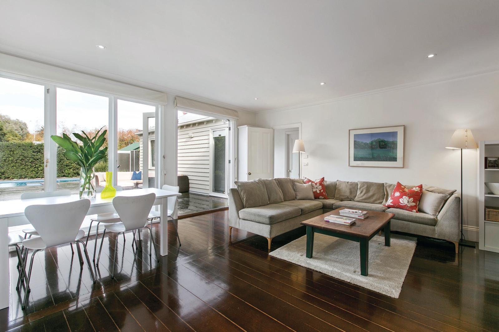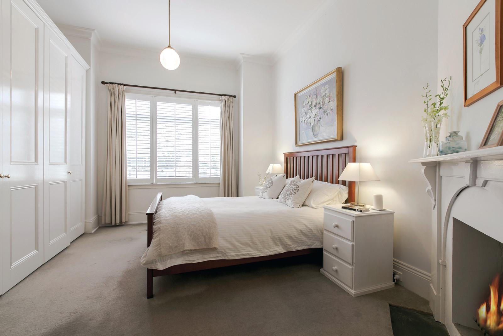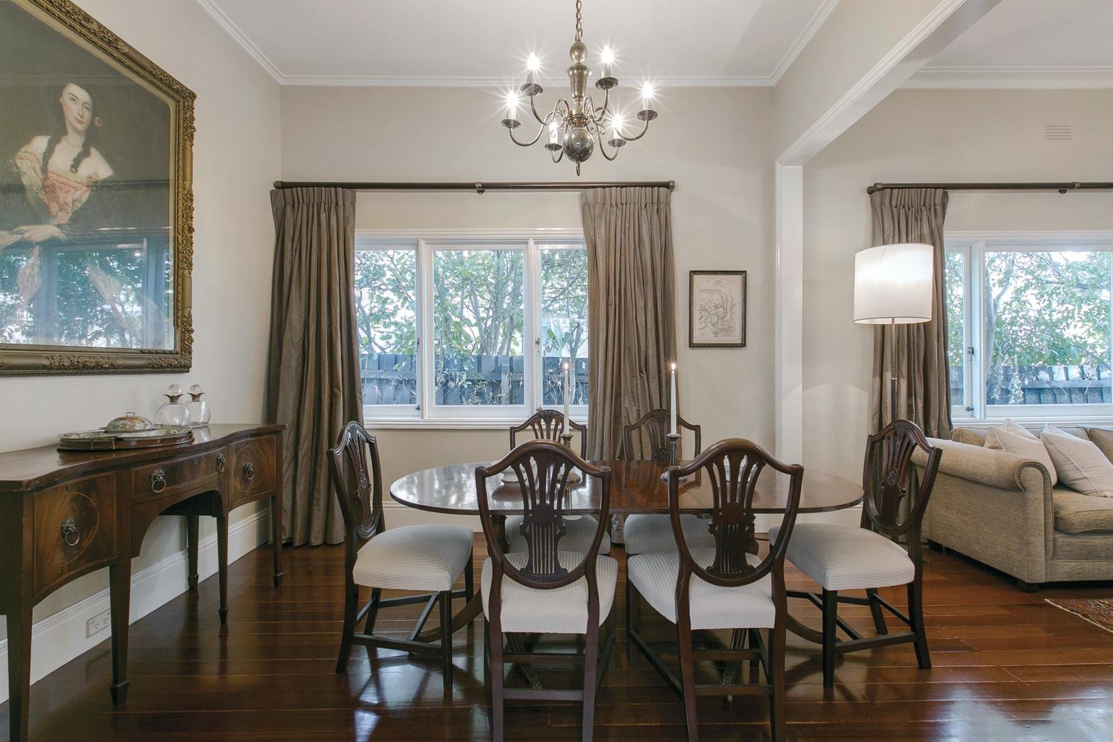 Beautiful high ceilings and timber floors are highlighted through the welcoming entrance hall, elegant sitting room with open fireplace and inviting formal dining room. The stunning main bedroom boasting plantation shutters, open fireplace, built in robes and a stylish bathroom/en-suite is accompanied by a second bedroom with gas fireplace and a fitted study while two further bedrooms and bathroom occupy their own wing. The spacious well-equipped European kitchen and generous living and dining room open to a very deep private landscaped garden with picturesque solar/gas heated pool and spa and expansive decking, perfect for outdoor entertaining.