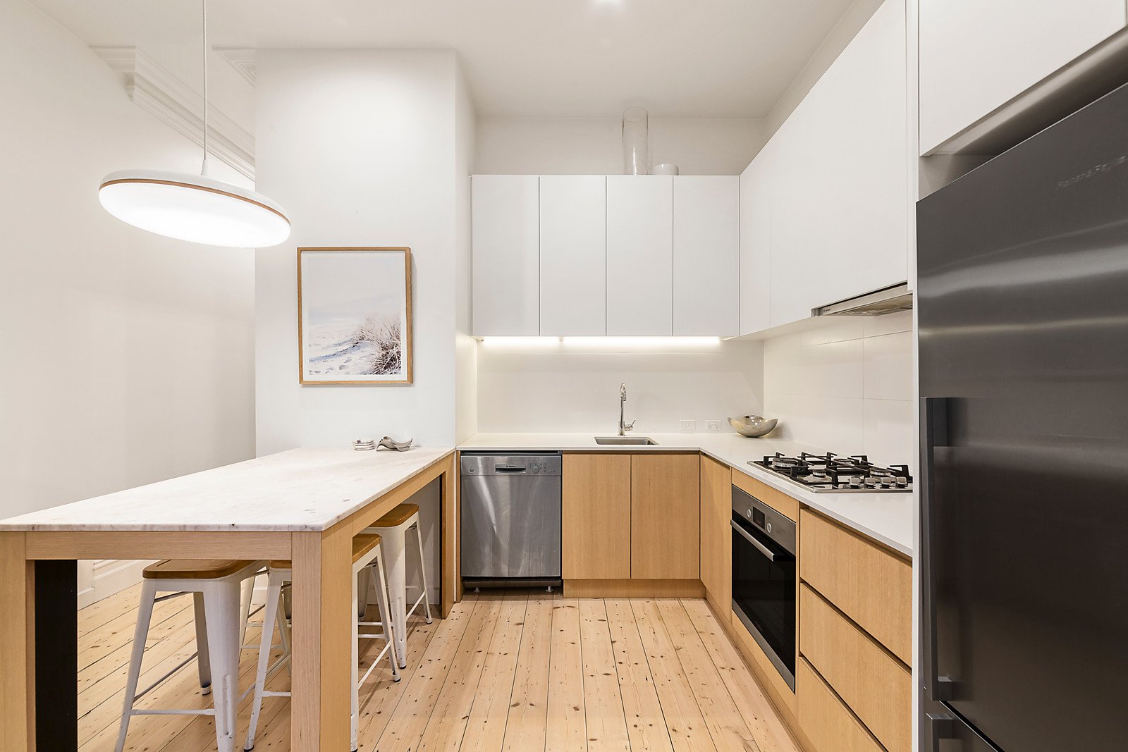 The restored original limed Blatic pine floors that flow through the entrance hall accentuate the sense of light and Scandinavian allure, which continues in the stunning kitchen boasting marble and stone benches and Bosch appliances. Two steps lower, and polished concrete floors and high sky-lit ceilings define the generous living and dining room with a fitted study nook. Glass sliders connect the living to a sunny private entertainer's courtyard with built in banquet seating. Bespoke George Fethers joinery enhances the designer allure of the living areas. A spacious bedroom and stylish bathroom are downstairs while the main bedroom with chic en suite and built in robes is upstairs overlooking the courtyard.