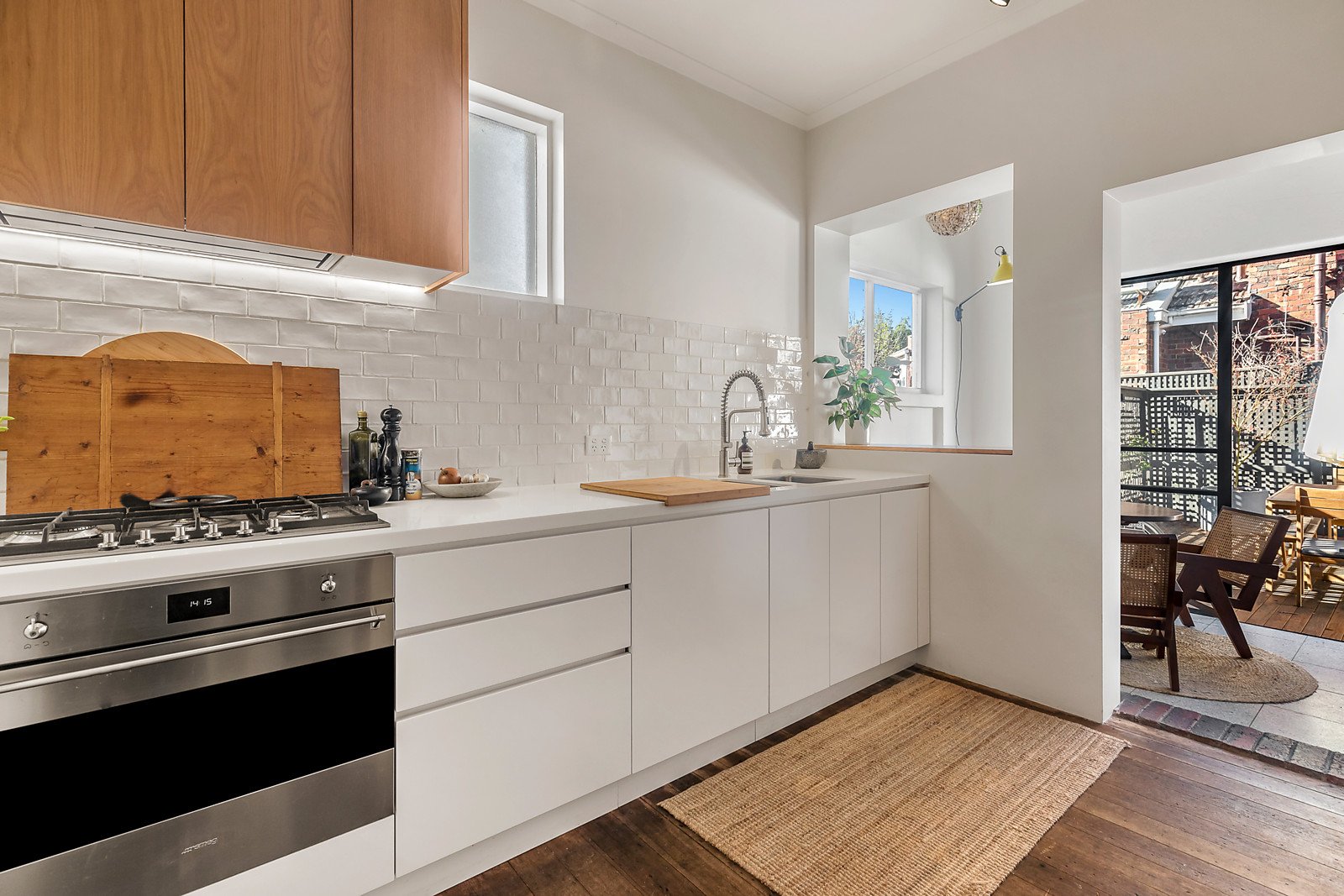 Steeped in tradition with original Deco windows, decorative ceilings and an open fire place, the home reveals an ambient lounge heated by a Heat & Glo gas log fire, semi-attached dining with an ornate fire place and a striking, contemporary kitchen. Overlooking an informal meals / sunroom, the kitchen is equipped with Smeg including a 70cm oven, volumes of premium soft close cabinetry, as well as an integrated refrigerator, as it opens to the tranquility of a deck that bathes in northerly light.