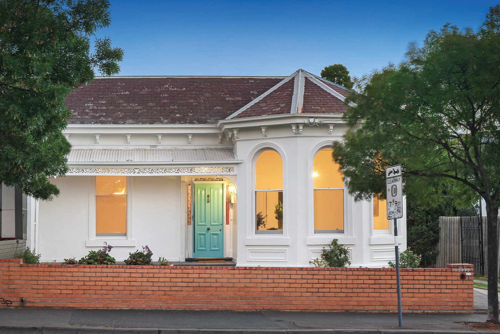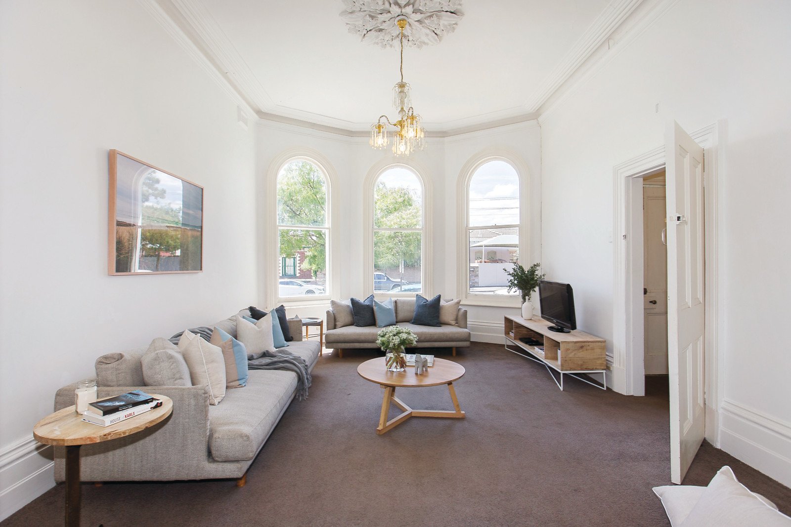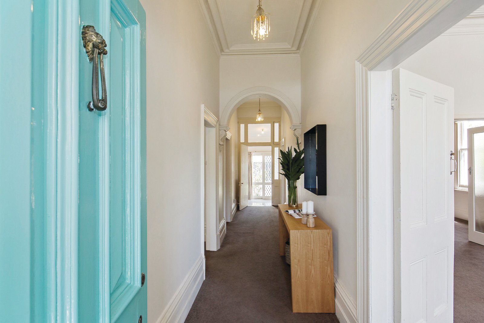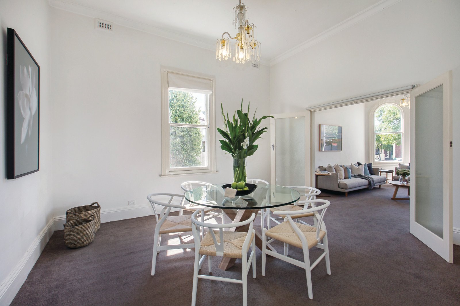 Soaring high ceilings define the imposing arched hallway, elegant sun-drenched living room with bay window and adjacent formal dining room. Two double bedrooms and a study nook are accompanied by a bright bathroom. The spacious light-filled kitchen with casual dining area opens to the deep private garden.