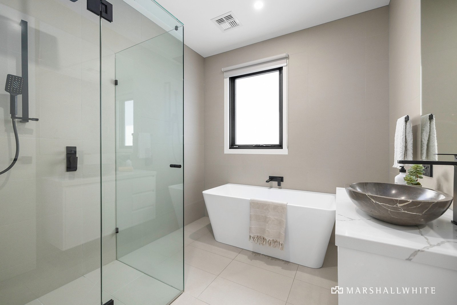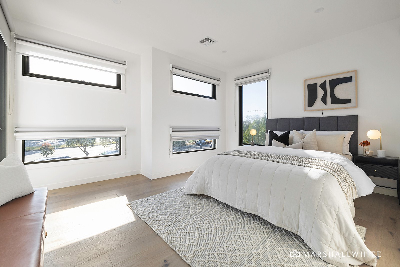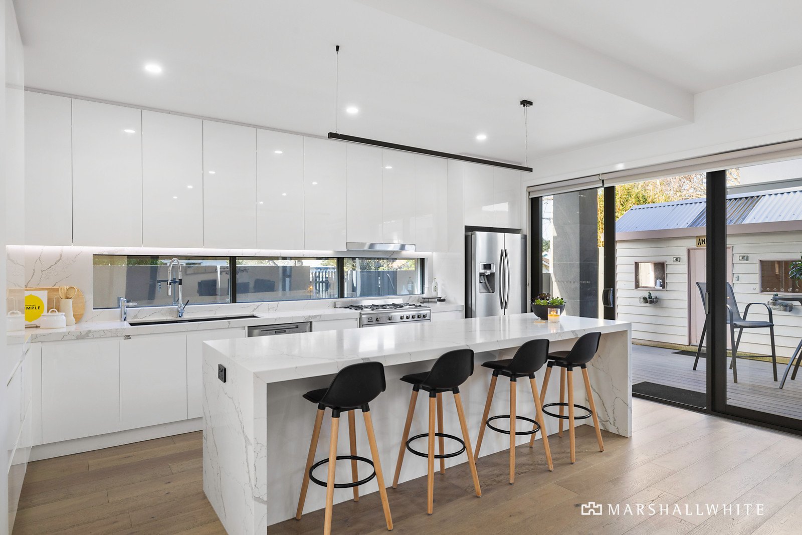 Privately set behind a high wall with automated gates, video intercom security and service road access, the striking, rendered brick two-level home on a 313 sqm (approx.) corner allotment presents impeccably 'as new'. Inside, the ground-level open-plan living/entertaining zone, a central staircase and black steel balustrade make a bold architectural statement, while engineered oak flooring, and lavish use of Calacatta marble underscore the sense of luxury. The stunning kitchen island bench defines the culinary space, gleaming with 2-Pac joinery, and equipped with Smeg appliances including an impressive 900mm free-standing gas/electric cooker. Glass sliding doors seamlessly open out to a full-width undercover alfresco deck, bathed in plenty of northerly sun. Additional ground-level features include a gas log fireplace, double/block-out roller blinds, a custom tiered display niche, study/home office (or additional living space) and a laundry/powder room. Upstairs are the four sumptuously carpeted bedrooms including the large master with luxe marble ensuite, a walk-in robe and access to the balcony with views towards the city skyline. The main bathroom has an extra-deep free-standing tub, walk-in dual-head shower, and a marble vanity. Includes central heating and refrigerated cooling, plenty of storage, two linen cupboards, fully fenced and enclosed side and rear yards, single remote-operated garage, plus secure off-street parking for an additional two vehicles.
