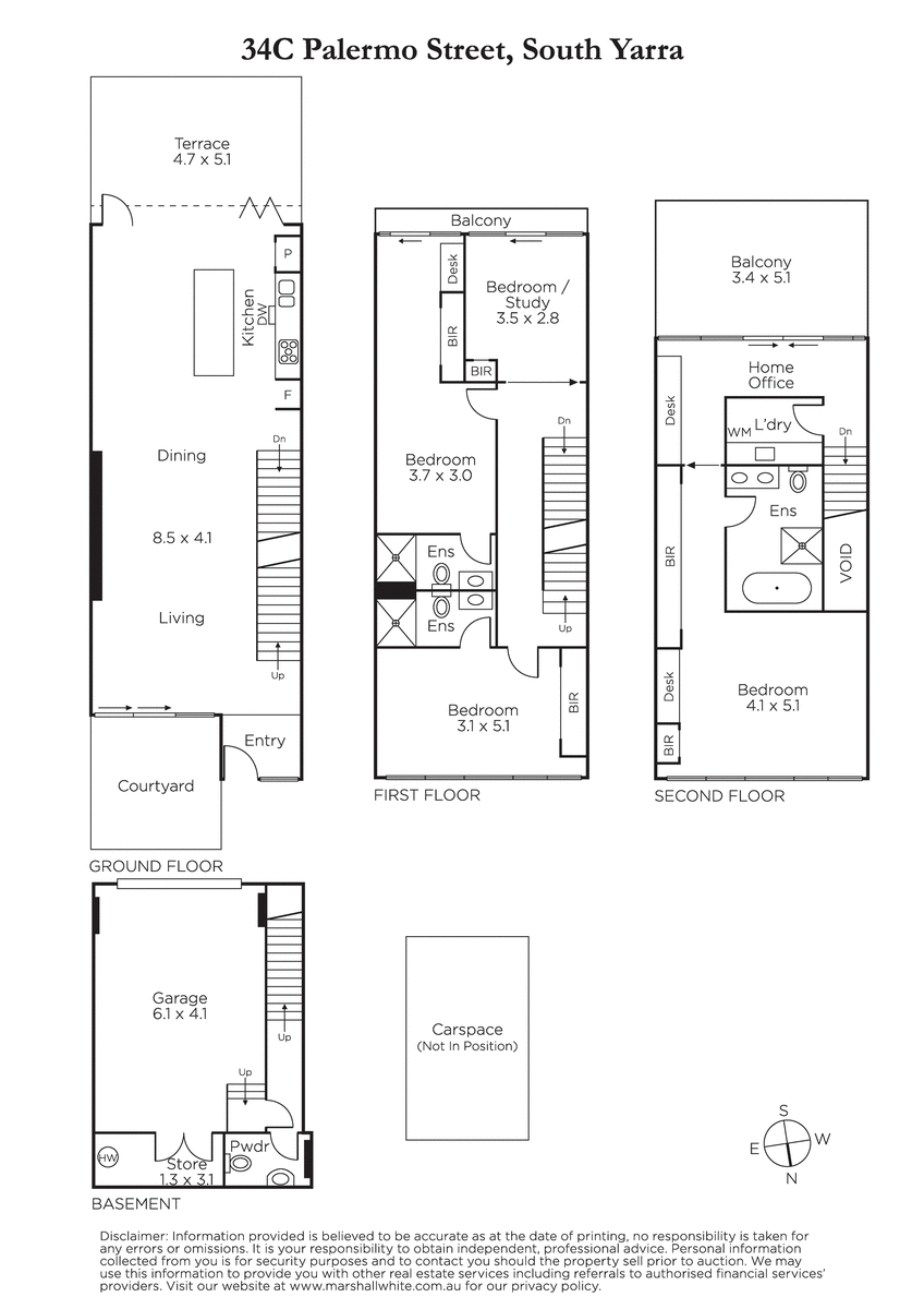 Bathed in northern light, lofty ceilings enhance the sense of space in the expansive open plan living and dining room featuring wide oak floors and a sublime gourmet kitchen appointed with marble benches and Miele appliances. Fully opening bi-fold doors connect the living space with a private bluestone paved courtyard, ideal for al fresco dining. Intelligently conceived family accommodation comprises two double bedrooms with robes and stylish en suites and a 4th bedroom or retreat, while on its own level above enjoying city views, the main bedroom features a lavish en suite with freestanding bath, an abundance of robes, a fitted home office area and large sundeck. On the basement level there is a powder-room, garage, storeroom and additional car-space.