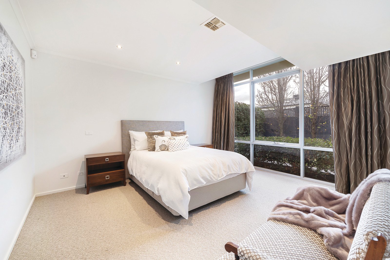 A double door entry reveals a large fully fitted study or office, an expansive sitting room with open fireplace and adjacent billiards area or formal dining. White glossy tiles accentuate the natural light flow in the generously proportioned open plan living and dining room with a premium kitchen boasting stone benches, AEG ovens, Liebherr integrated fridge/freezer and 2 bar fridges. The living spaces open out to an entirely private northwest hedged garden with solar heated pool and gym or studio. Enjoying tranquil garden outlooks, the main bedroom with walk in robe and stylish en-suite and a second large bedroom with built in robe are set apart from two additional double bedrooms with built in robes and a chic bathroom.
