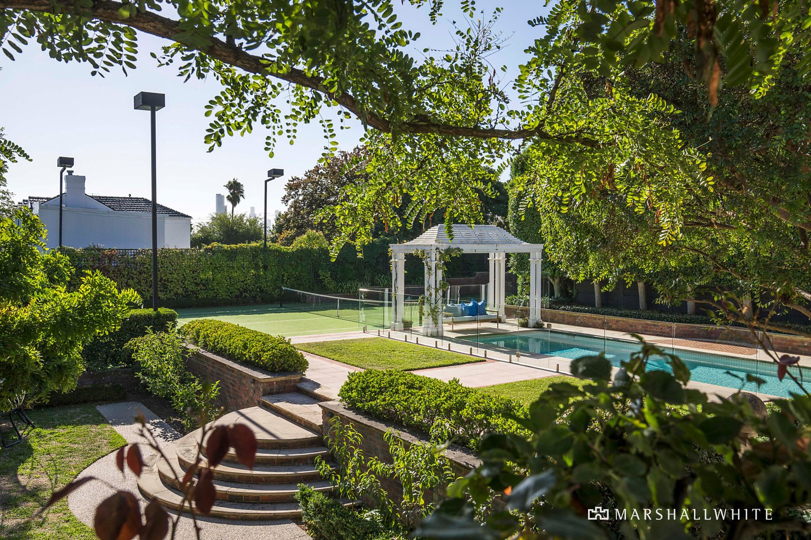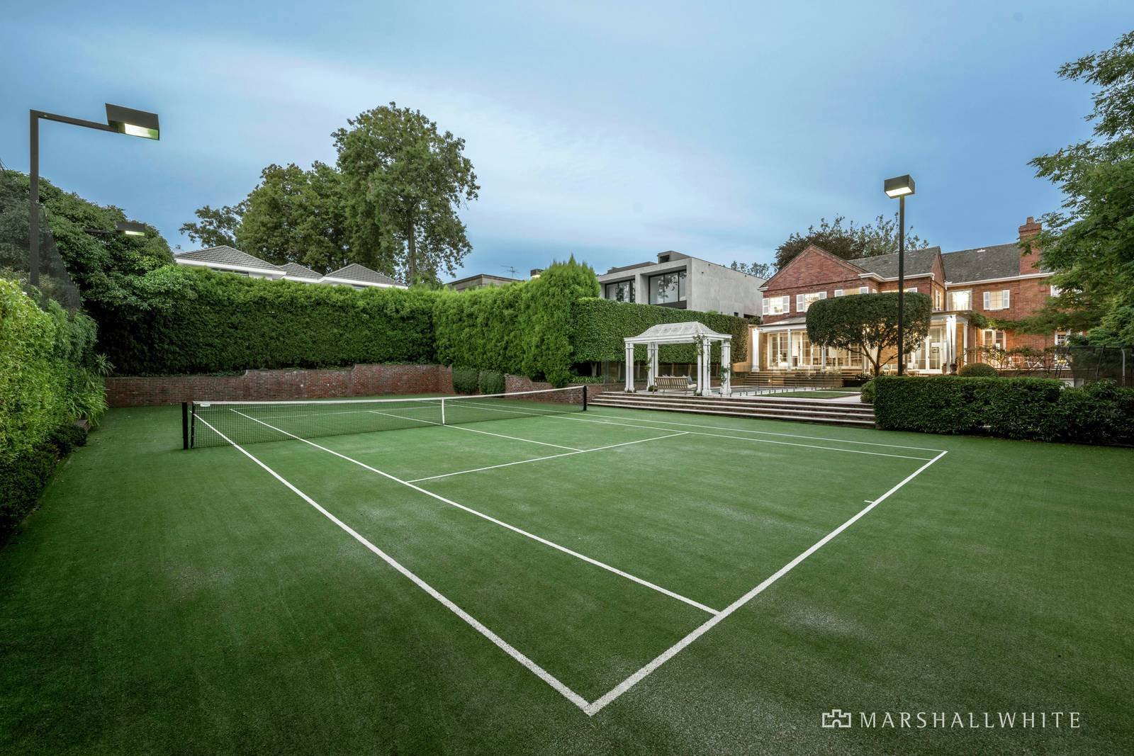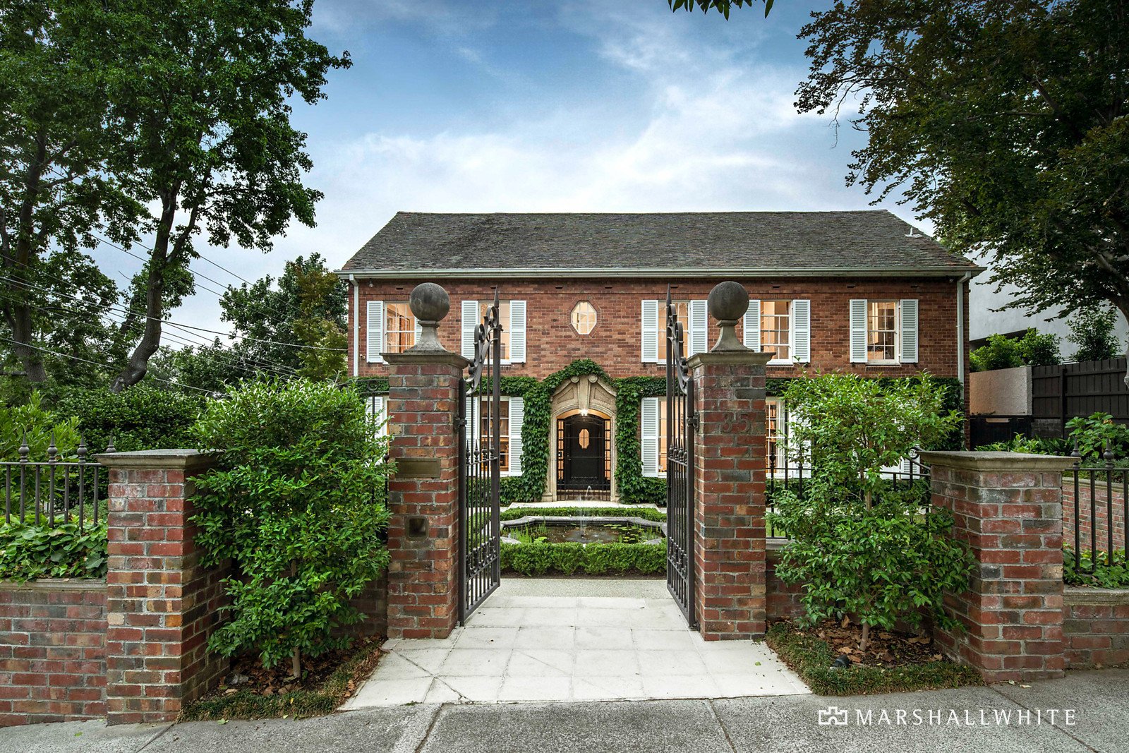 Situated in an elite Toorak location, this magnificent c1930's solid brick residence is irresistibly appealing. Its beautiful interiors are set within breathtaking European-inspired gardens with north-south tennis court and picturesque pool. The Michael Munckton-designed home is classically refined and framed by deep gardens. The welcoming entrance hall introduces a library or home office, and a palatial sitting room with French doors opens to a fabulous sunny terrace with water feature. A versatile retreat or media room opens to a second tree-shaded terrace. Dark timber floors flow through the sublime entertainer's kitchen with marble island, Caesarstone work benches, Miele appliances, integrated Liebherr fridge/freezer and a butler's pantry with bar fridge. A picture window in the kitchen frames a striking display of espaliered camellias. The expansive open plan living and dining room with gas log fire extends out to a large covered terrace and then to the spectacular landscaped private garden with heated pool and mod grass tennis court with lighting. Luxurious accommodation upstairs comprises a lavish main bedroom with deluxe dressing room and designer limestone en suite with bath and underfloor heating, two generous bedrooms with robes and a shared en suite, a fourth bedroom with stylish en suite and built-in robe, a family bathroom and gym/fifth bedroom.