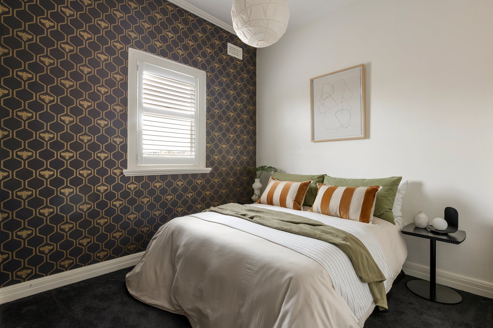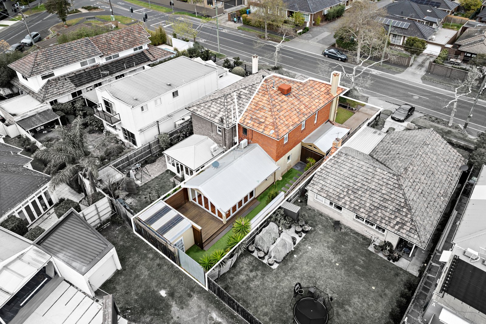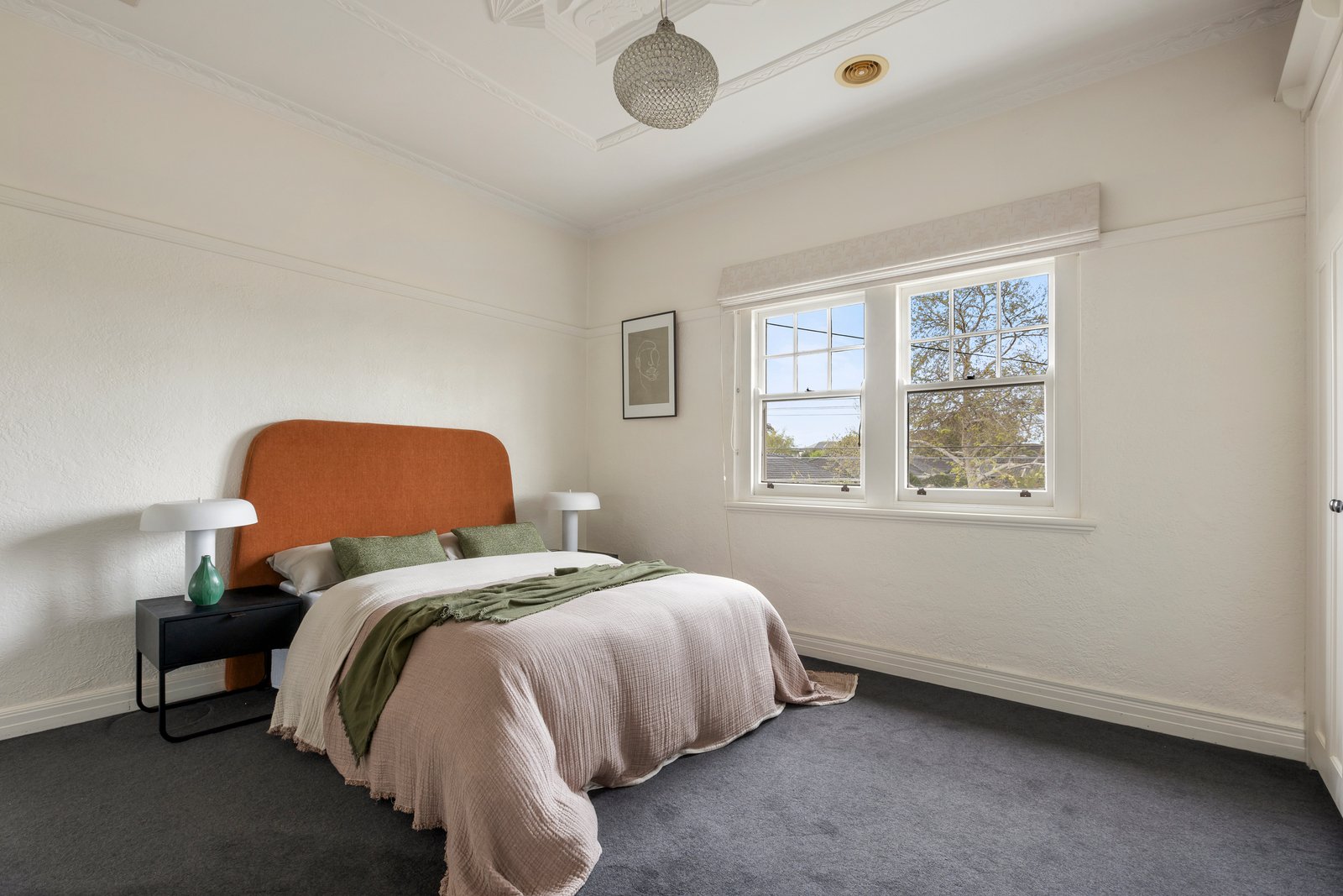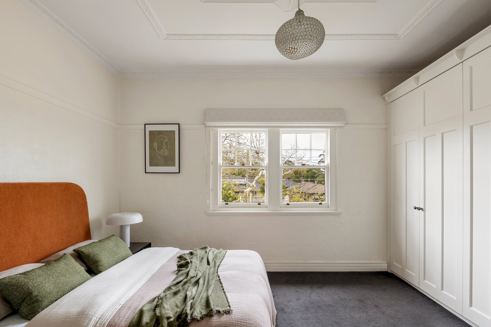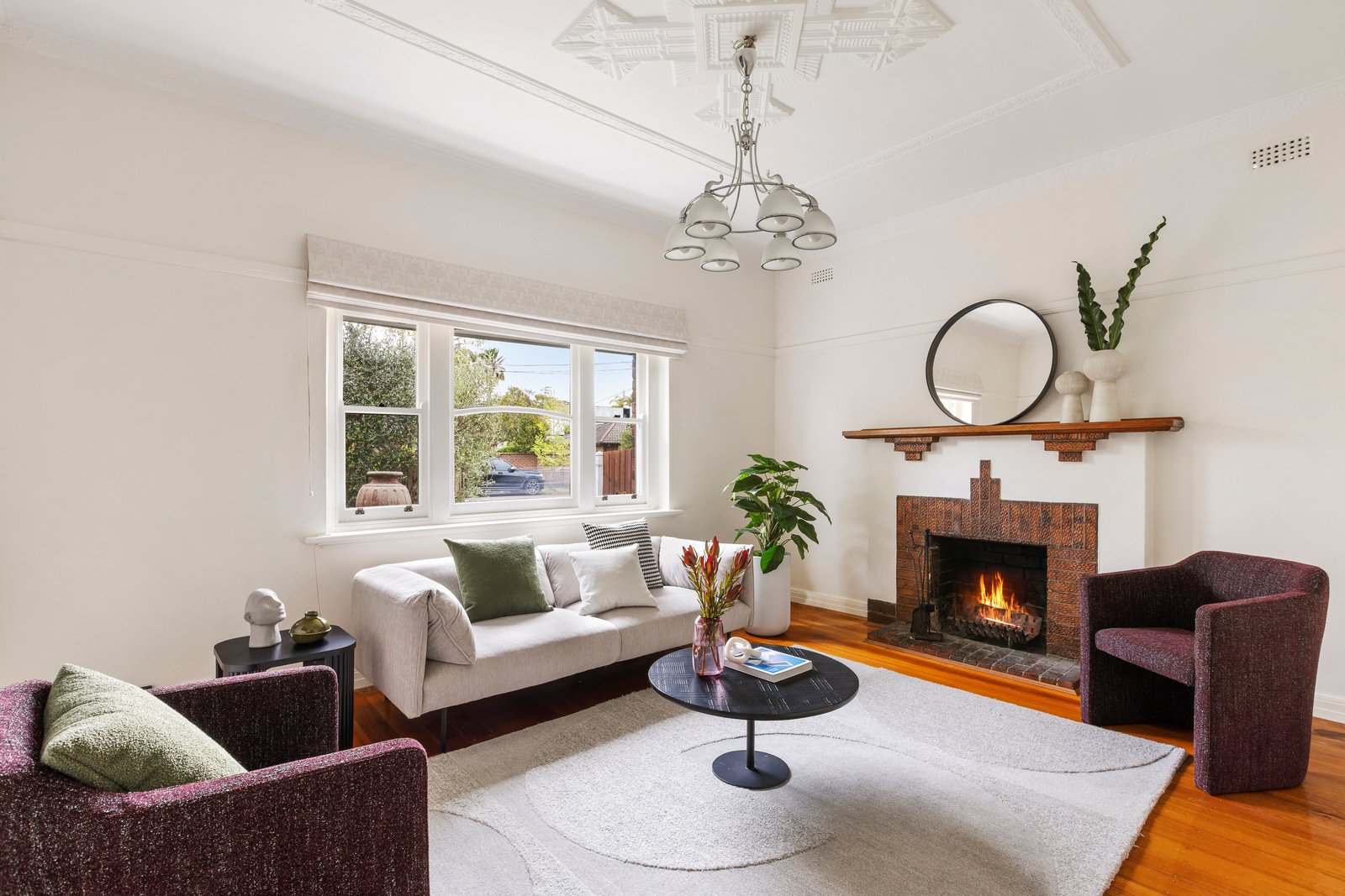 Privately set behind a high fence and gate, a landscaped front lawn with a central water feature introduces the stylish double-storey double-brick-rendered/stucco home, edged with a paved driveway and carport offering secure off-street parking for two cars. An undercover porch, with a handy storage cupboard, leads to the polished hardwood entry hall a with central timber staircase showcasing the soaring dimensions and classic features. Newly painted in a fresh white palette, the formal living room looks out to the front garden and features an original open fireplace, ornate plasterwork ceiling, and a Deco inspired designer pendant light.