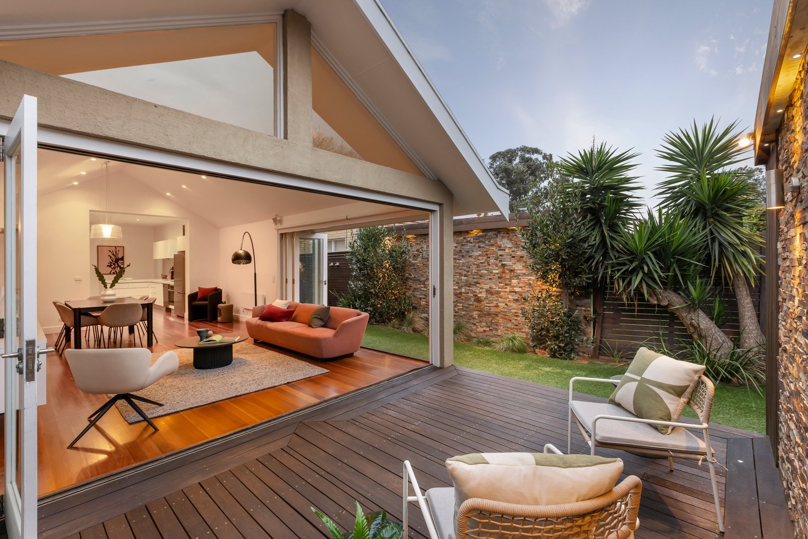 A hallway leads to the light-filled contemporary open plan indoor/outdoor living and entertaining zone, headed by a stone/Miele-appointed gourmet kitchen. High vaulted ceilings and angled highlight windows soar above bi-folding doors that open on two sides to a private courtyard deck and low-maintenance side gardens, drenched in northerly light. A luxe powder room and Euro laundry, Nobo electric panel heaters, automated blinds, in-built speakers, and custom joinery complete the lower-level layout. Upstairs are the three character-filled bedrooms, all with Deco details, including the spacious front-facing master which has a wall of built-in robes, and far-reaching neighbourhood/tree-top views. Also, upstairs is the floor-to-ceiling tiled bathroom with built-in tub and separate shower, while additional features include reverse cycle central heating/cooling, a lockable shed/studio, and a rear access gate.