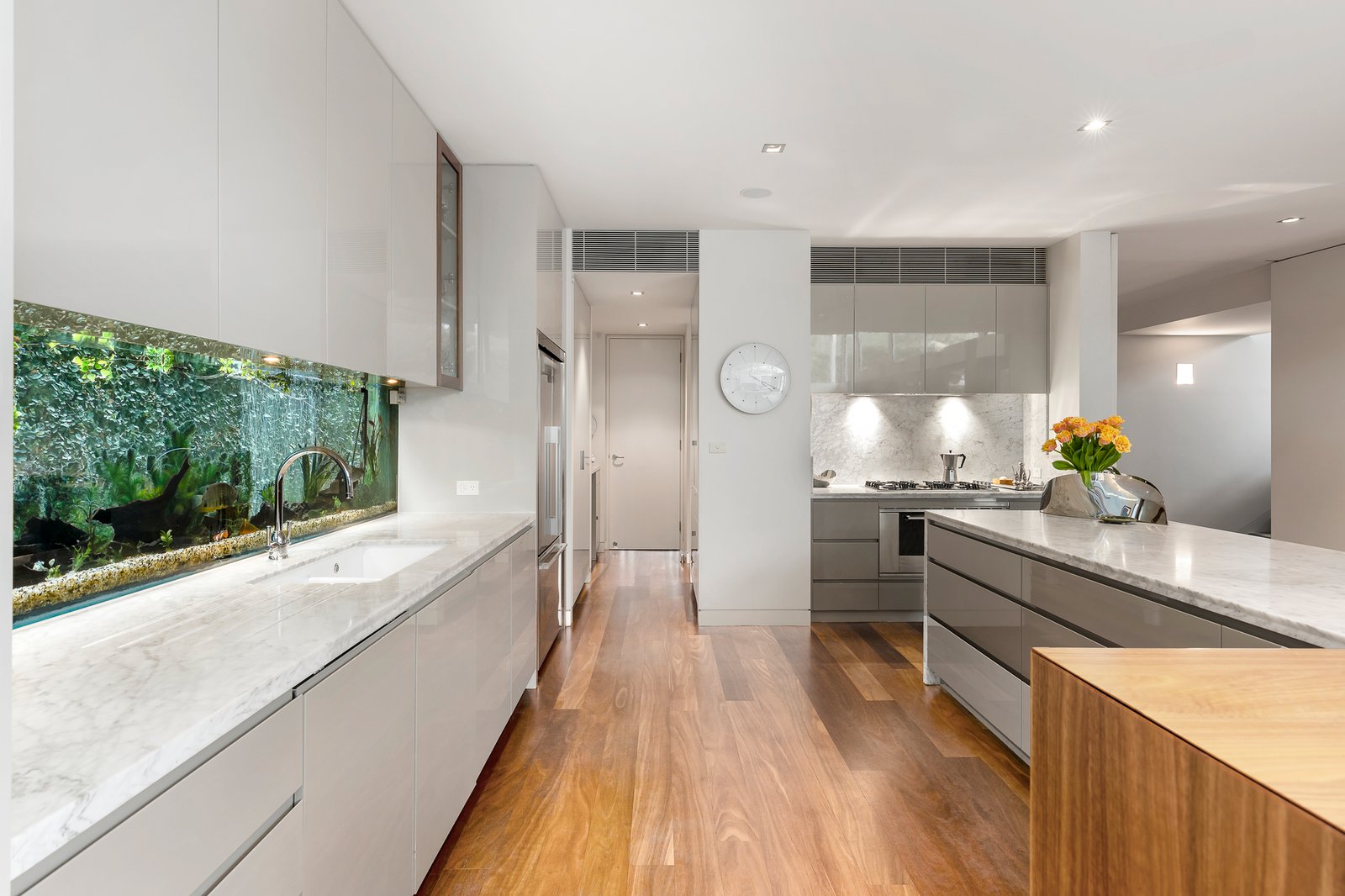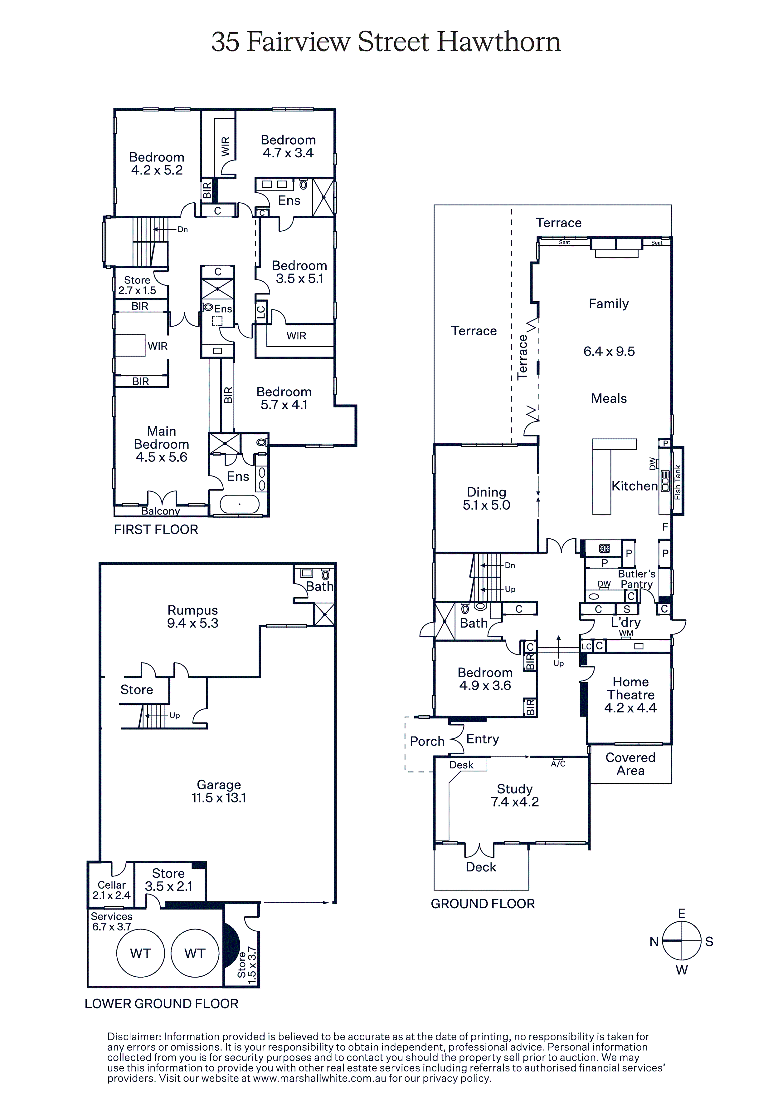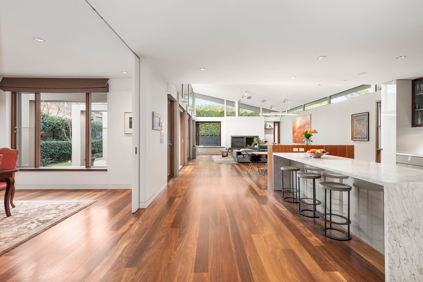 The stunning family domain with a raised ceiling and high north-facing windows, incorporating a state-of-the art Italian Carrara marble kitchen equipped with prestige Ilve and Miele appliances, a spectacular fish tank glass splash-back, a full butler’s pantry and adjacent Miele equipped laundry. Connecting to a sun-filled northern terrace with an elevated deck and solar-heated pool/spa in a private hedge-lined garden. The upper level offers a study alcove, a further five large bedrooms, three with WIRs and ensuites plus a sumptuous main bedroom with dressing room and ensuite. The basement level includes a generous rumpus or games room, a full bathroom, wine cellar and storerooms. Comprehensive appointments include video intercom entry, security gates, an alarm, remote cameras, zoned R/C heating and cooling, floor heating (bathrooms), Jetmaster fireplace (living), extensive storage throughout, 2x20,000l underground tanks and a remote 4 car basement garage.