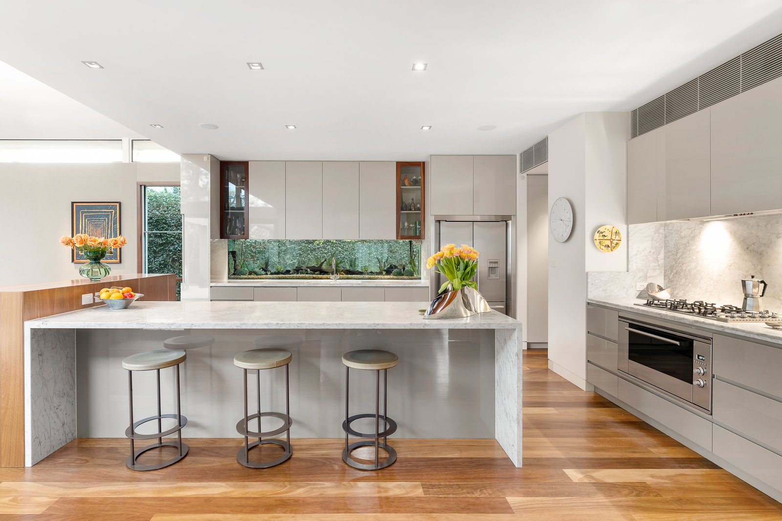 This compelling split-level residence highlighted by clean lines and cutting edge designs, features an eye-catching rendered façade and a custom-built Leaf Sculpture inspired by the local oak trees. Built by David McCallum (DDB), the high-quality attention to detail is immaculate, delivering a ‘wow factor’ on inspection and leaves a lasting impression. The luxuriously appointed interior features expansive living, dining and entertaining areas designed to maximize family enjoyment and handle both small or large gatherings with ease. High ceilings, Tasmanian black-butt floors, and a wide entrance hall accentuate the grandeur of the space. The accommodation includes an executive fitted study or home office, a downstairs guest bedroom with ensuite, home theatre and a separate dining room.