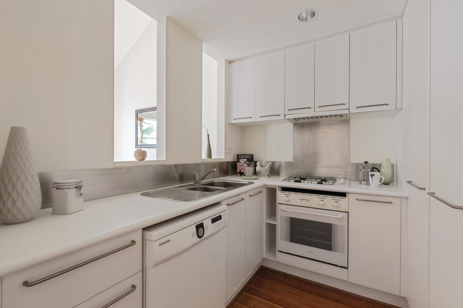 Overlooking beautiful gardens with a fountain, the spacious north-facing living and dining room featuring timber floors and a Juliet balcony is served by a pristine modern kitchen. Also overlooking gardens, the main bedroom with BIR and smart en-suite is accompanied by a second large bedroom with BIR, second stylish bathroom and upstairs, a huge mezzanine living room or 3rd bedroom beneath a soaring vaulted ceiling.