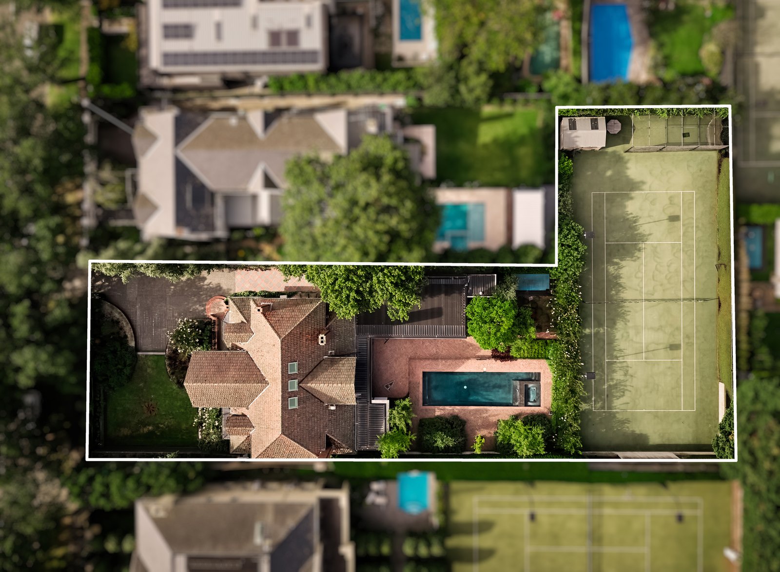 Magnificently set within 1858sqm approx. in Scotch Hill’s most prestigious street, this illustrious Tudor residence, previously renovated by celebrated architects Kennedy Nolan delivers outstanding resort-style family living with tennis court, pool and golf practice area. Elegant formal sitting and dining rooms of grand proportions transition through to a contemporary family dining area served by a gourmet European kitchen. A spectacular “glass house” living room connects seamlessly to the outdoor entertaining precinct with BBQ kitchen, al fresco dining terrace overlooking the pool and north-south mod grass tennis court.
