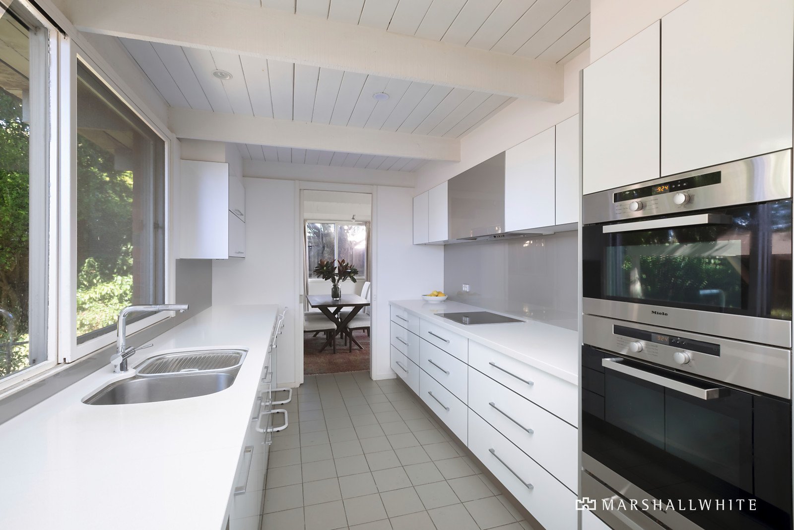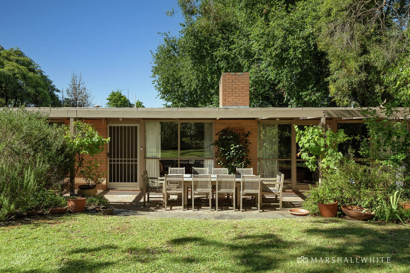 The interior features large windows designed to capture the northern sunlight with pretty garden vistas for every window. A tiled entrance foyer/ library leads to a front bedroom with sky lit ensuite and a generous north-facing living and dining room, opening to a sunny alfresco dining and entertaining area under a vine-clad pergola; plus a galley-style kitchen equipped with prestige Miele appliances and adjacent storeroom/pantry. A glass-walled walkway leads to a lower level informal living room, a study or home office, family bathroom, large laundry and two further bedrooms with BIRs, one with an ensuite. Other features of this very attractive home include alarm, Daikin air conditioners, OFP, rain water tanks, and remote double garage with storage area with secure internal access.