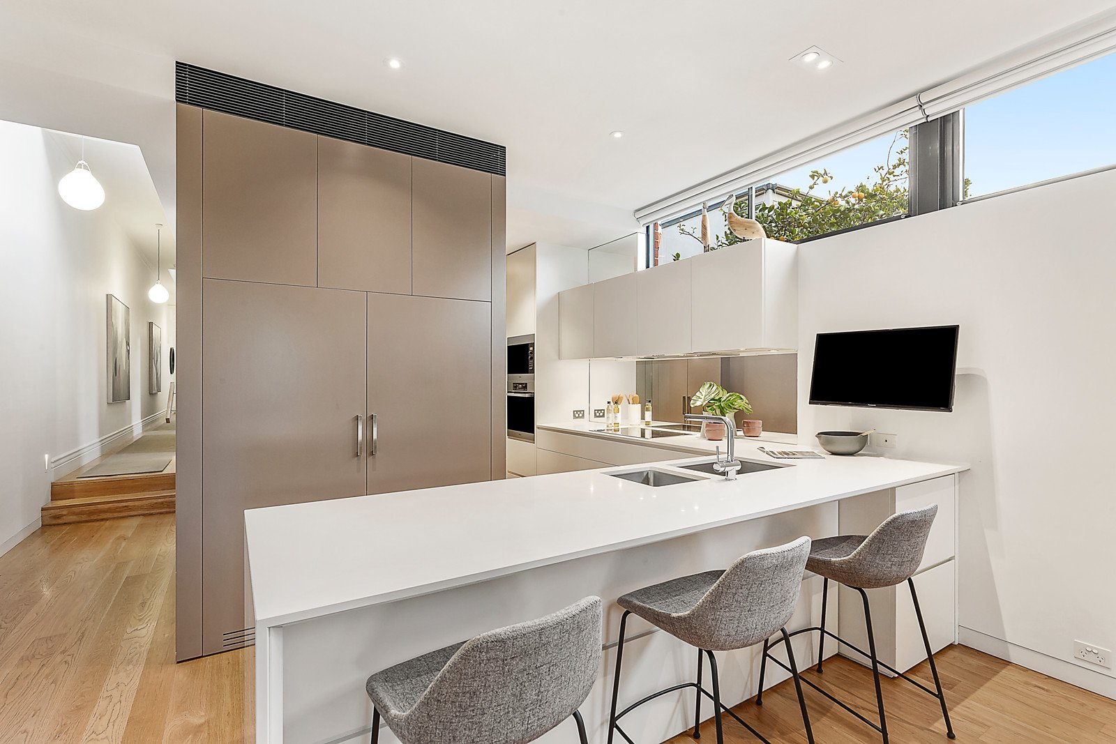 Blending heritage with modern living, this perfectly preserved Edwardian residence blends ornate period detail with a stunning contemporary renovation by Matyas Architects delivering seamless light filled interiors. Perfectly positioned in a tree lined, family orientated locale just steps from Armstrong Street Village and dog-friendly Middle Park Beach, this double brick home has timeless appeal. Introduced by soaring ceilings and timber floors, a sun drenched north facing living and dining area open out into a private alfresco entertaining courtyard enjoying lush garden surrounds and built in barbeque. Illuminated by elevated windows and skylights, a stone bench kitchen showcases Miele appliances including ceramic cooktop and integrated dishwasher, plus integrated fridge and freezer with cleverly appointed storage throughout.