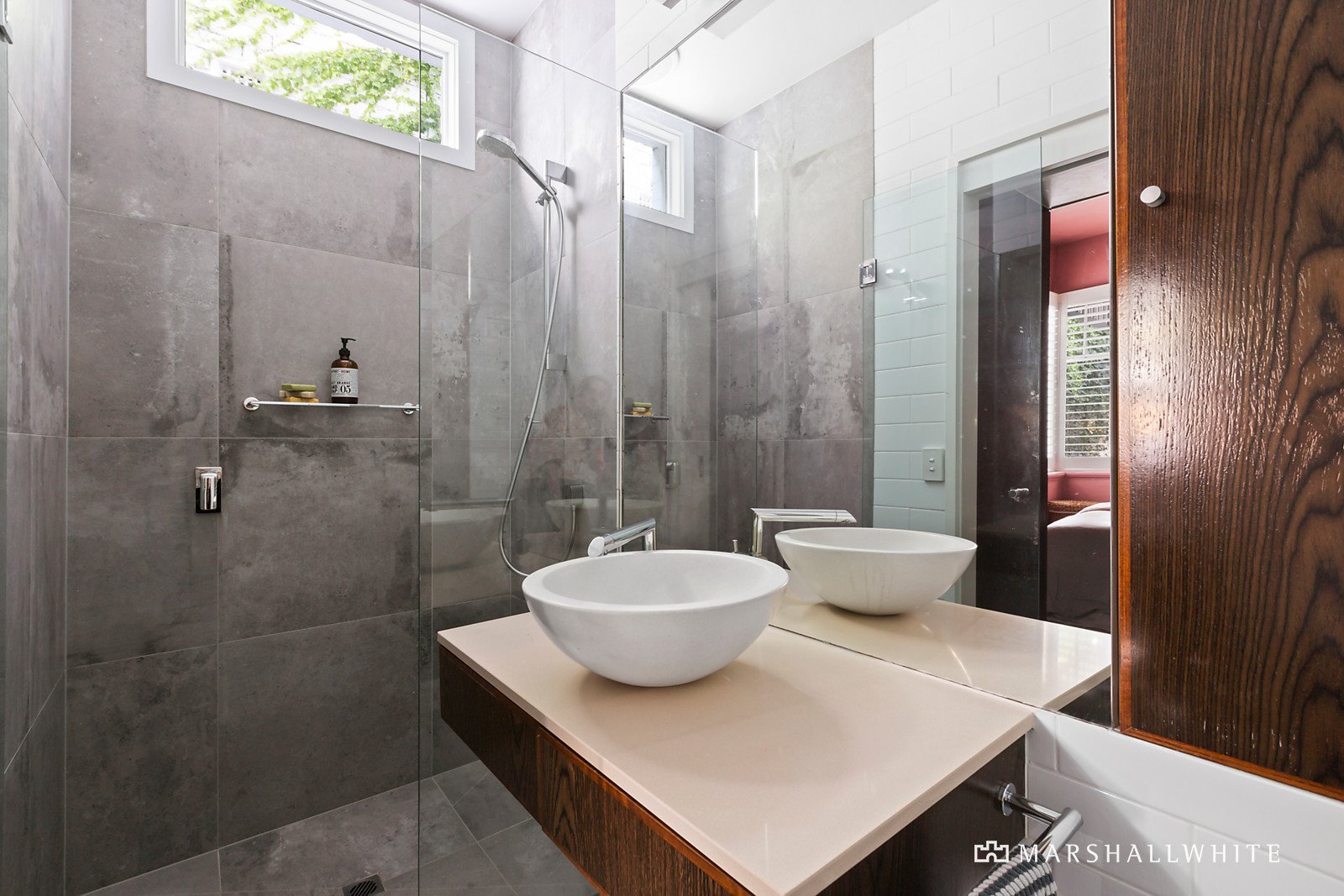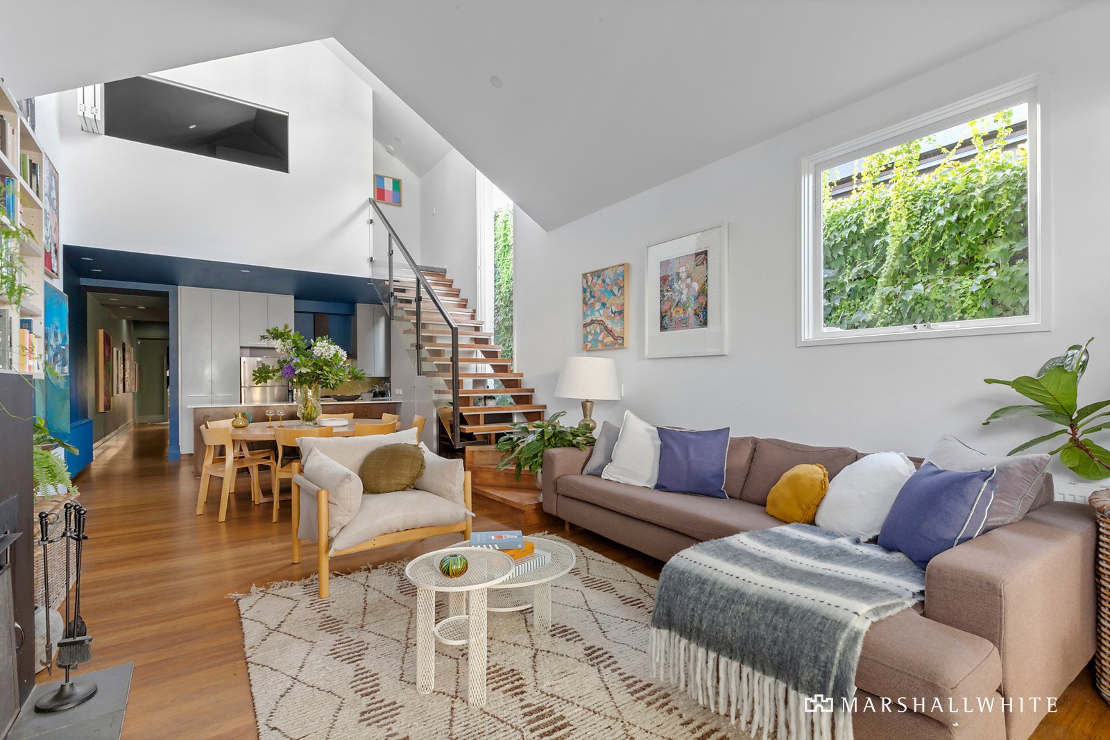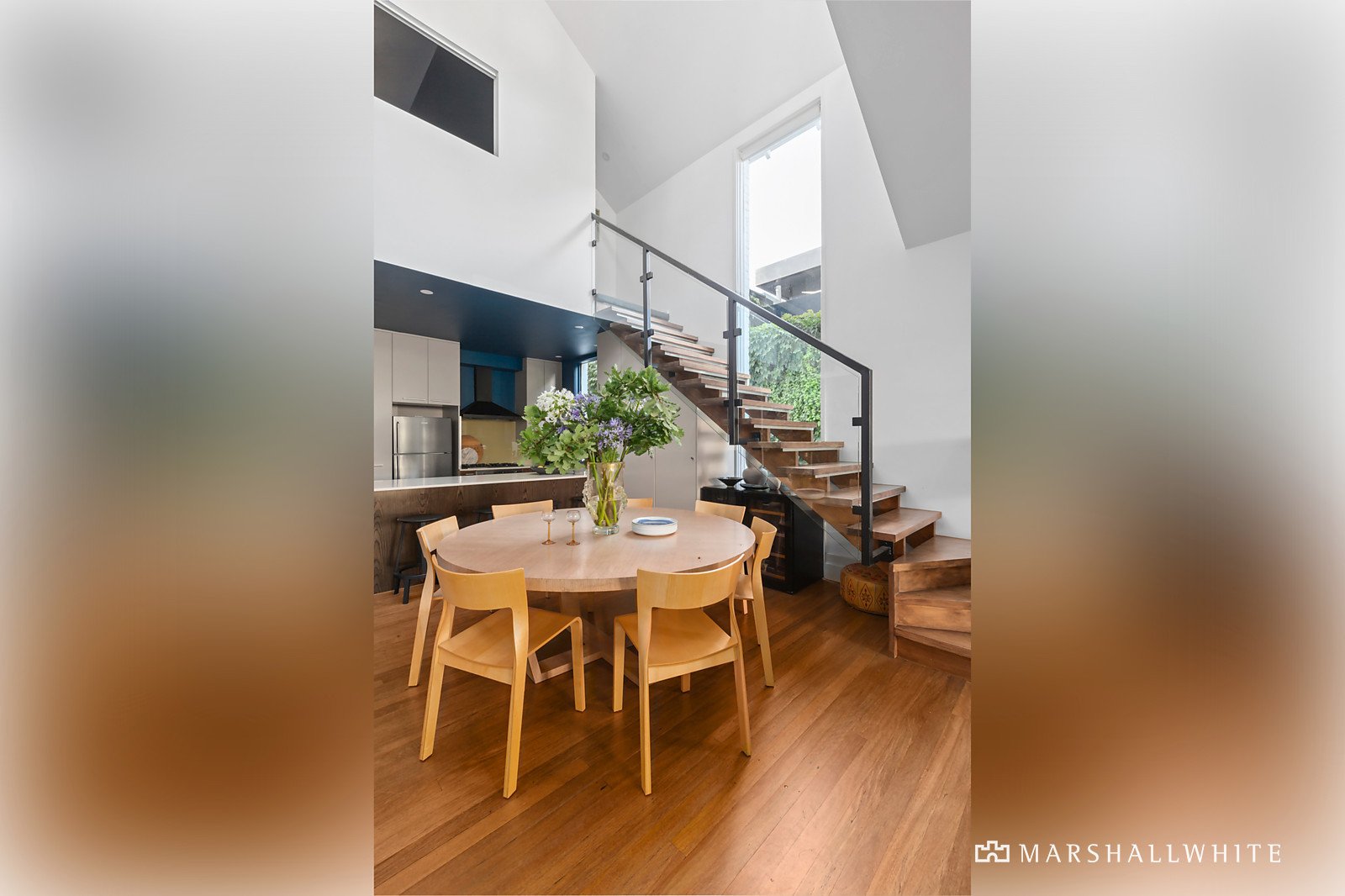 Timber floors and high ceilings are highlighted through the L-shaped hallway which flows through to an expansive open plan living and dining room beneath a soaring vaulted ceiling and void. Bathed in northern light, the living space features an open fire and gourmet kitchen boasting stone benches and Smeg/Bosch appliances. Bi-fold doors open completely to the beautiful northeast garden with large deck and built in seating under a magnificent leafy canopy. Downstairs features two bedrooms with built in robes - one with a designer ensuite, a stylish bathroom with separate powder-room while upstairs there is the main bedroom with walk in robe and stunning ensuite.