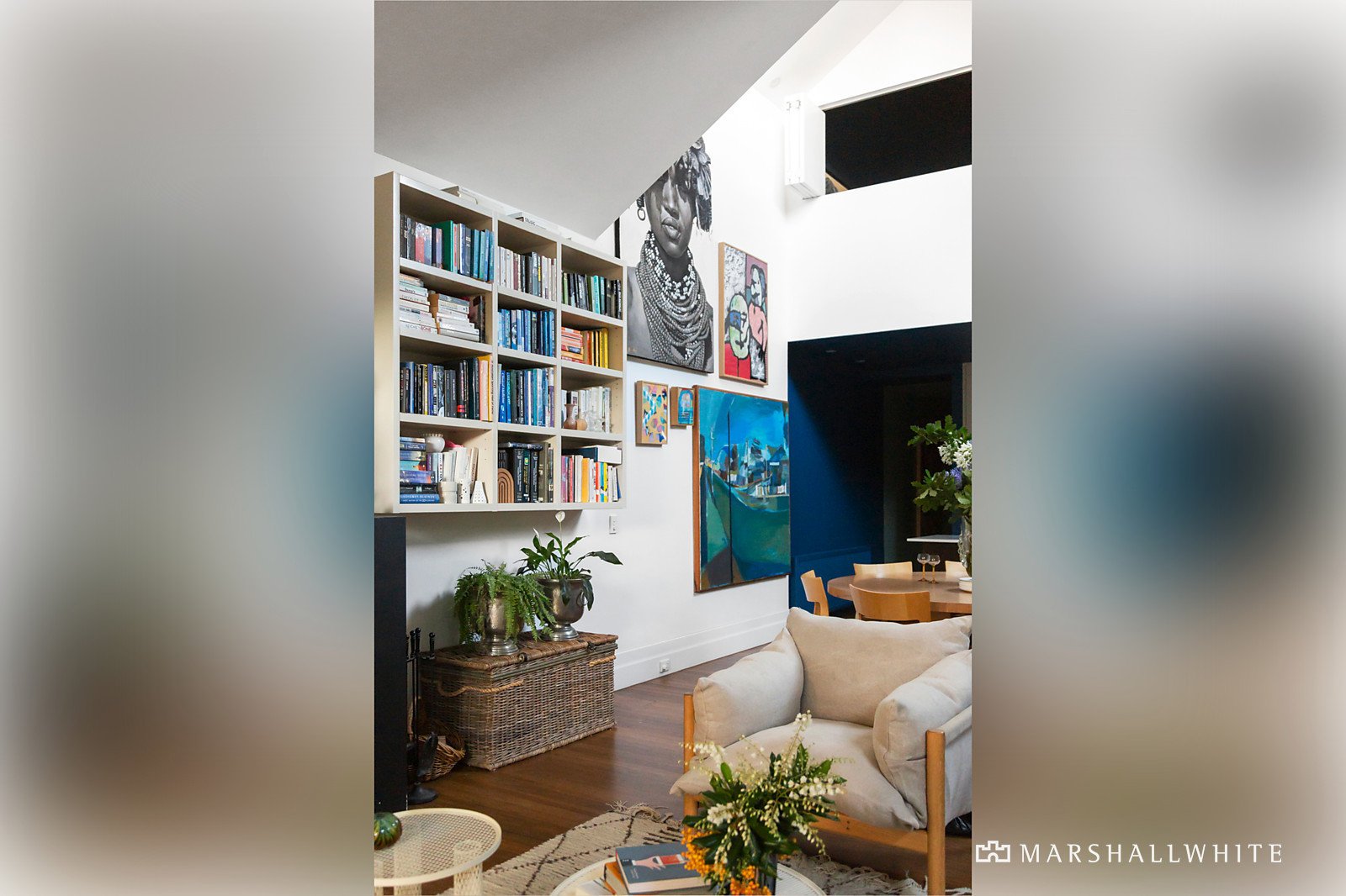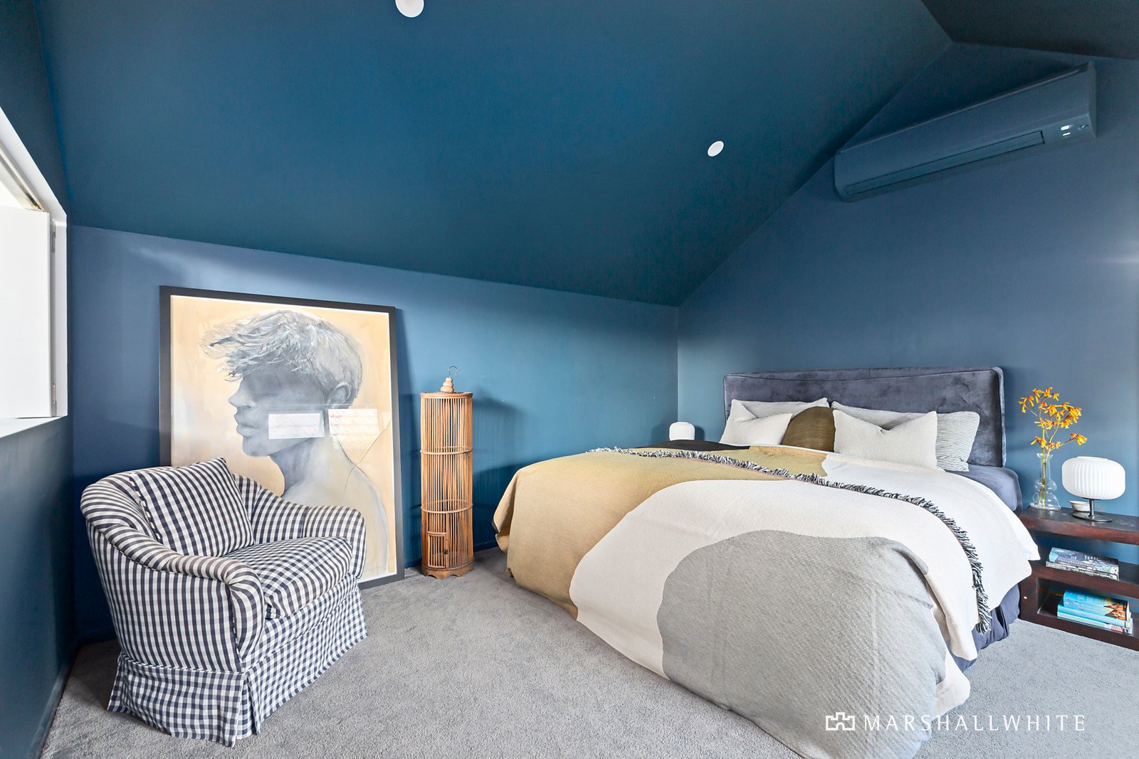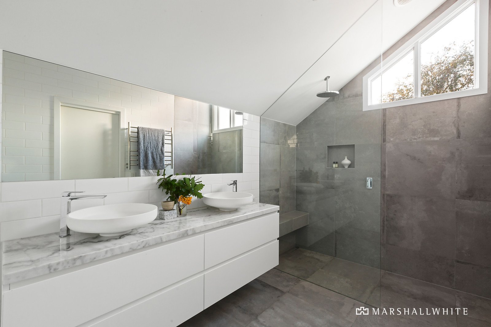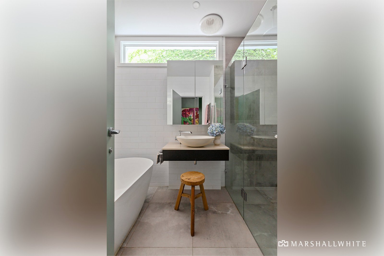 Timber floors and high ceilings are highlighted through the L-shaped hallway which flows through to an expansive open plan living and dining room beneath a soaring vaulted ceiling and void. Bathed in northern light, the living space features an open fire and gourmet kitchen boasting stone benches and Smeg/Bosch appliances. Bi-fold doors open completely to the beautiful northeast garden with large deck and built in seating under a magnificent leafy canopy. Downstairs features two bedrooms with built in robes - one with a designer ensuite, a stylish bathroom with separate powder-room while upstairs there is the main bedroom with walk in robe and stunning ensuite.