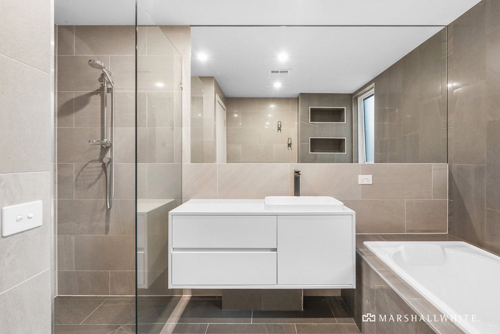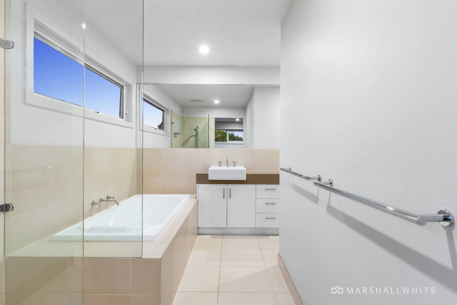 Framing a unique aspect above the moonah trees, the master bedroom offers a walk-in wardrobe and ensuite bathroom complete with a bathtub and walk-in shower. Furthering accommodation, three robed bedrooms share a central contemporary bathroom. Understanding the balance of a coastal lifestyle and increasing desire to work from home, a built-in desk/storage begins in the office continuing across a second living space before the ground level opens to a second alfresco.