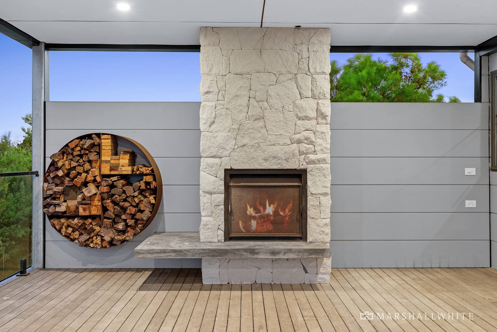 Entering on the upper level an open plan design emphasises vibrant outlooks from every corner whilst a sandstone open fireplace anchors the alfresco, ensuring comfort with strip heating and a ceiling fan. Inside, timber flooring underpins a choice of living/dining space adjoining a kitchen curated for the home cook. Finished in stone surfaces, ample storage, stainless steel appliances and a servery window, the kitchen allows indoor and outdoor spaces to function as one.