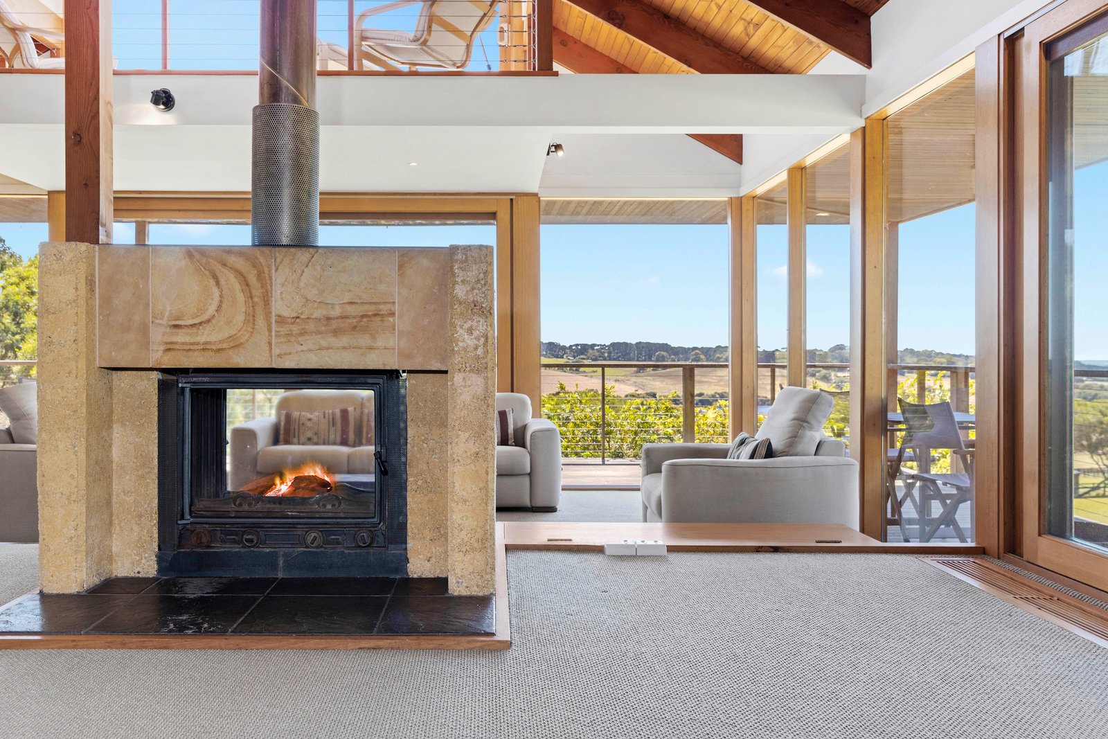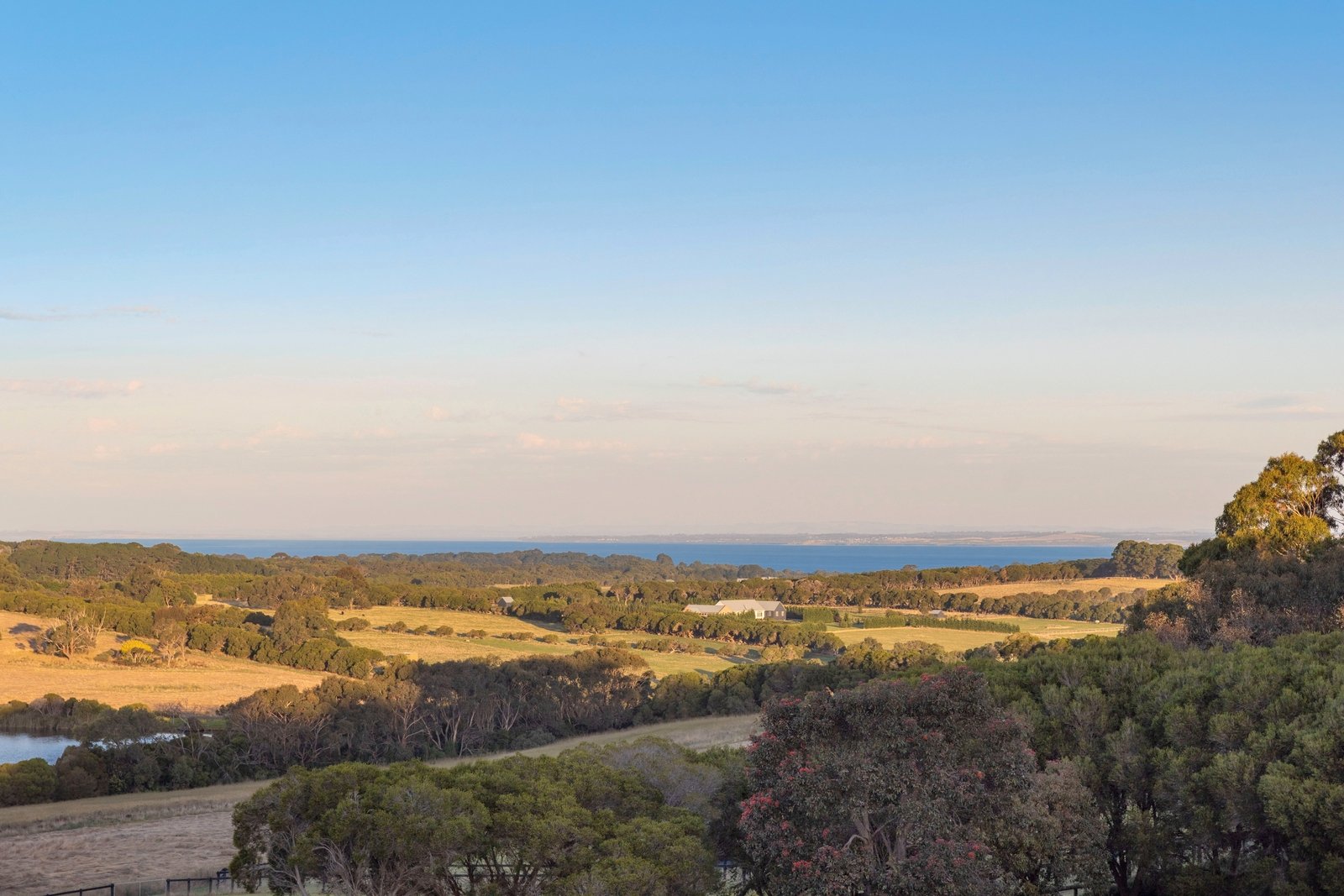 With views from every room over the neighbouring spring-fed dam to Phillip Island beyond, the layout welcomes a two-bedroom guest wing with a bathroom and study/4th bedroom on entry. The main wing hosts the primary suite with an ensuite and walk-in robe, offering the perfect refuge amongst a hydrangea garden, bay scenes and the glow of a pot belly stove/heater. An open-plan domain takes centre stage, where high-raked ceilings allow for a viewing platform/sitting room high above the sunken lounge, perfect for taking in the sunrise and moonrise over the water.