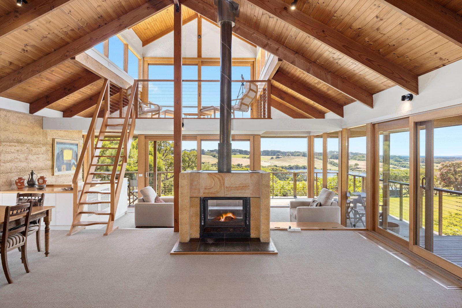 Originally designed by Architect John Baird, the superbly crafted angles utilise the summer and winter sun, showcasing the unique connection between architecture and nature, with Baird’s influence evident in the use of eco-friendly materials and seamless integration with the surrounding landscape. More recently, an extension by Architect Russell Barrett has emphasised the design, opening up the floor plan to maximise the views and utilising the thermal qualities of rammed earth and double glazing.