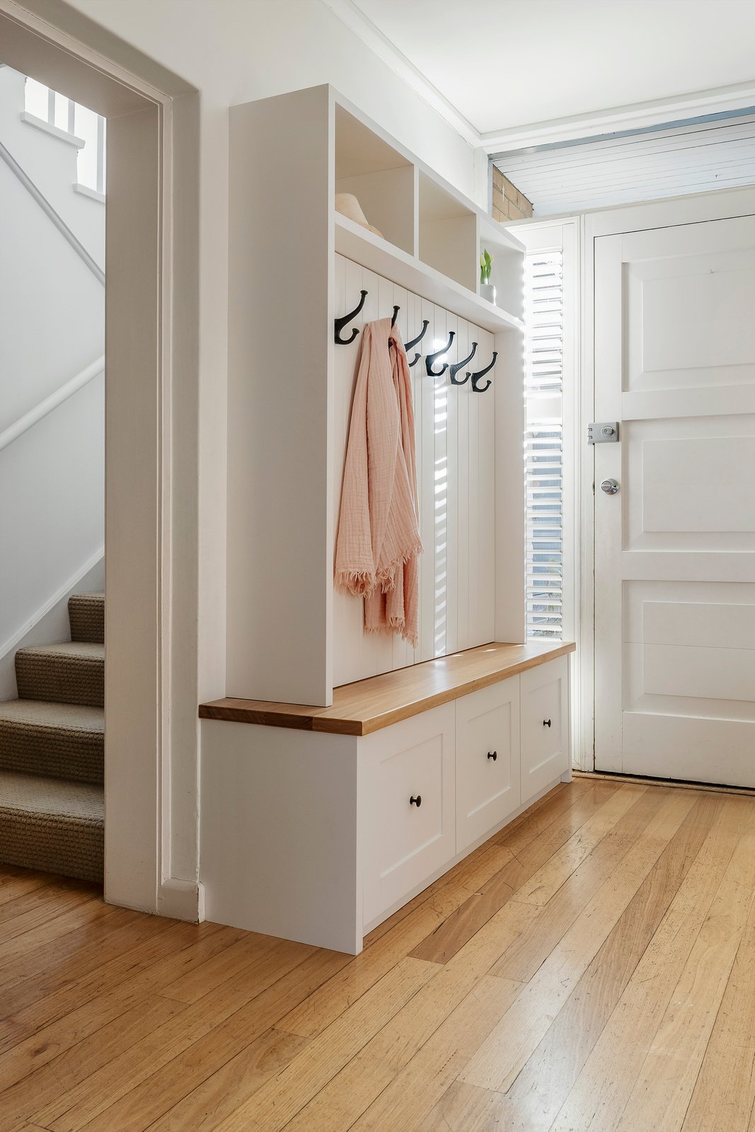 Central to the house is a large open plan kitchen/ dining/ living area that is warmed by a working fireplace and flows to a glorious deck overlooking a garden with vege patch, cubby house, and the leafy park behind. A vast stone island bench creates a welcoming focal point perfect for the before-school rush or an evening drink, while the carefully planned kitchen offers generous space for food preparation and entertaining with two stainless steel dish drawers, an under bench Vintec wine fridge and Bosch coffee maker. An office/ study adds to the open space but can be closed off for privacy when necessary – highlighting the home’s extraordinary ability to create zones that are usable.