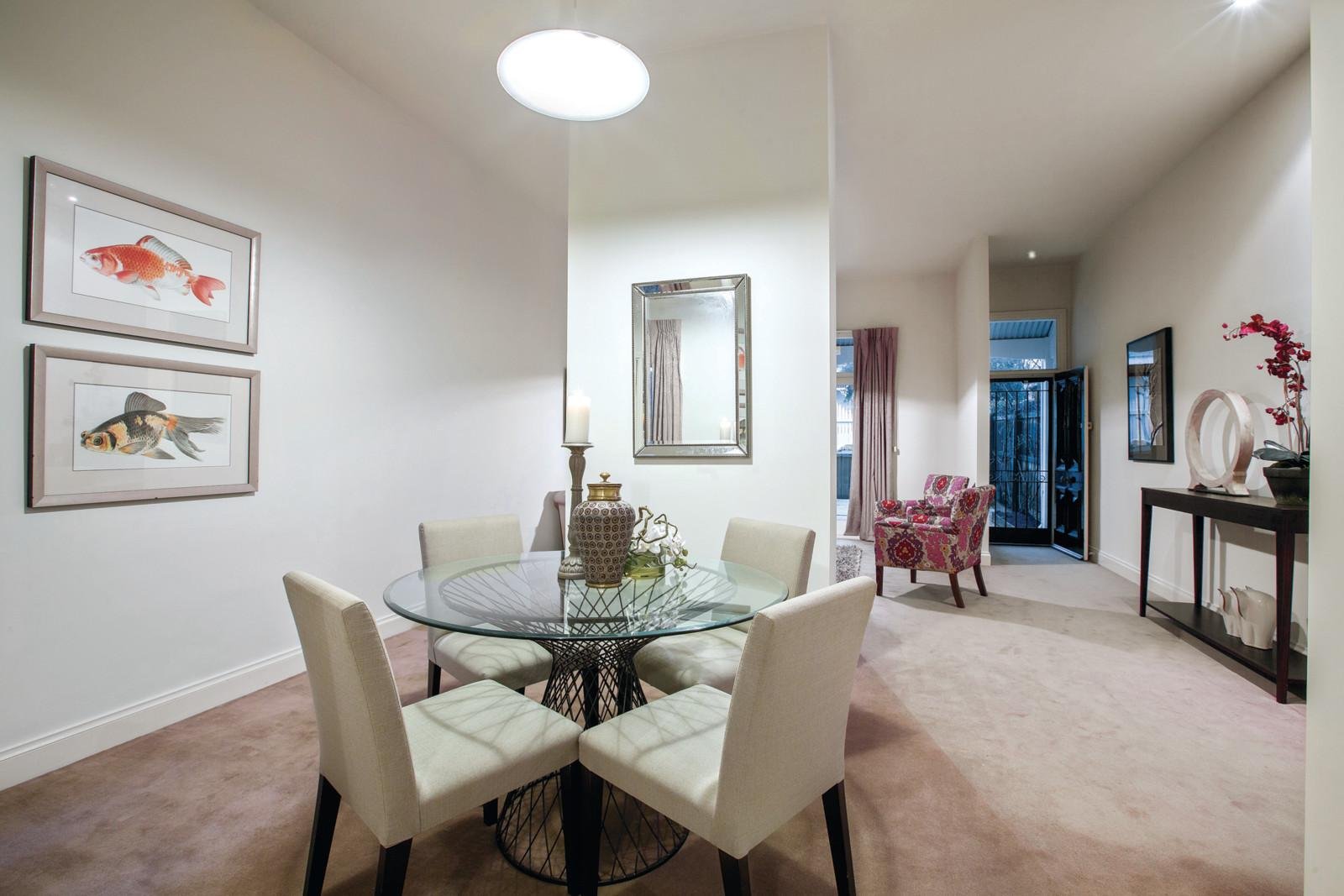 Distinguished by high ornate ceilings and an open fireplace, the elegant sitting room, adjacent formal dining and a connecting fitted study provide an inviting entertaining space that extends out to the private front courtyard. The sleek modern kitchen featuring stone benches and Euro oven and casual living and dining room open out to a deep northwest garden featuring extensive decking and paving. A downstairs bedroom with built in robes and bathroom is complemented upstairs by two beautiful double bedrooms with vaulted ceilings, a balcony enjoying city glimpses and bathroom with spa bath.