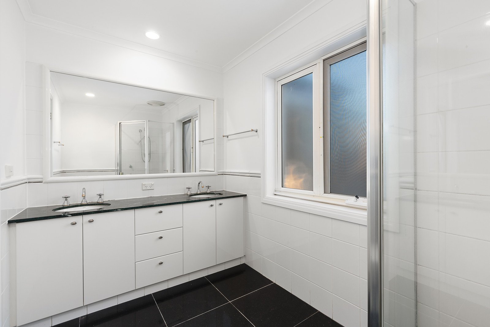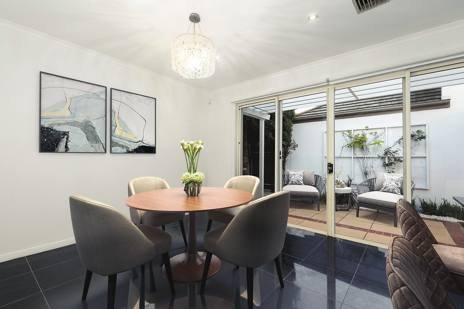 Northern light streams through the impressively spacious living and dining room while black granite tiles flow through the gourmet kitchen and adjacent family room. Glass sliders open the living areas to a large private west facing paved courtyard with covered entertaining terrace or carport. An expansive main bedroom with built in robe, en suite and north balcony offering city views is matched by two equally generous bedrooms with built in robes and a second bathroom.