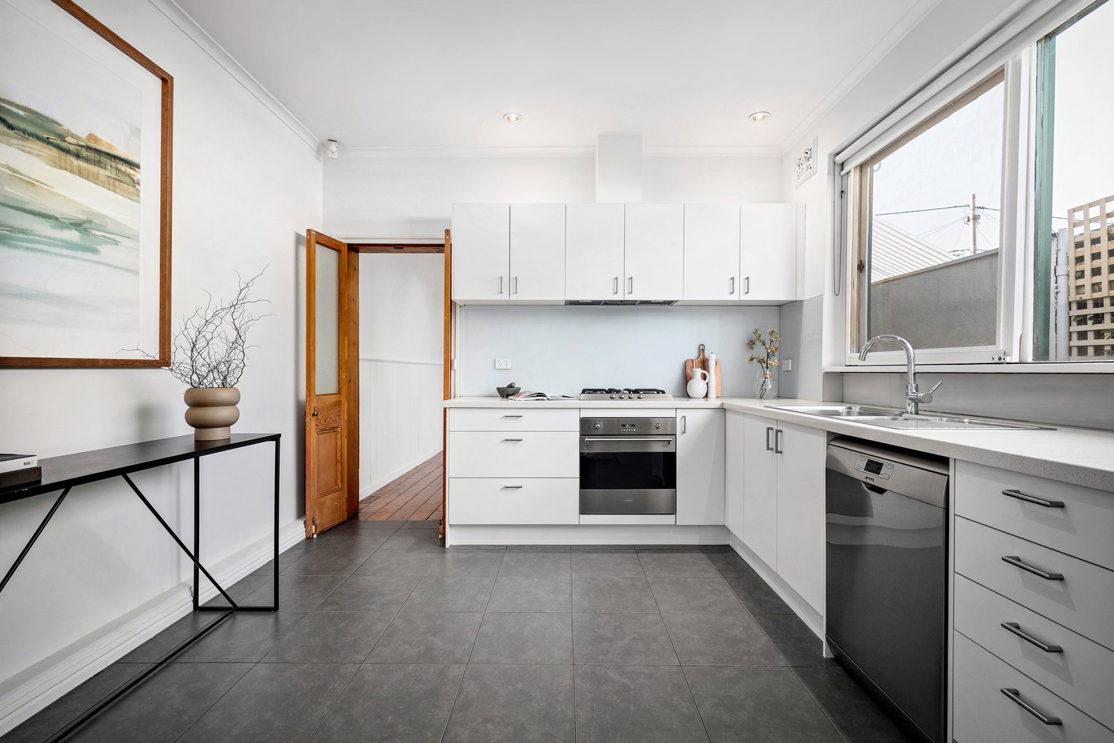 The kitchen with stainless steel appliances and stone benchtops provides modern ease, following the living room with an open fireplace and a casual meals area to the red brick rear terrace, the perfect spot for alfresco dining, bordered by low-maintenance greenery. A rear bathroom and large laundry with WC add to the appeal, as does hydronic heating, excellent storage space and rear pedestrian access to the ROW.