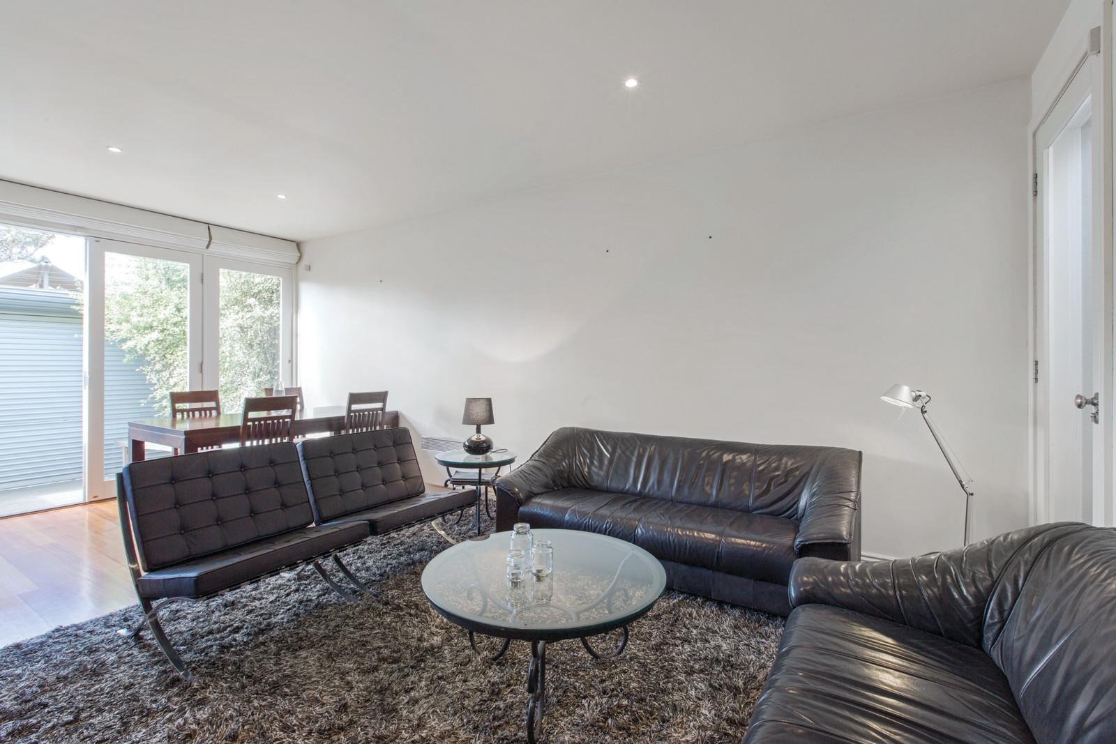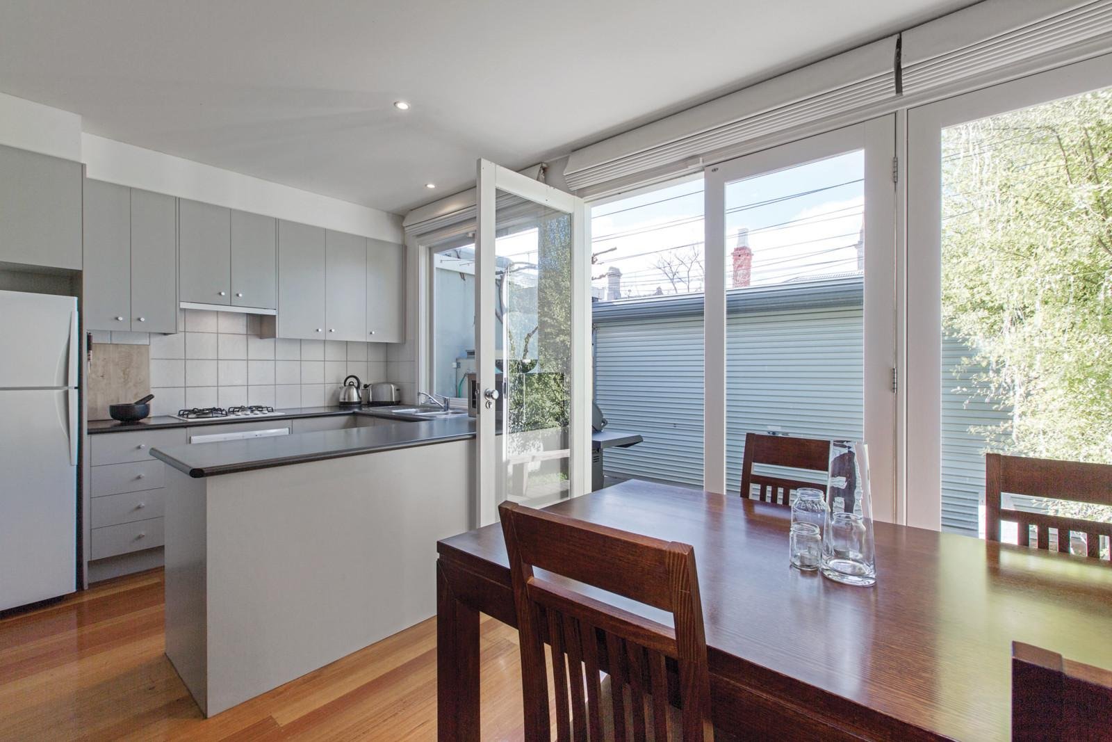 High ceilings and timber floors define the entrance hall, main bedroom with OFP, second bedroom with built in robes and a bright modern bathroom. The generous living room, light-filled dining area and smart Bosch equipped kitchen open to a private northeast courtyard with roller door access to rear right of way.