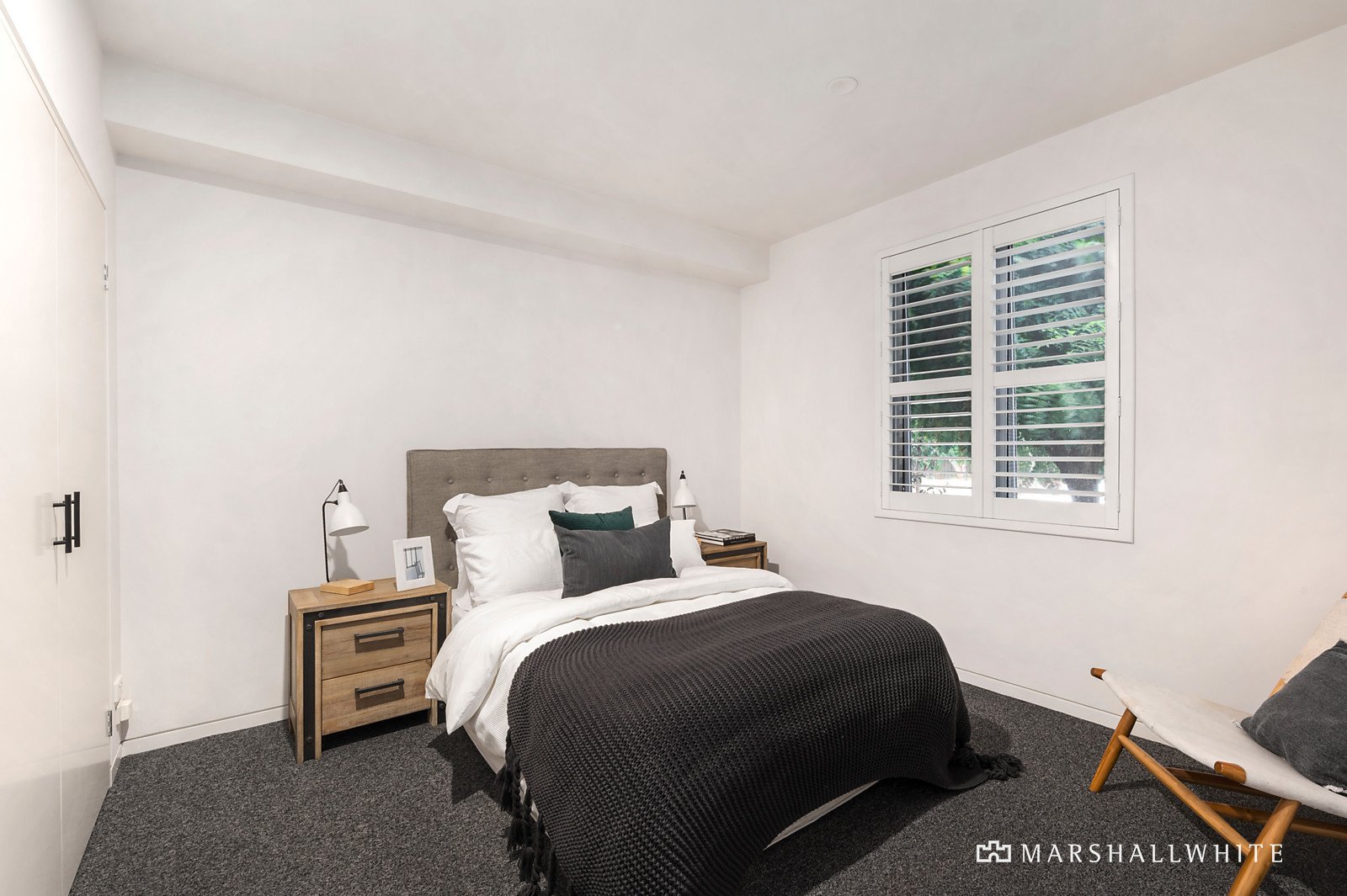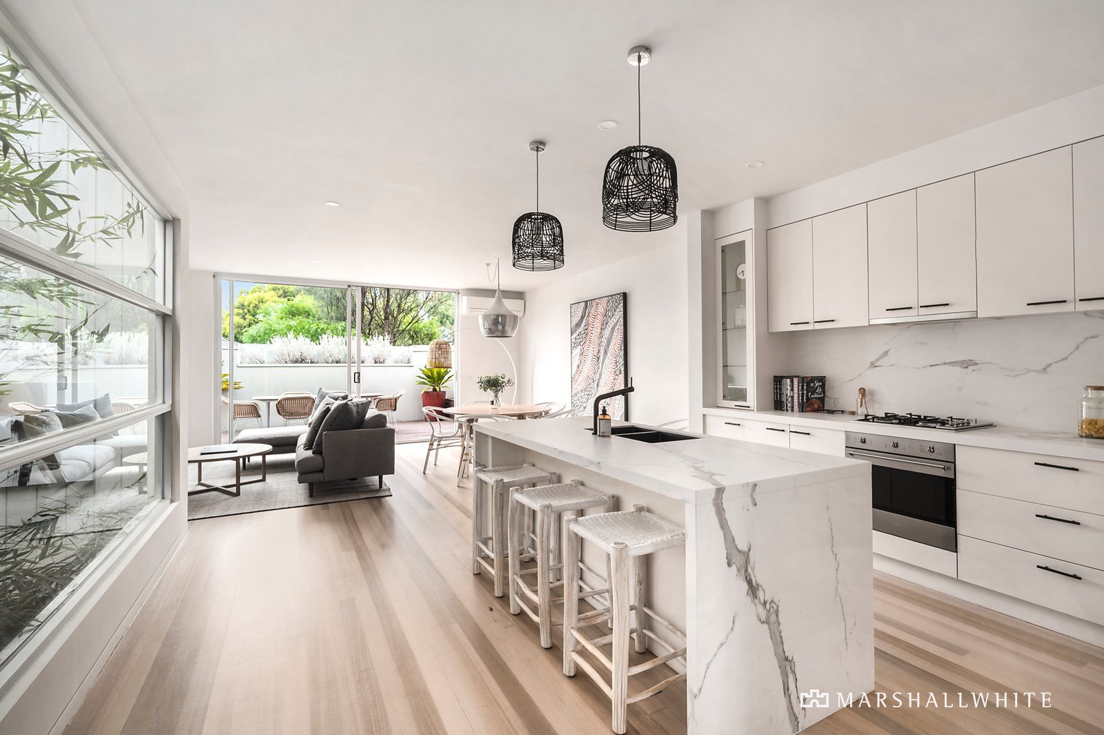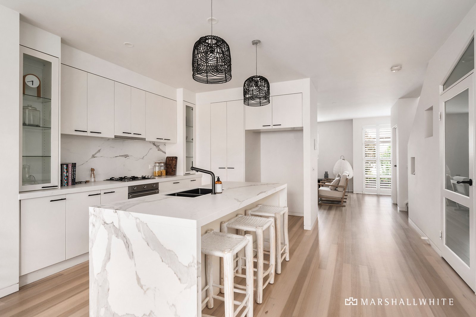 Limed timber floors and a light-well accentuate the sense of light in the exceptionally generous open plan living and dining spaces with a superb gourmet kitchen boasting Smeg/Bosch appliances and stone benches. The living area extends out through full height glass sliders to a large north-facing entertaining deck shaded by a remote sun awning. The main bedroom with walk in robe and stylish en suite/bathroom is accompanied by a second bedroom with robes and skylit study, while on the ground level there are two additional bedrooms with robes, a designer bathroom, courtyard and double garage.