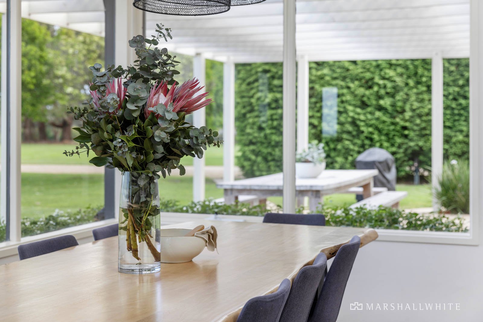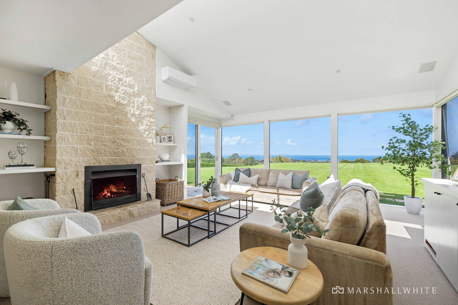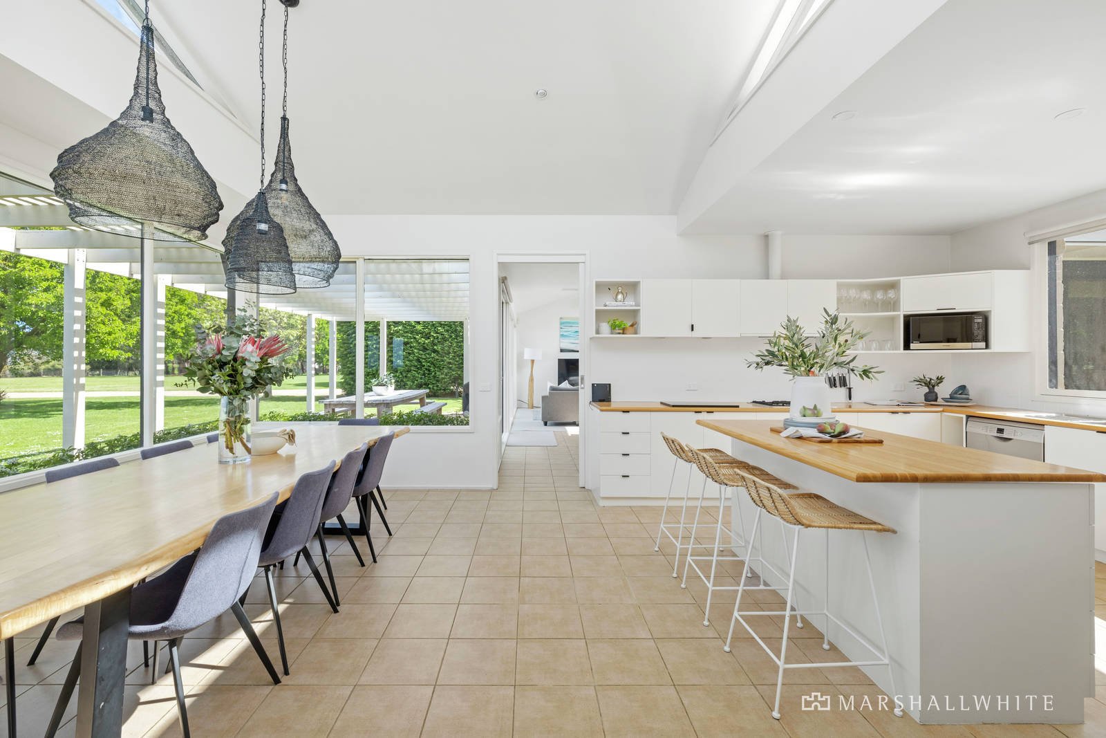Contemporary and calming, the two homes exude privacy yet exist in perfect harmony, with earthy tones flowing from their brick and glass facades to light-letting interiors that highlight the postcard surroundings. Designed with family living in mind, the main four-bedroom home boasts three separate living areas, including the formal lounge with an open fireplace, flowing into the central kitchen zone at its heart. Timeless in design, it focuses the eye on the distant waves through oversized picture windows and high, vaulted ceilings, emphasising the space and light throughout. Offering an unrivalled setting to relax or host guests is an expansive entertaining terrace to the rear, overlooking the in-ground pool and kids' domain, with an in-ground trampoline and cubby house.