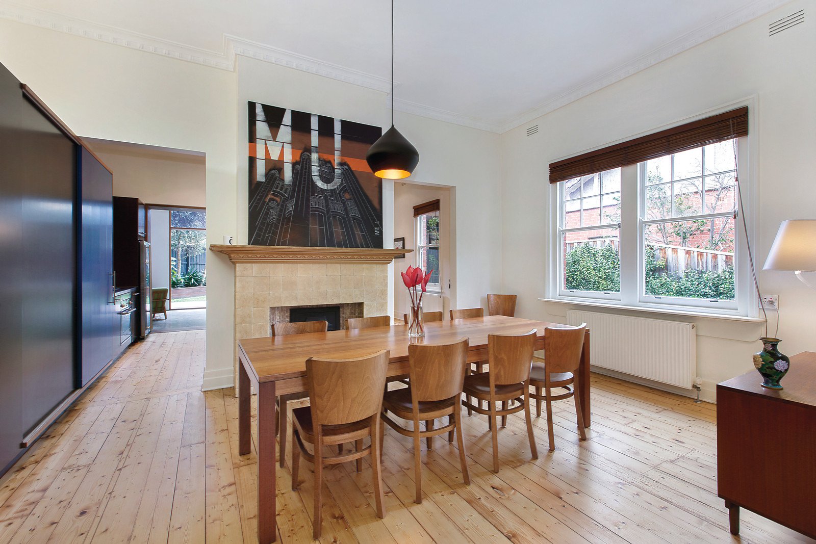 Introduced by a light filled foyer, this spacious domain is highlighted by a range of immaculate period features such as Baltic Pine floors, leadlight windows, hallway arches, high ceilings and fireplaces. Three generous north facing bedrooms bathed in stunning natural light are fitted with built in robes and share two sleek bathrooms with heated towel rails. A spacious study or optional fourth bedroom and zoned dining room with double racked wine cupboard complete the front half of this chic abode. A stylish kitchen with European appliances, copious storage and hand made concrete bench top complements a generous open plan living area featuring polished concrete floors with hydronic heating and Morso cast iron fireplace and flows seamlessly through expansive windows to a picturesque garden with storage shed. Additionally features well appointed laundry, study nook, plentiful storage including attic and ample off street parking.