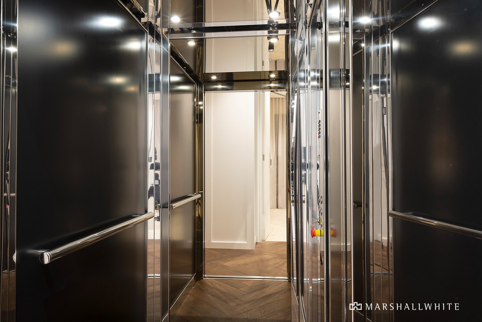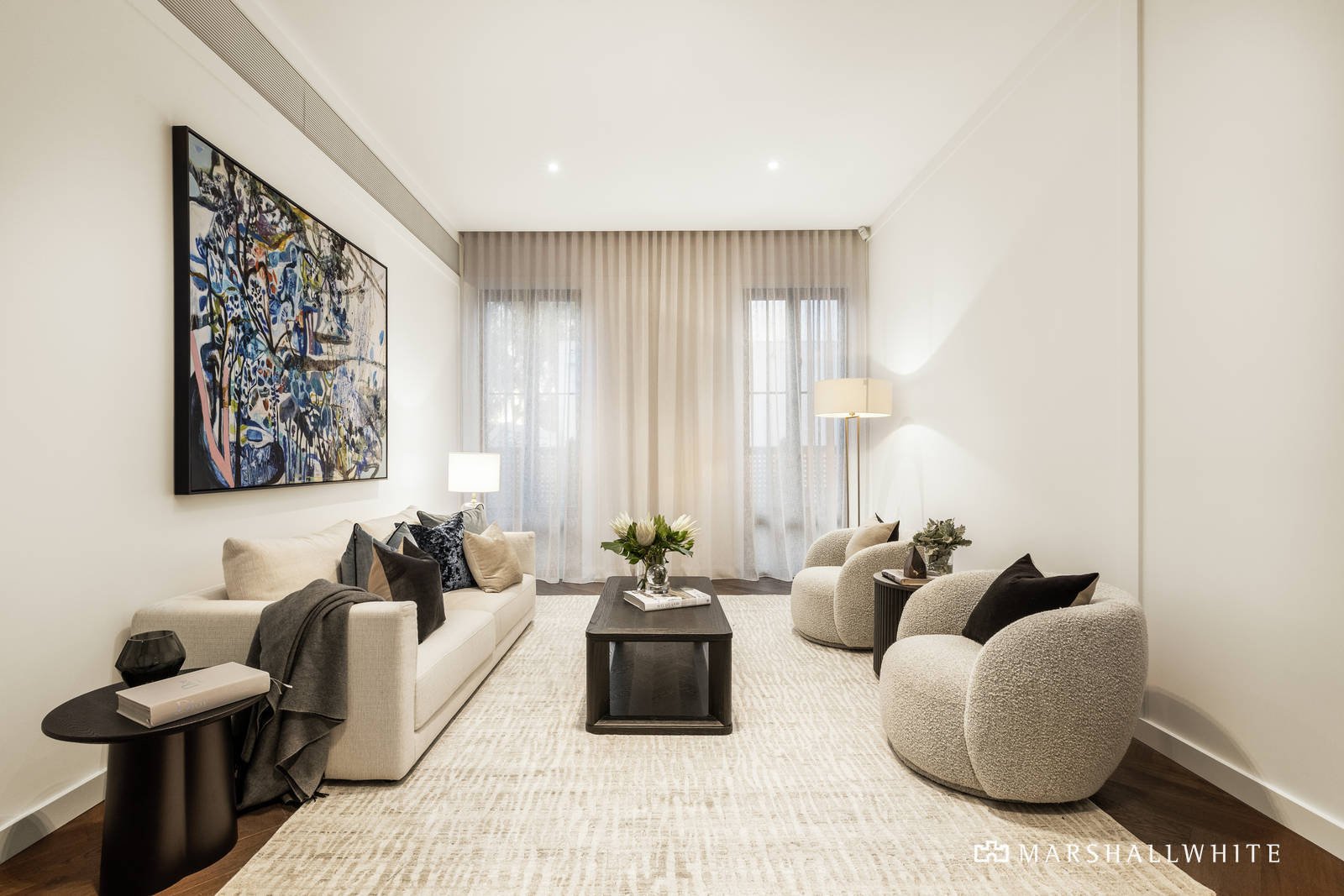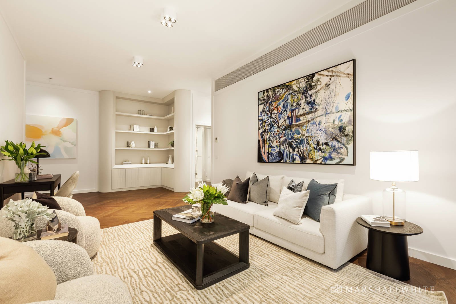 The soaring 3.2m ceilings, curved wall and dark oak parquetry floors make an instant impact in the entrance hall as it flows through to a glamourous sitting room with library shelves and study area and the expansive open plan living and dining room with a bar and gas log fire. The sublime kitchen boasts Tundra Grey marble benches, Miele appliances, integrated fridge/freezer and a butler's pantry. Huge glass sliders open the living to a Vergola covered marble terrace with full BBQ kitchen surrounded by landscaped private hedged gardens. An opulent main bedroom with deluxe his/hers WIRs feature floor to ceiling cabinetry and abut a lavish marble en suite, whilst two additional generous bedrooms each enjoy their own en suites. Both a lift and stairs access the basement laundry, wine cellar and 6 car garage with turntable and room for a gym and work shop.