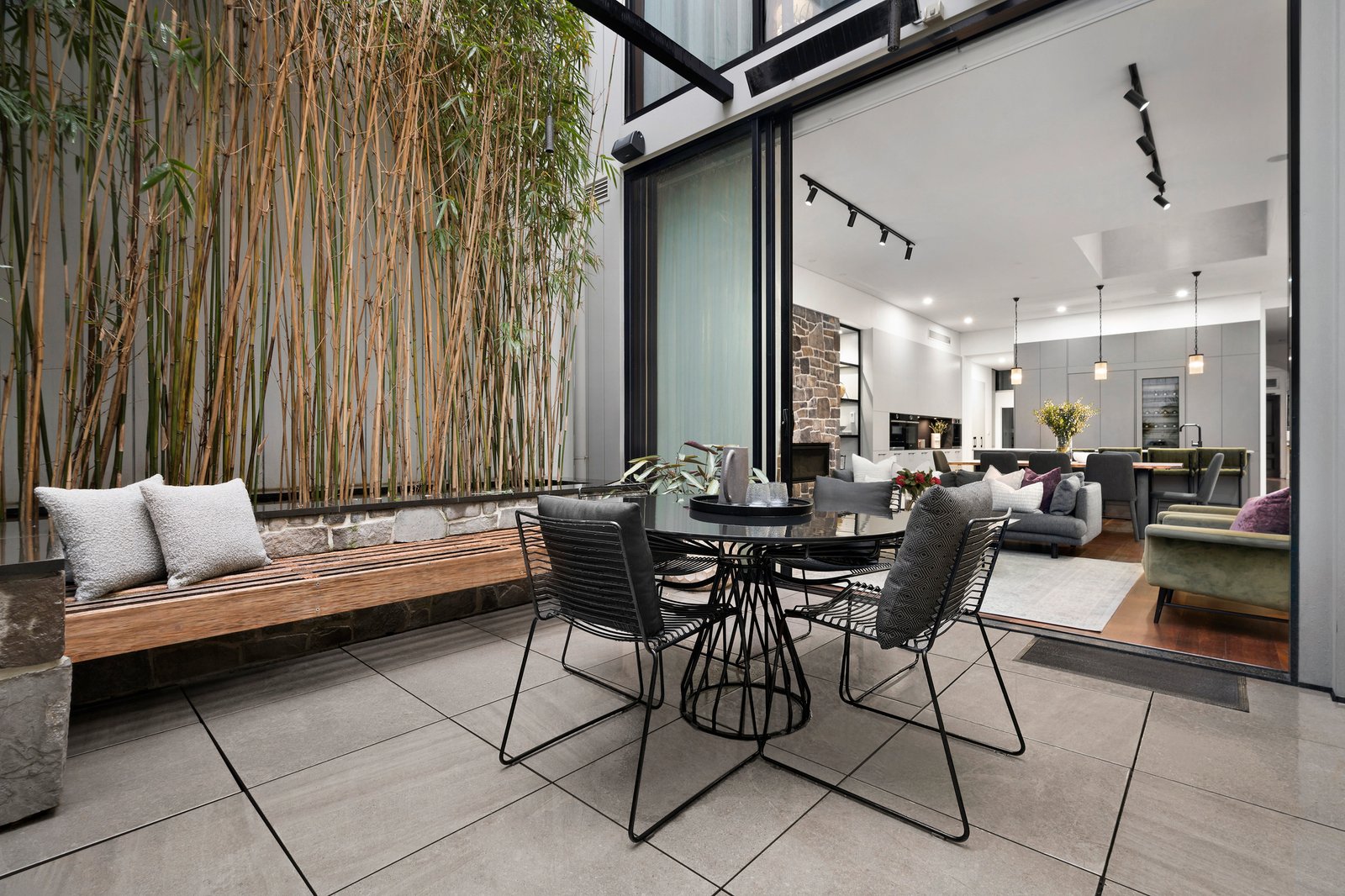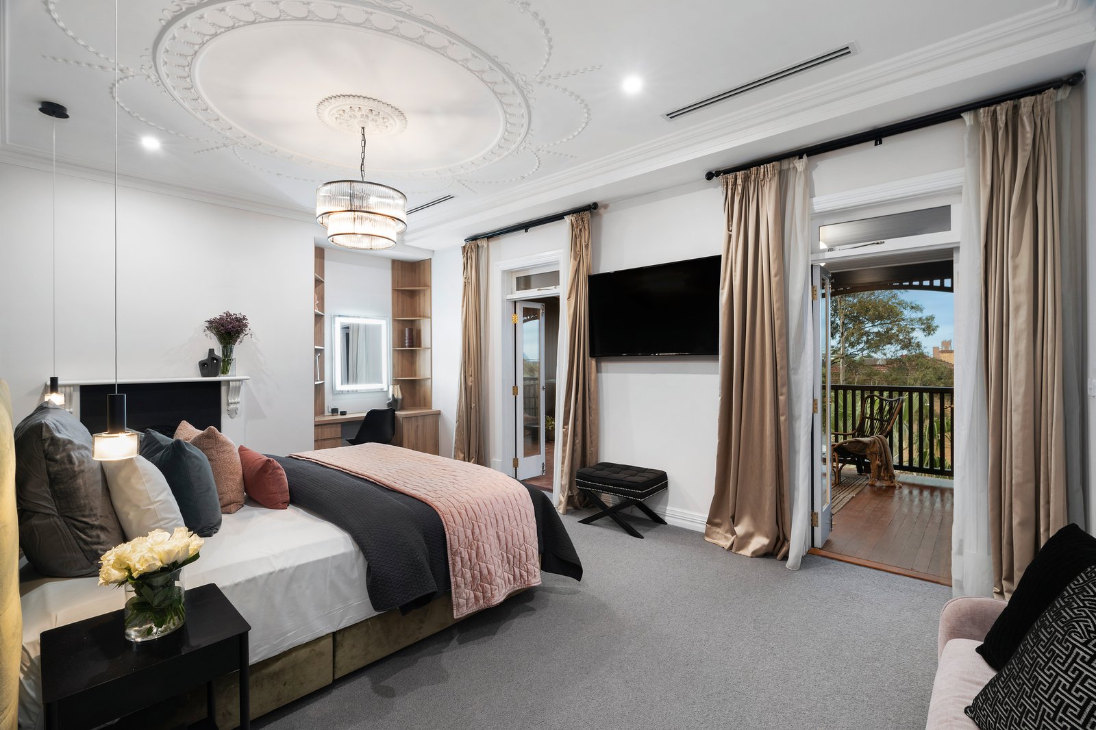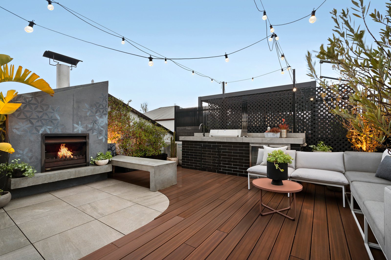 On the first floor, each generously sized bedroom features a private designer ensuite bathroom and custom-fitted robes, including one with direct access to an undercover terrace. Further upstairs, the decadent main level boasts an inviting fireplace and kitchenette, creating a true parents' retreat that extends to a bay-facing balcony, walk-in robe and lavish bathroom with a freestanding bath. At night, the outstanding rooftop terrace, with an open fireplace, sleek concrete seating, and a fully equipped outdoor kitchen, offers the ideal setting for sophisticated entertaining against St Kilda's vibrant streetscape.