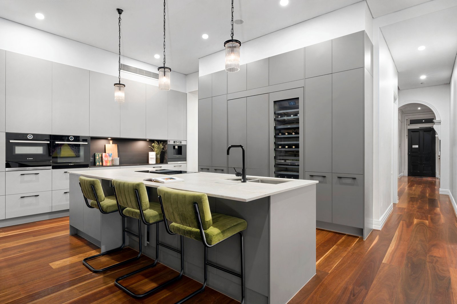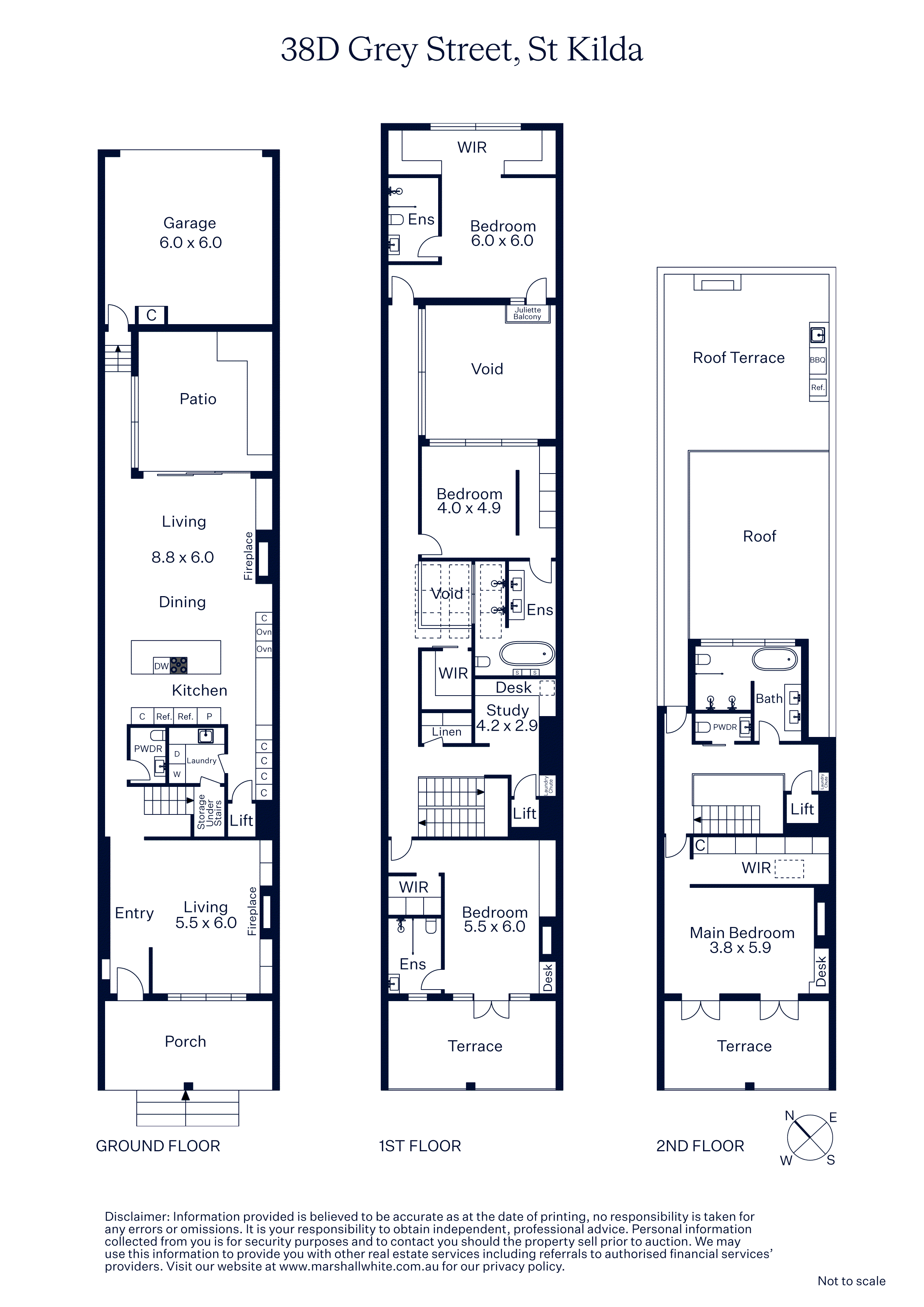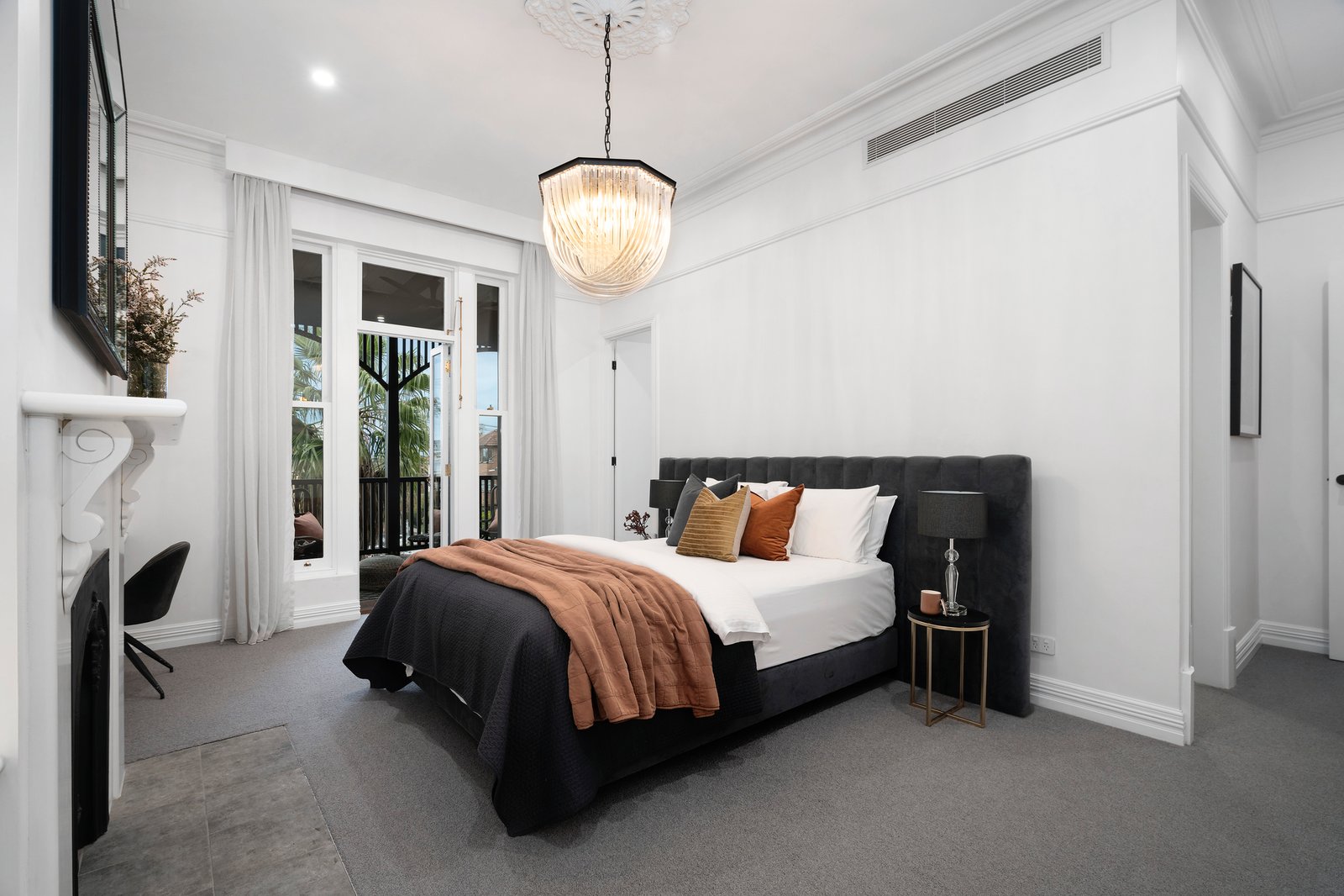 On the first floor, each generously sized bedroom features a private designer ensuite bathroom and custom-fitted robes, including one with direct access to an undercover terrace. Further upstairs, the decadent main level boasts an inviting fireplace and kitchenette, creating a true parents' retreat that extends to a bay-facing balcony, walk-in robe and lavish bathroom with a freestanding bath. At night, the outstanding rooftop terrace, with an open fireplace, sleek concrete seating, and a fully equipped outdoor kitchen, offers the ideal setting for sophisticated entertaining against St Kilda's vibrant streetscape.