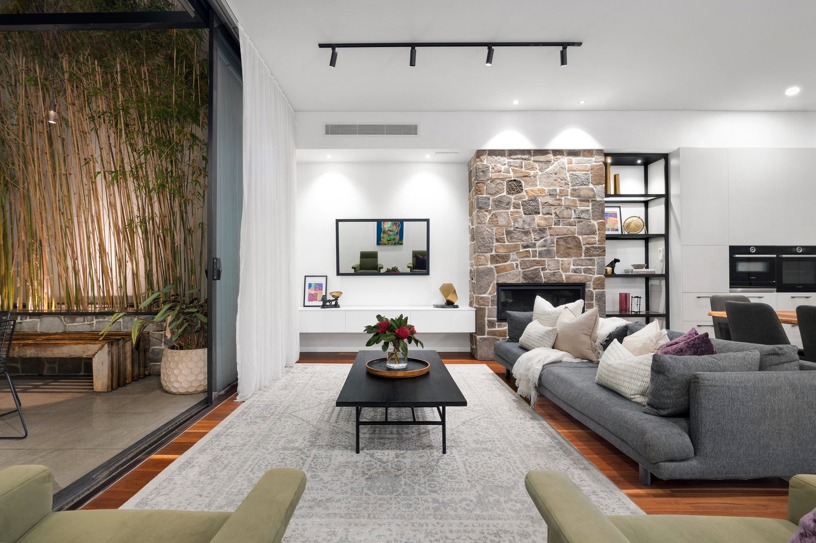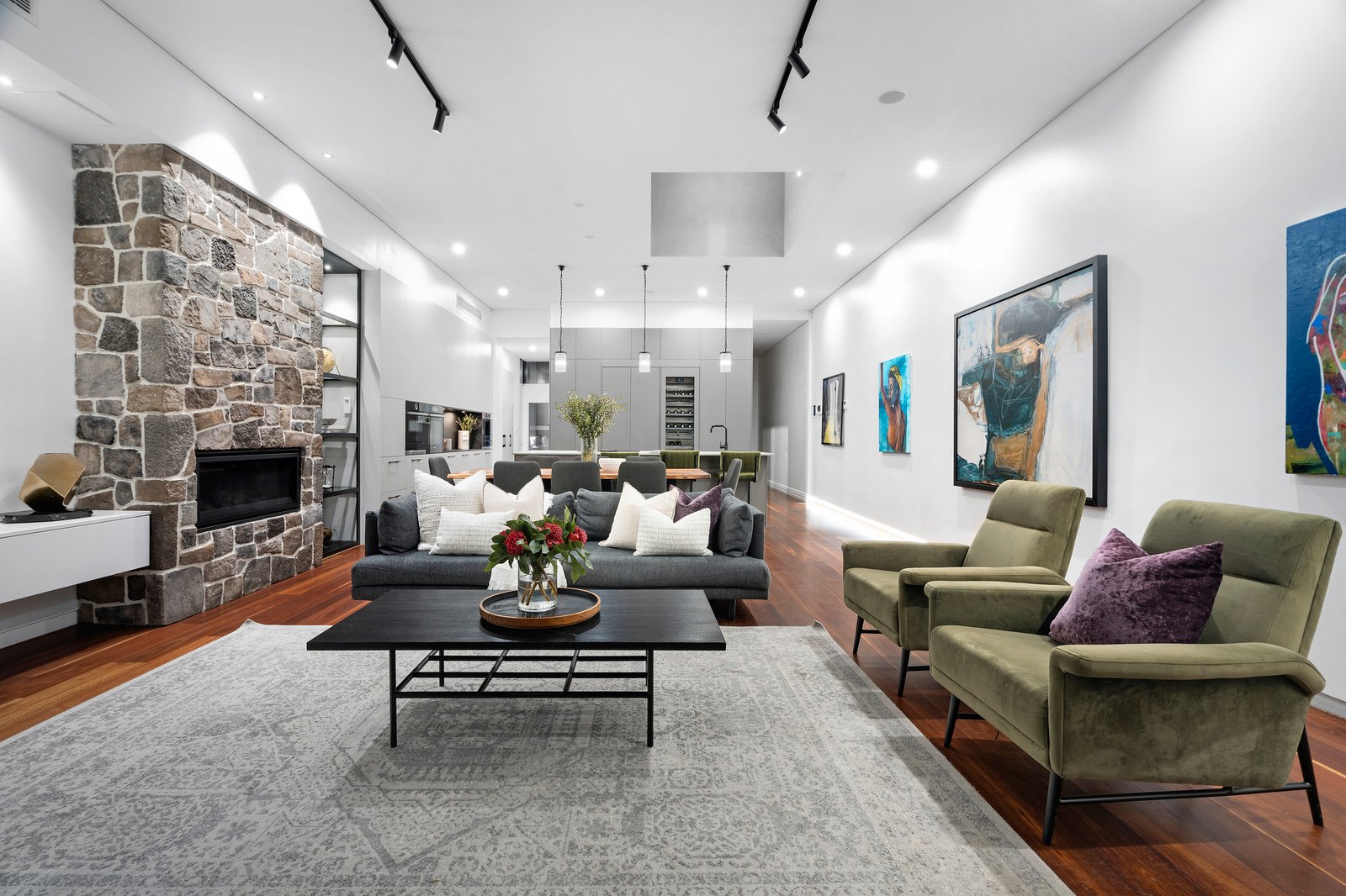 Entirely secure within landscaped terraced gardens, the home's notable facade reveals an interior that embodies style and personality, enriched with gemstone hues that lend an air of sophistication that spans three spectacular, lift-connected levels. Formal living with hardwood floors and OFP precedes the open-plan domain with a stone-stacked fireplace, which extends to the central courtyard terrace through stacked sliding doors. Enriched by low-maintenance landscaping, it's the perfect social hub, complemented by the gourmet stone kitchen, appointed with a Gaggenau fridge/freezer and wine fridge, and a full complement of premium Bosch appliances.